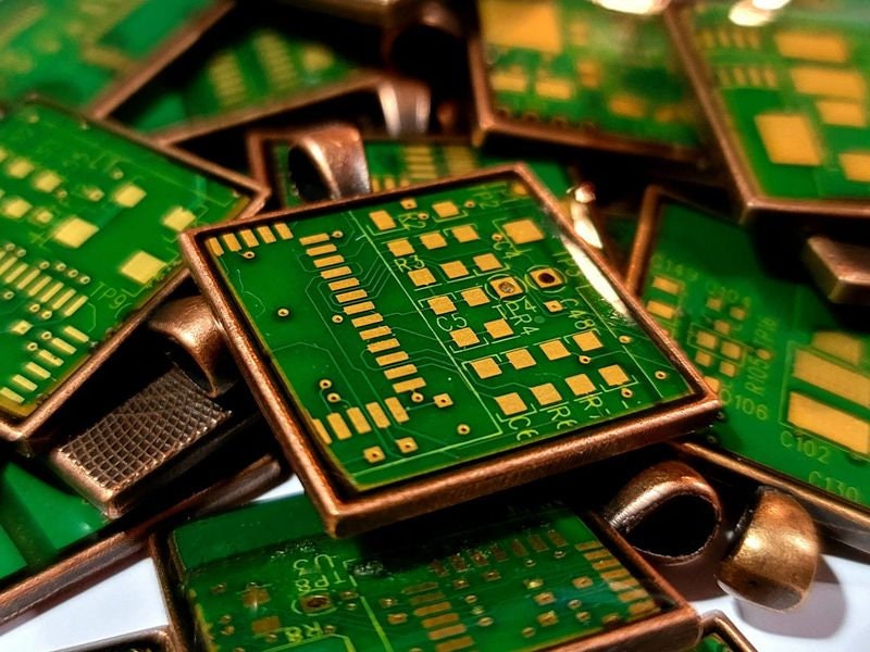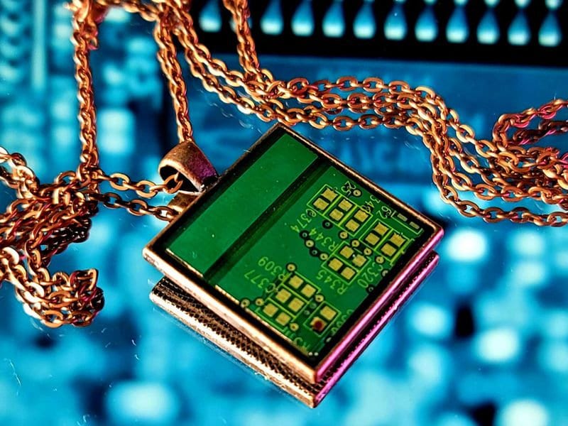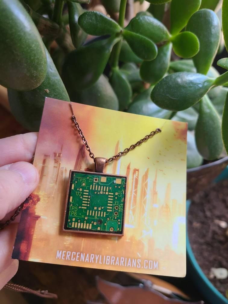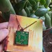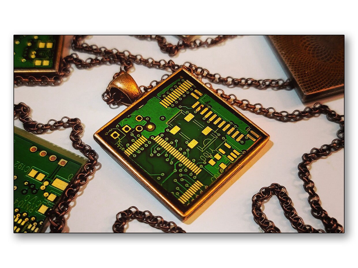 The pendant is made from recycled circut boards covered in resin, set in a copper-plated tray with a copper-plated chain.