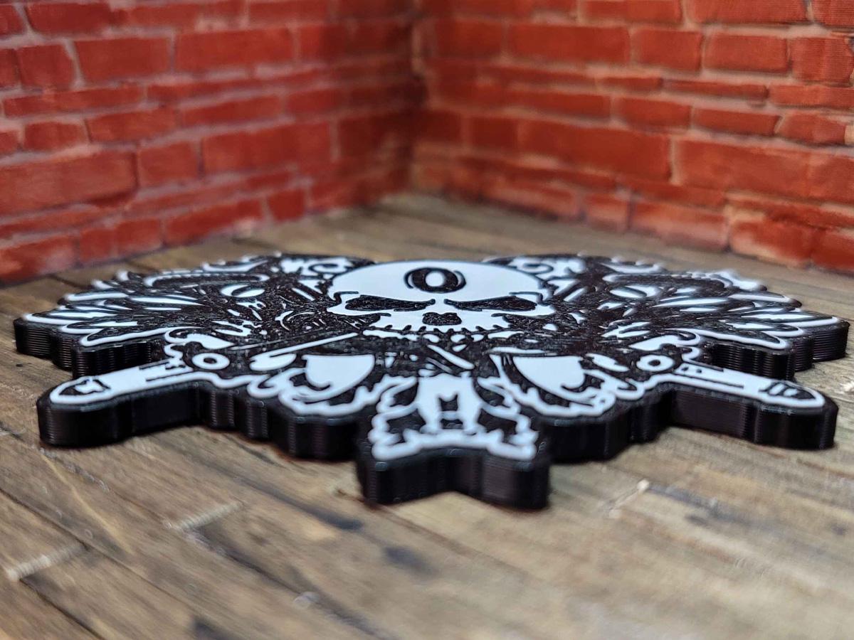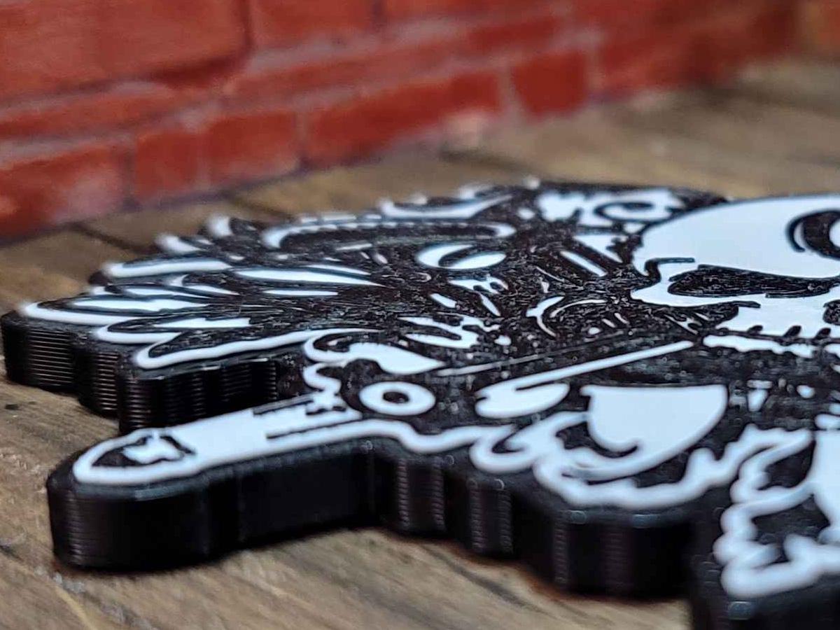 3d printed with love by Kit Rocha, these magnets sport a black base, a white logo background, and the logo itself in black. Three powerful 15mm x 2mm magnets are embedded inside them, letting them stick strongly to your favorite metal surface!