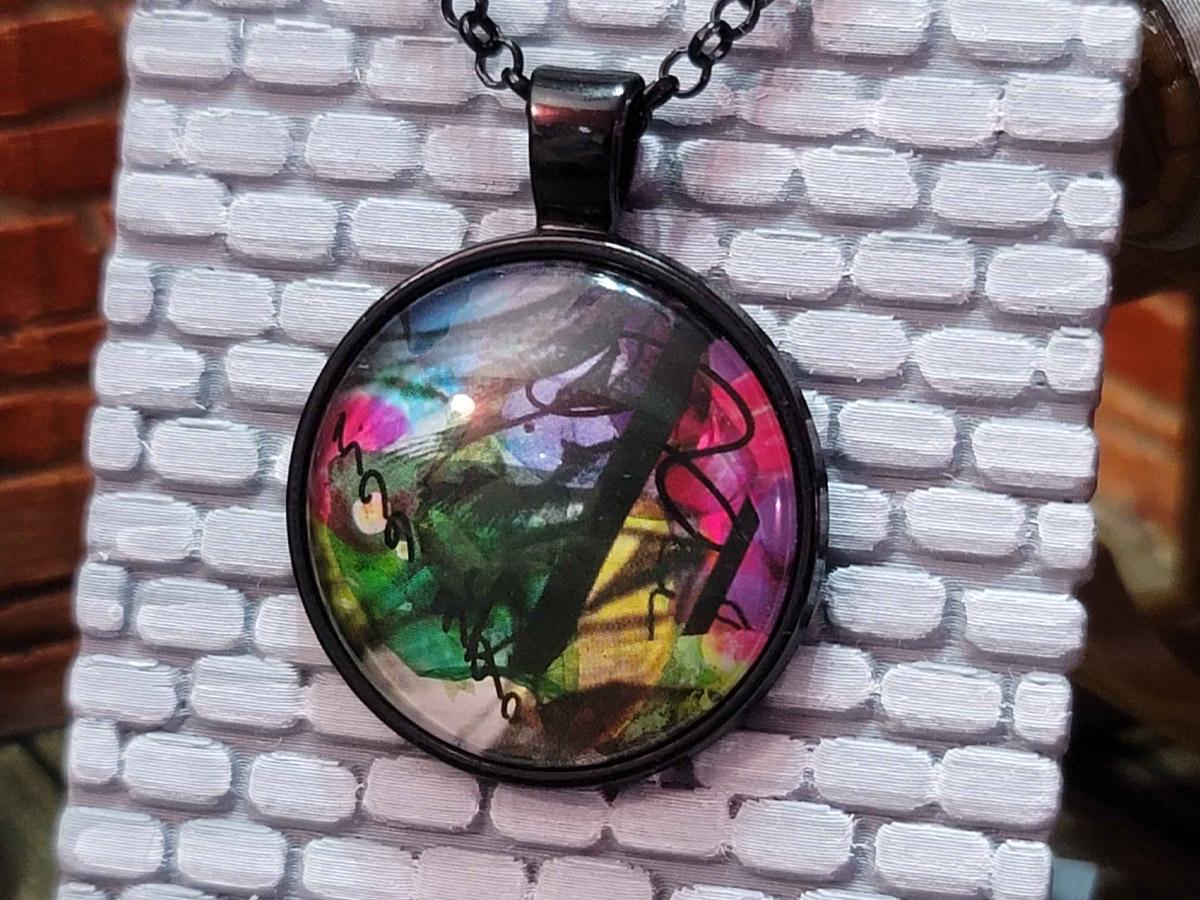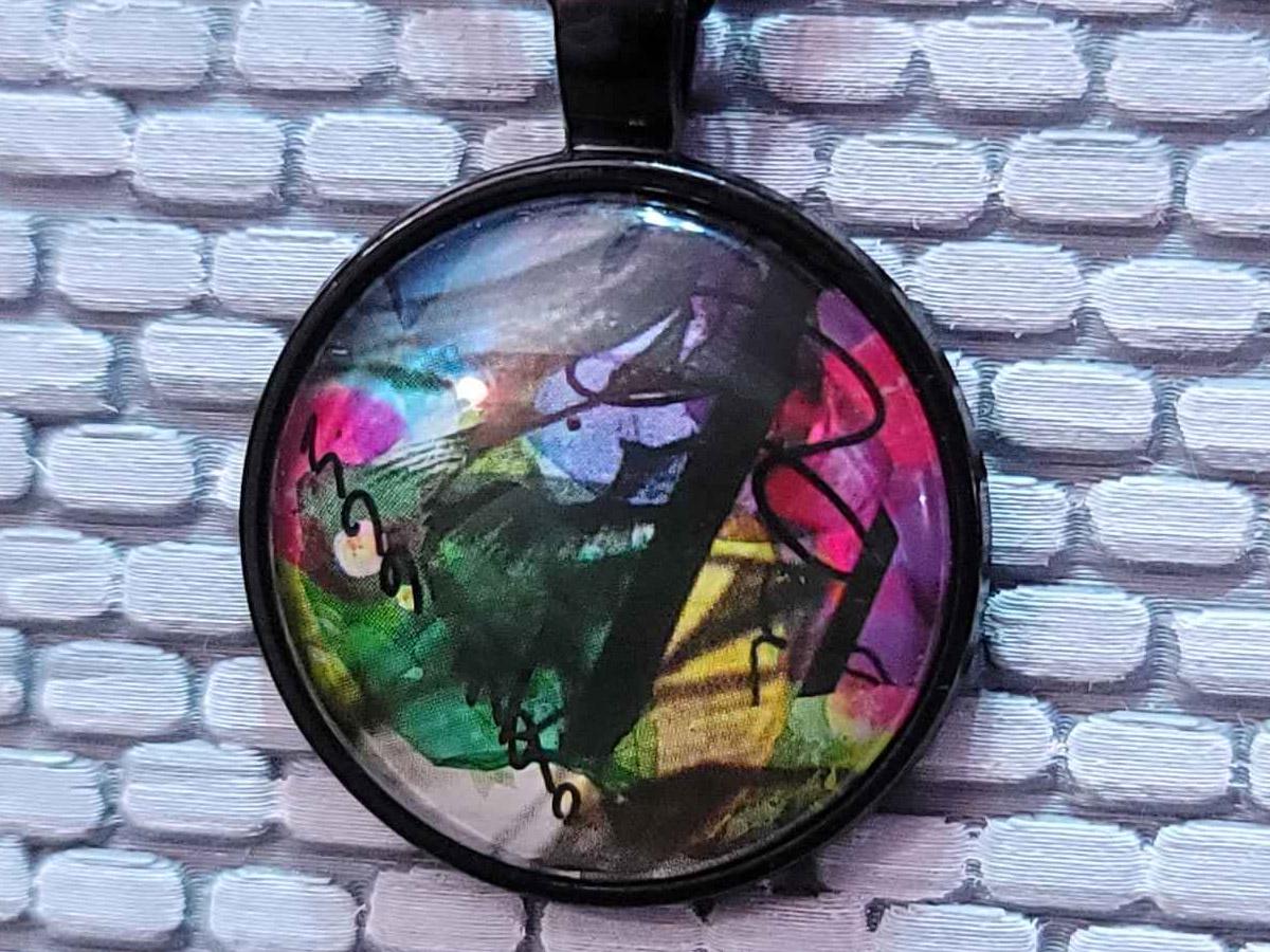 Each of these pendants is a handmade one-of-a-kind piece of art. With layered abstract patterns, they look almost like shattered pieces of a stained glass window. The focal colors for this listing are the full rainbow: pinks to golds to blues, to greens and purples with pops of white and black.