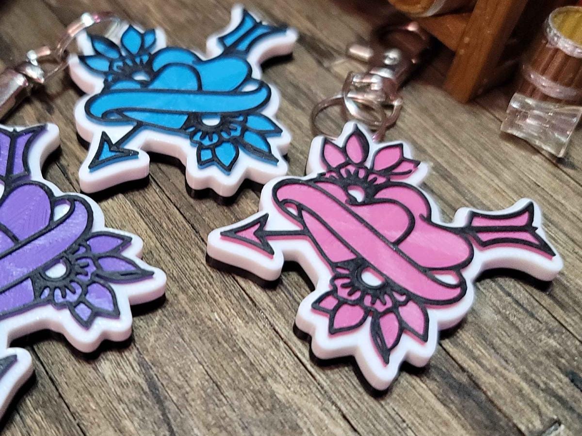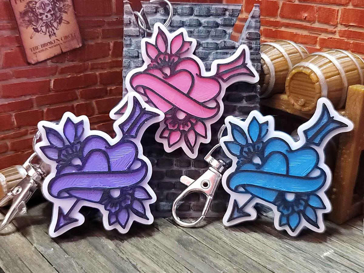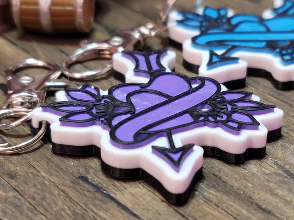 3d printed with love by Kit Rocha, these 1.75" x 1.75" keychains sport a black base, a white background, and the Broken Circle's logo in your favorite color. They come with a silver split ring and a keychain clip that makes it easy to clip this to anything!