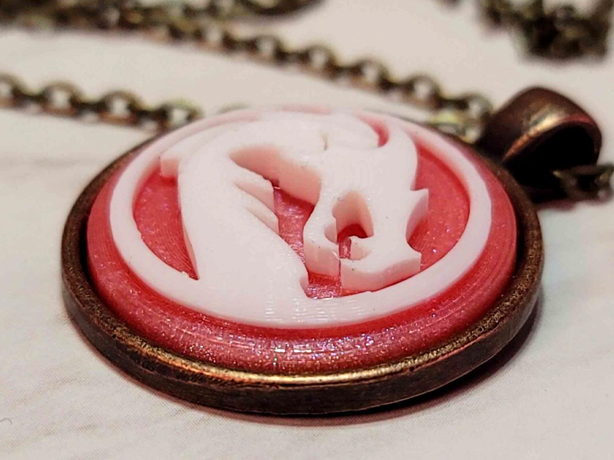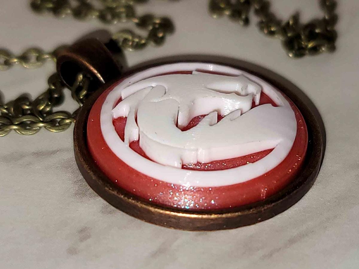 This necklace pendant is a 1" x 1" 3d printed disc set in a antique bronze-plated pendant tray. Each pendant comes with two chains in colors matching the bezel: one 18" & one 24".