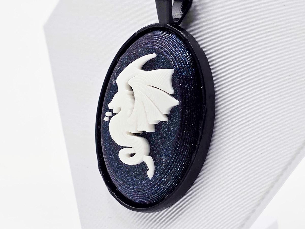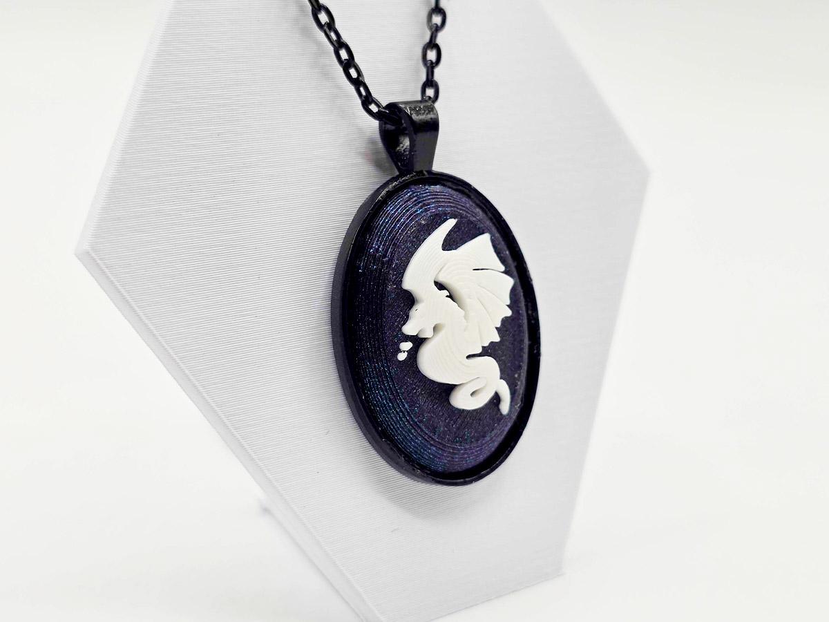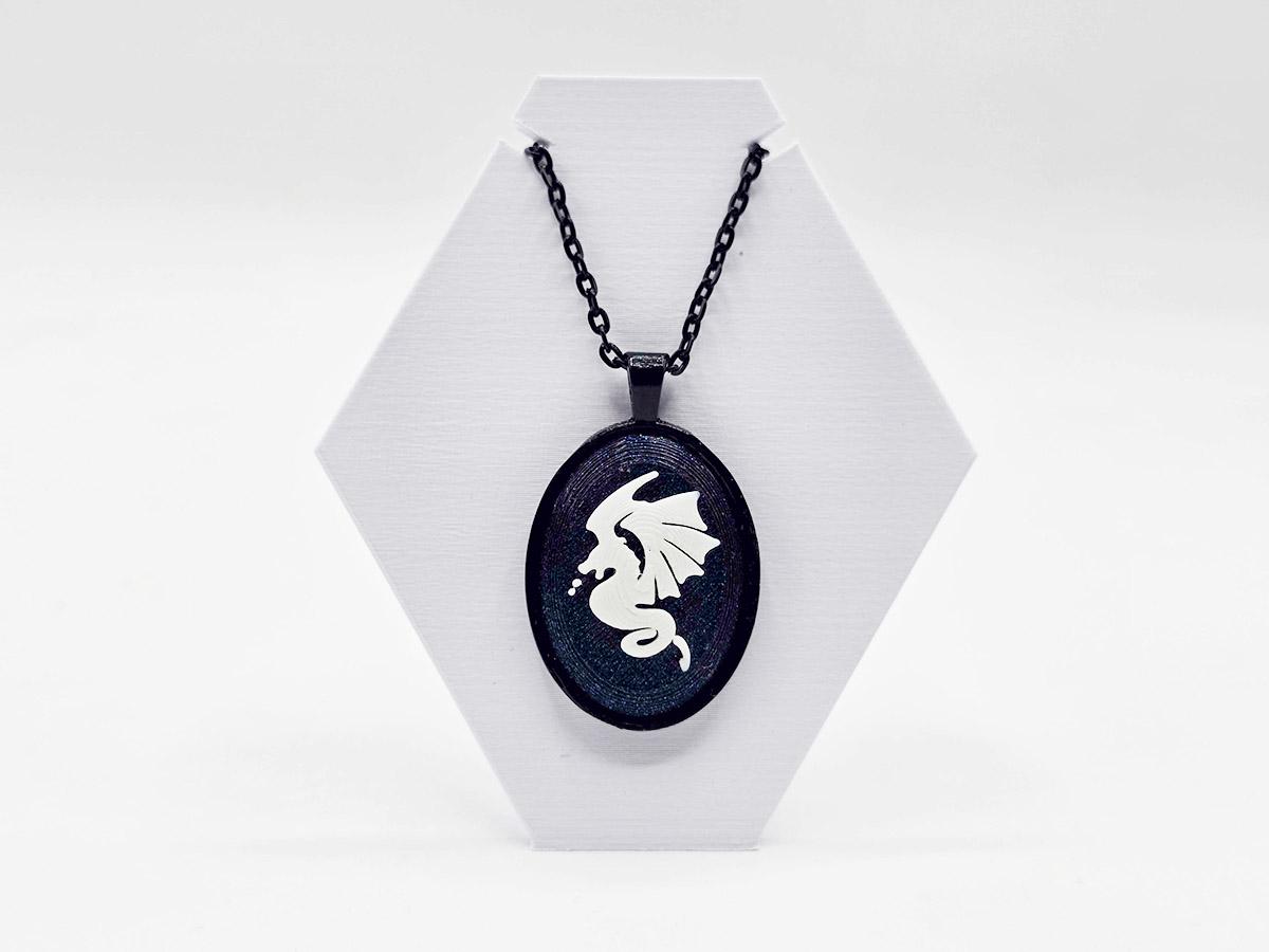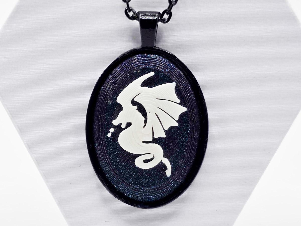 Want to tell the words that you love dragons, but in a classy way? This classic cameo-inspired necklace has a deep midnight sparkle base, and a white dragon in profile carved onto it.