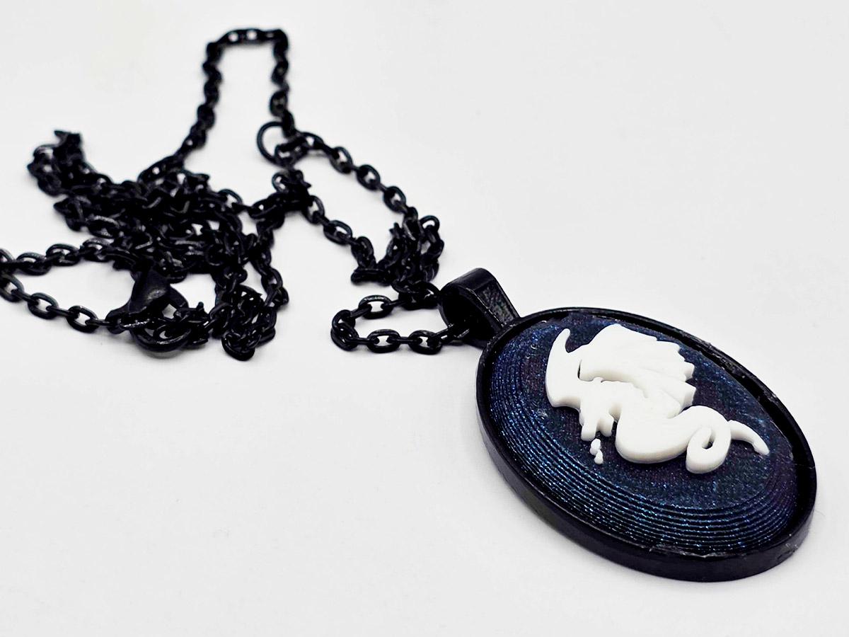 This necklace pendant is a 22mm x 30mm 3d printed oval set in a antique silver pendant tray. Each pendant comes with two chains in colors matching the bezel: one 18" & one 24".