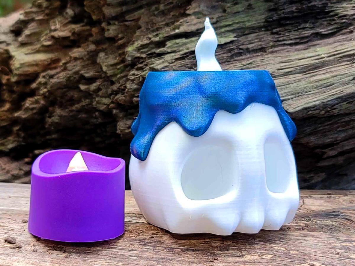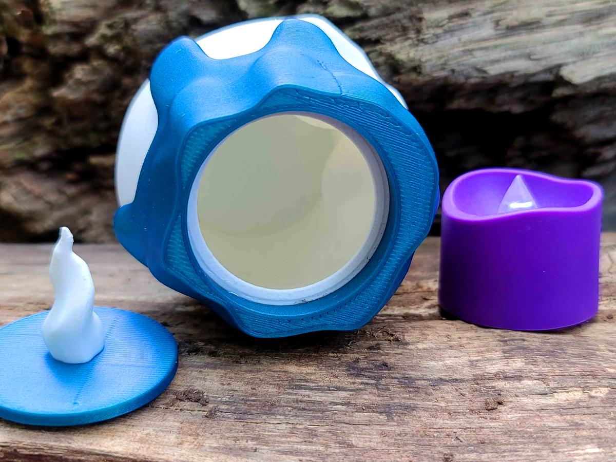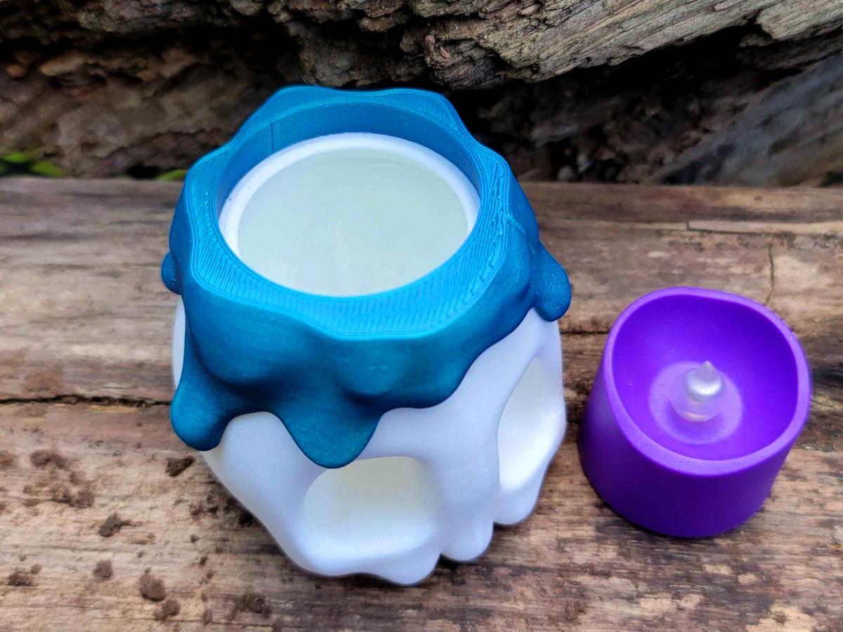 The white base comes with a fake melted wax rim in a gorgeous blue, and two flame options: keep it simple with the 3D printed flame, or flip it over (or just remove it entirely) and put an LED tealight in its place!