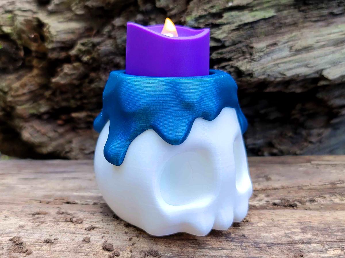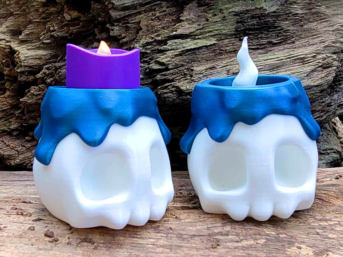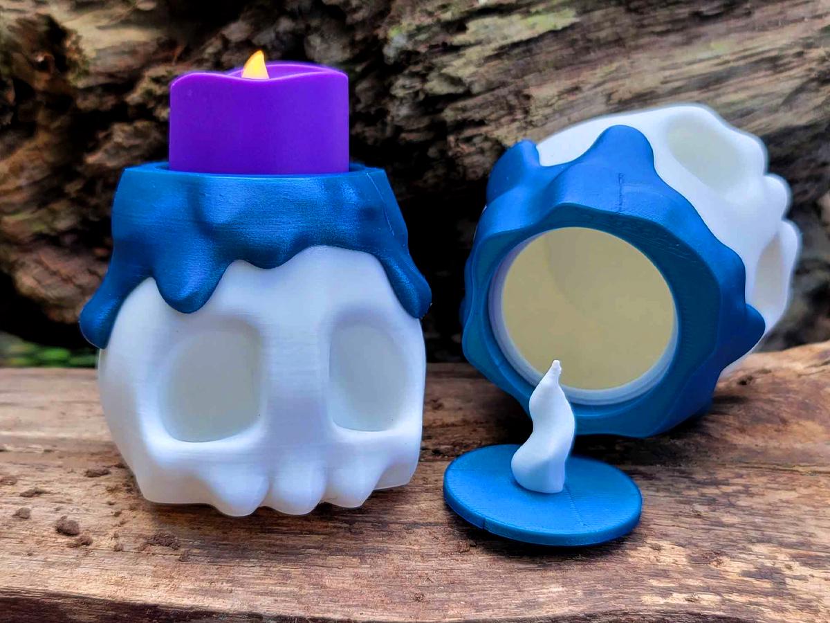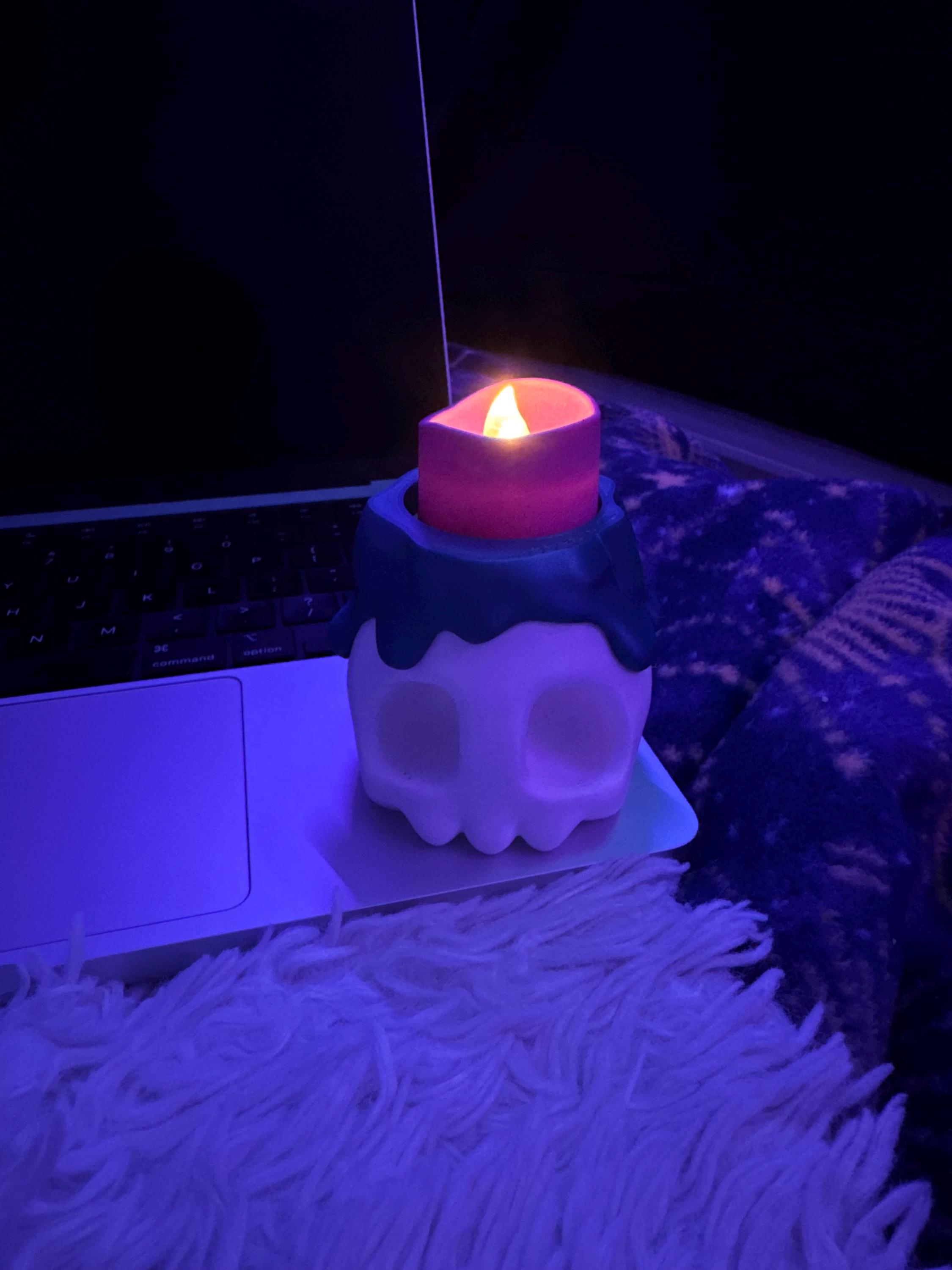 The white base comes with a fake melted wax rim in a gorgeous blue, and two flame options: keep it simple with the 3D printed flame, or flip it over (or just remove it entirely) and put an LED tealight in its place!