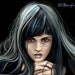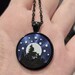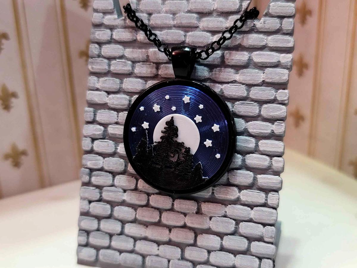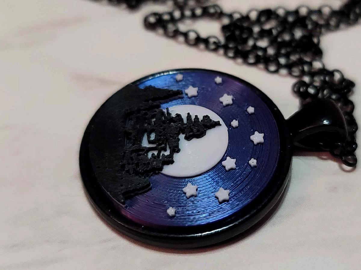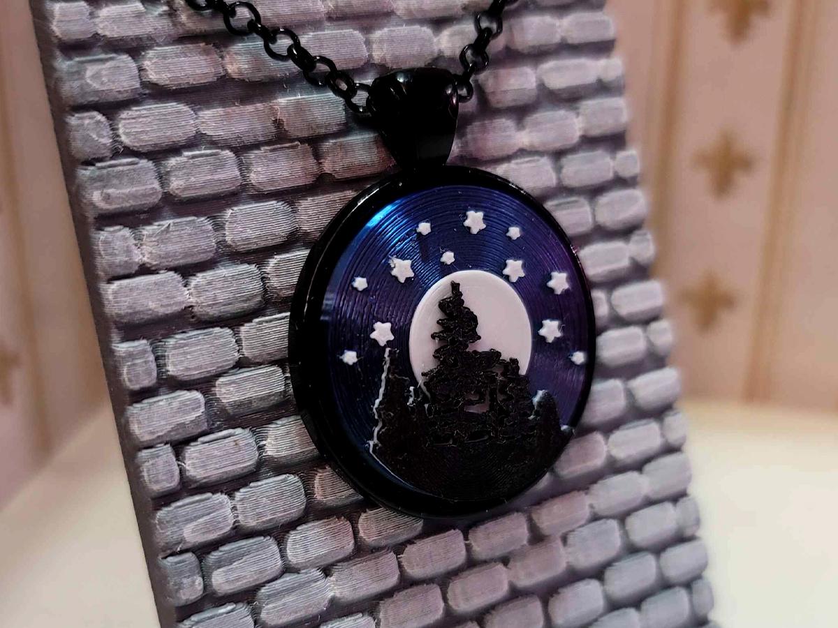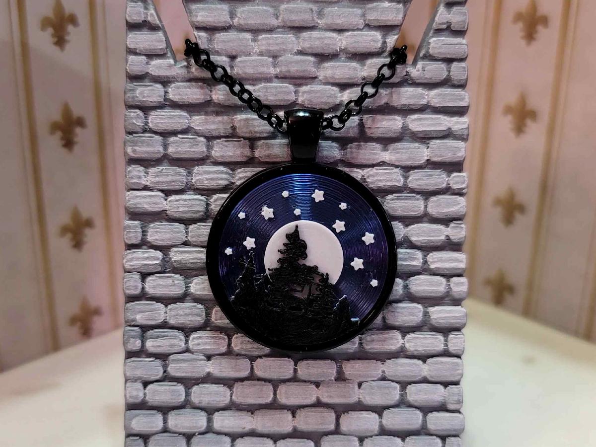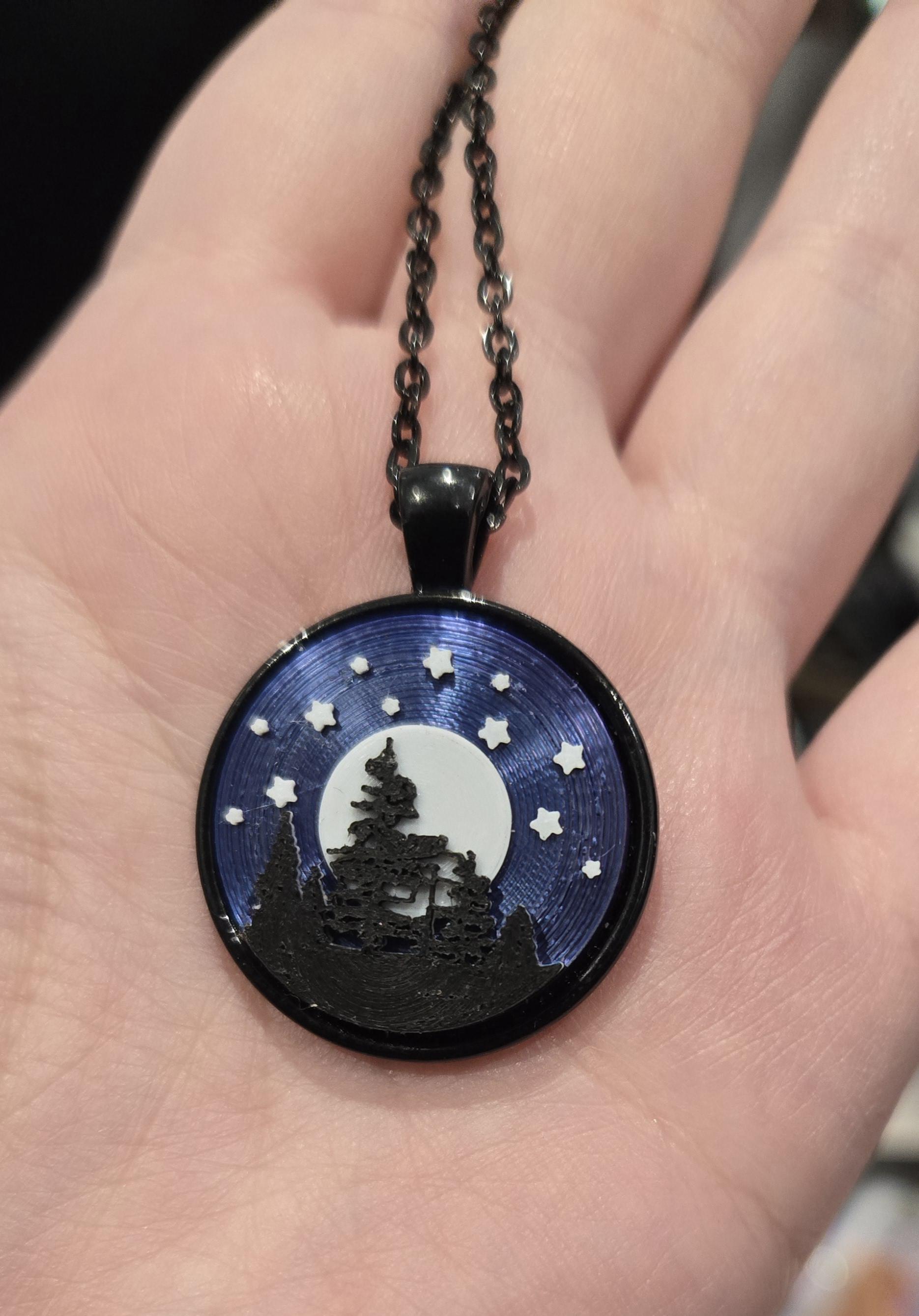 This necklace captures the night sky. The black silhouettes of trees stand out against a full white moon, and the stars sparkle above across a sky that looks purple from some directions and blue from others.