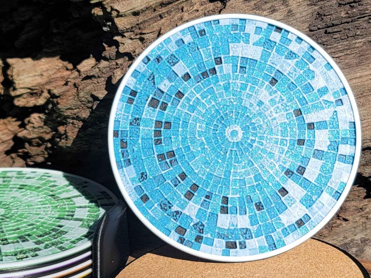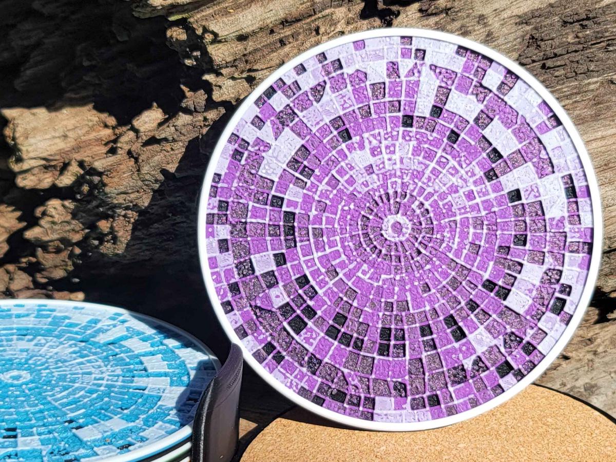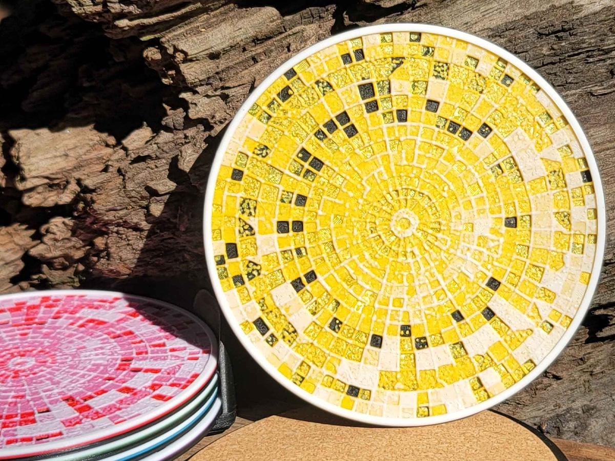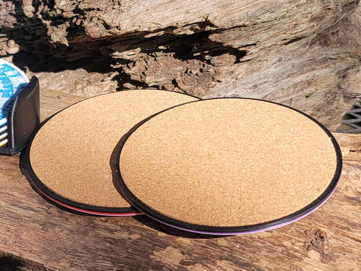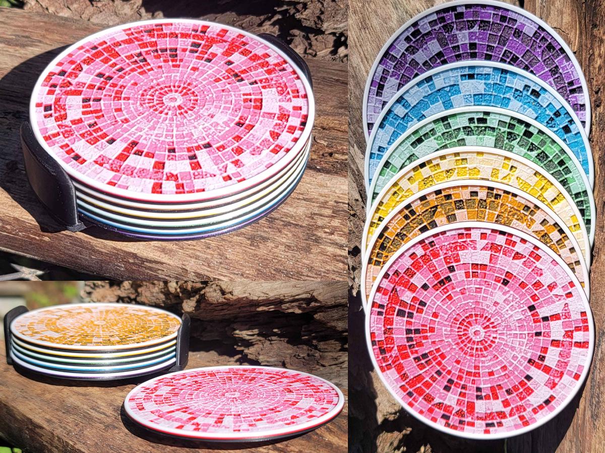 Each four inch coaster is backed with cork to make sure they don't slip around. They come in six colors, creating a beautiful rainbow: red, orange, yellow, green, blue, and purple!