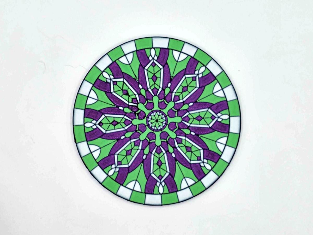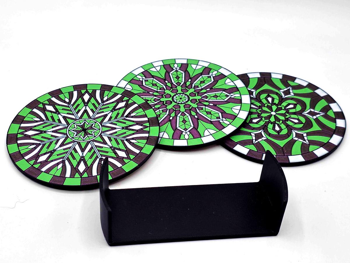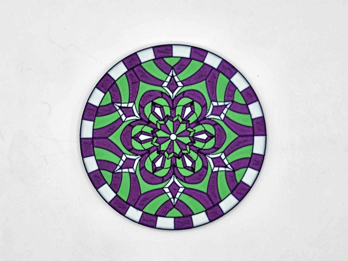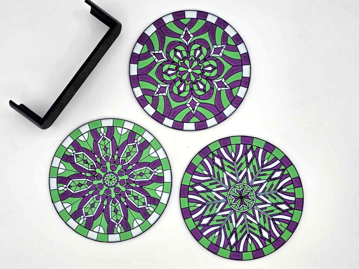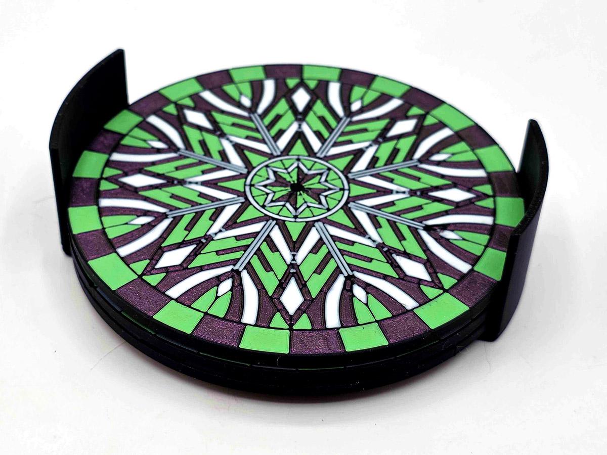These 3D printed coasters bring the magic of stained glass with the sturdiness of, well, coasters. (While they are stained glass inspired, they are NOT transparent!) Each of the three coasters features a complex geometric pattern outlined in black, with the individual segments painted a deep sparkle purple, light green, and white.
