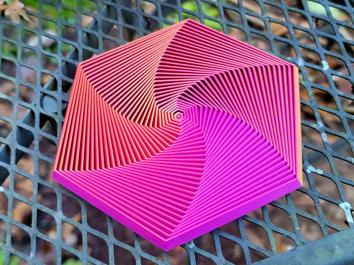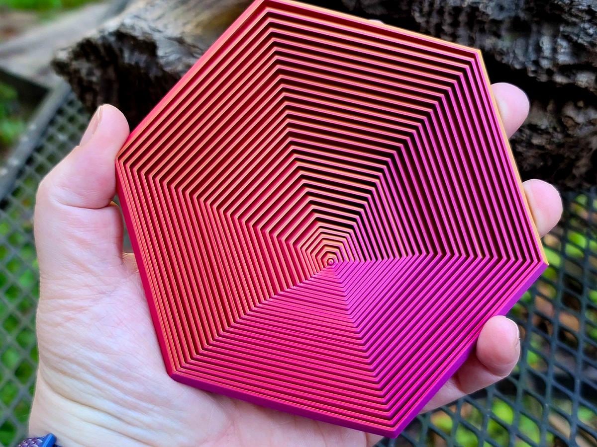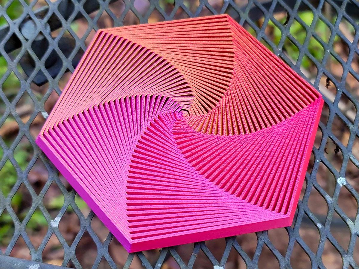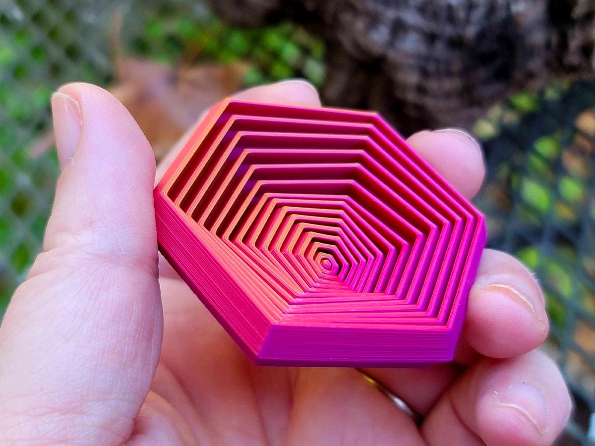 This hexagon shaped fidget toy is hypnotic. Printed with a tri-color magenta/orange/gold, it slides, twists, and makes the most satisfying clicky sound. As a bonus, one side looks matte, but the other has a subtle shimmery sparkle, which makes them even more cool.