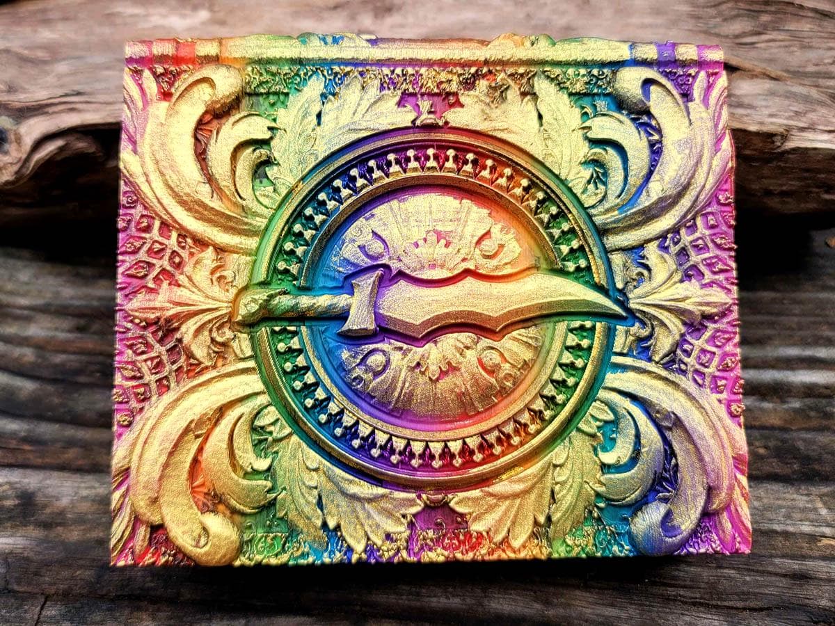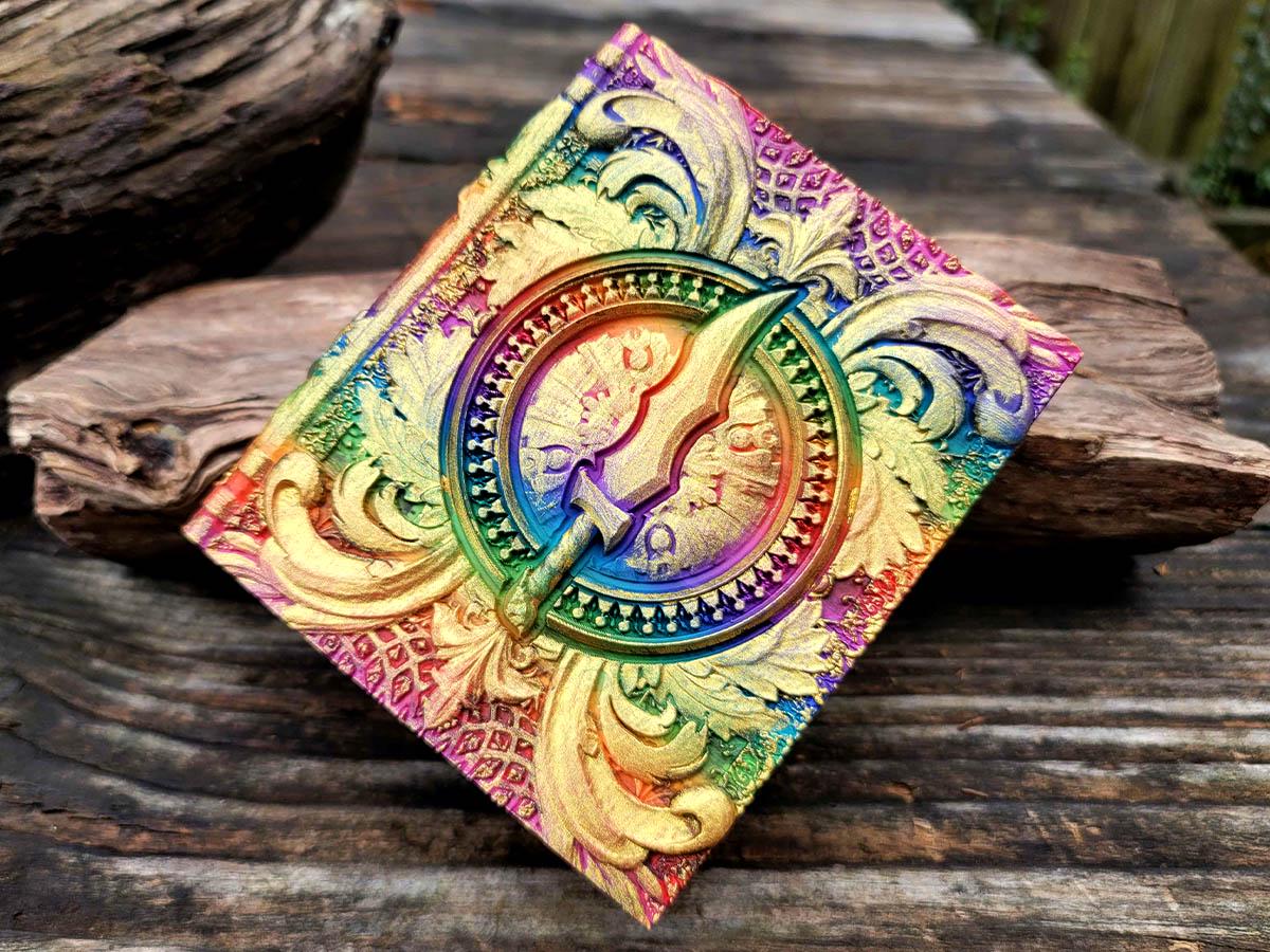 This edition features an ornate blade surrounded by flourishes, perfect for the rogue or assassin in your gaming party, or anyone who just likes pretty daggers! It is printed in a rainbow gradient and brushed in a sparkly gold that makes it truly unique.