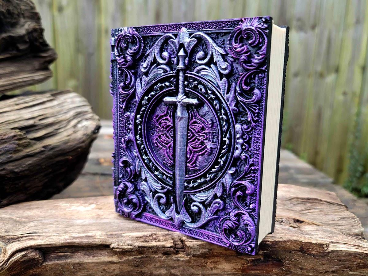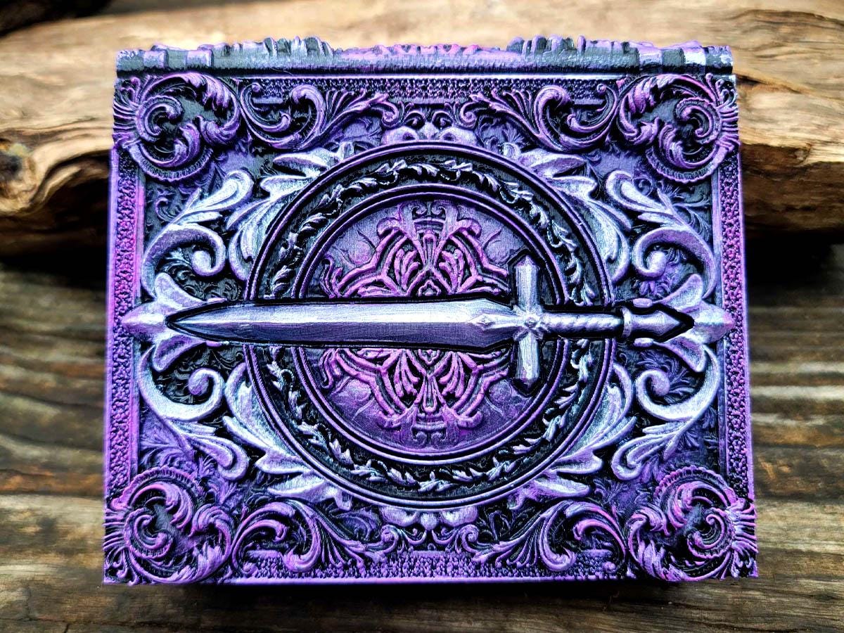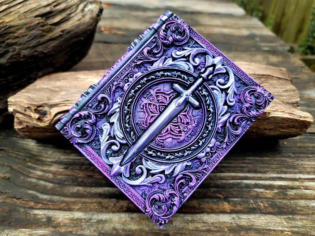 This edition features a steely sword surrounded by flourishes, perfect for the noble warrior or chivalrous knight in your gaming party, or anyone who just likes stabby things! It is lovingly hand-painted in deep purples and pinks, and burnished with a gorgeous silver.