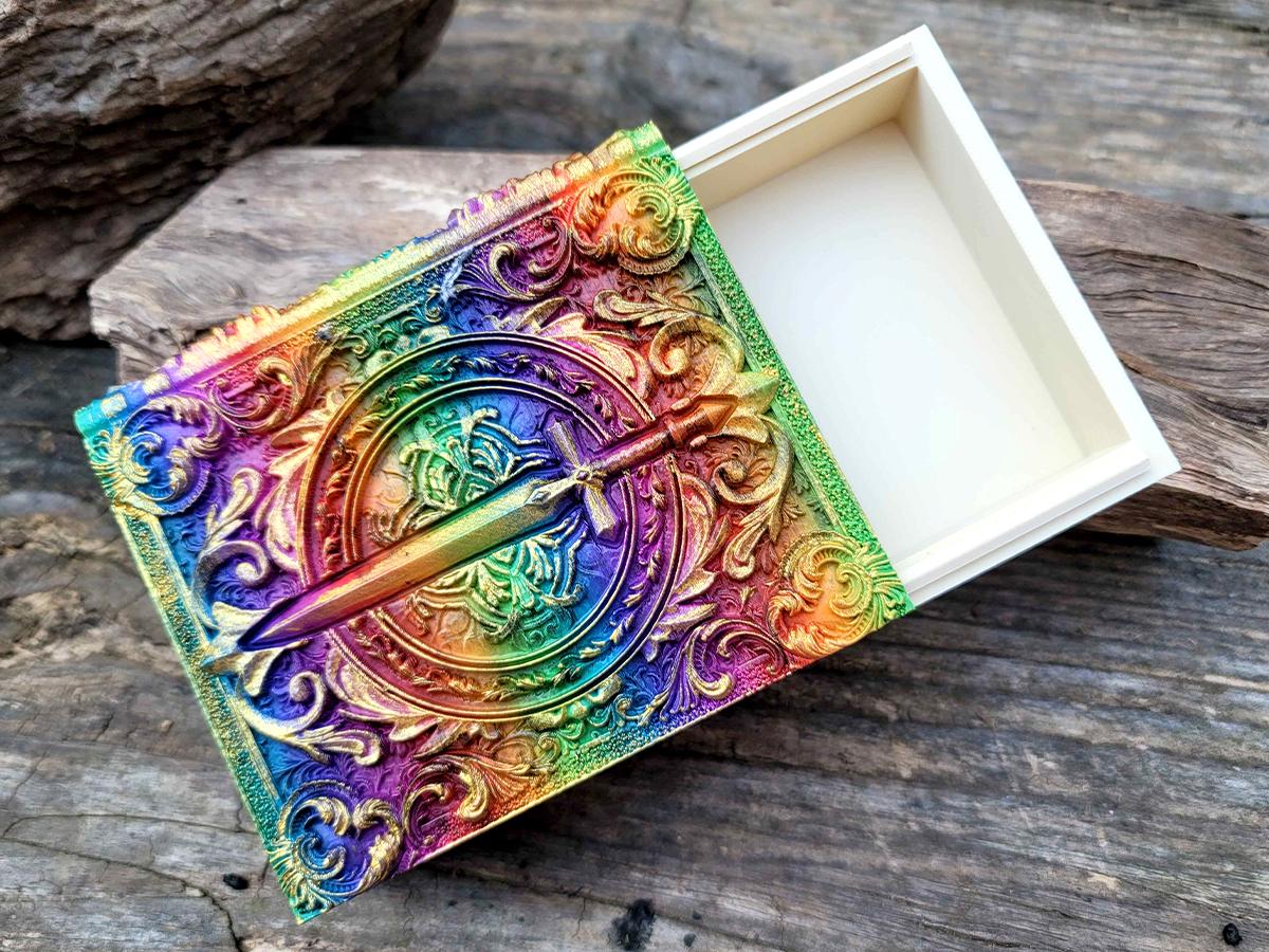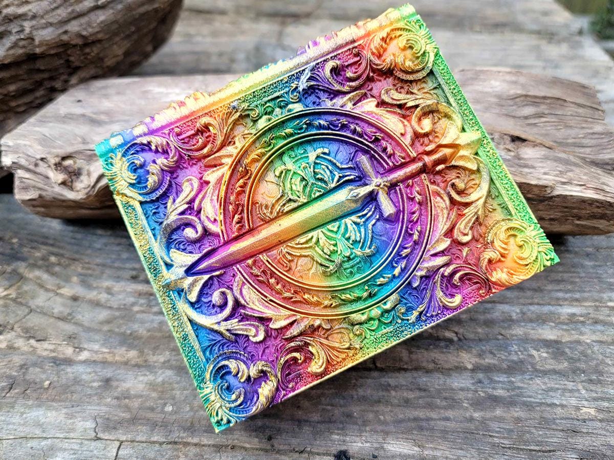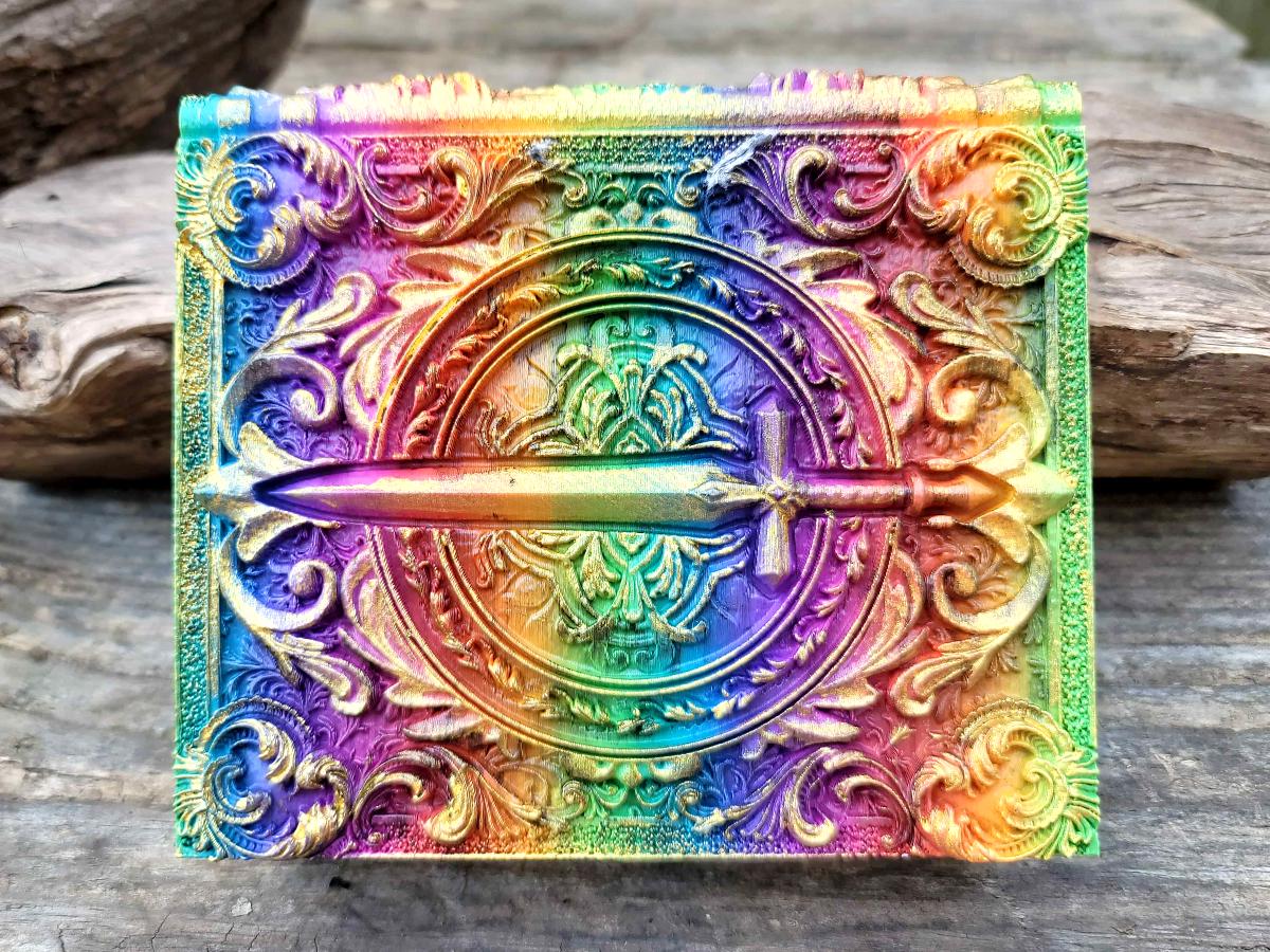 This edition features a steely sword surrounded by flourishes, perfect for the noble warrior or chivalrous knight in your gaming party, or anyone who just likes stabby things! It is printed in a rainbow gradient and brushed in a sparkly gold that makes it truly unique.