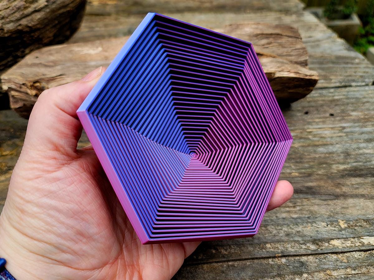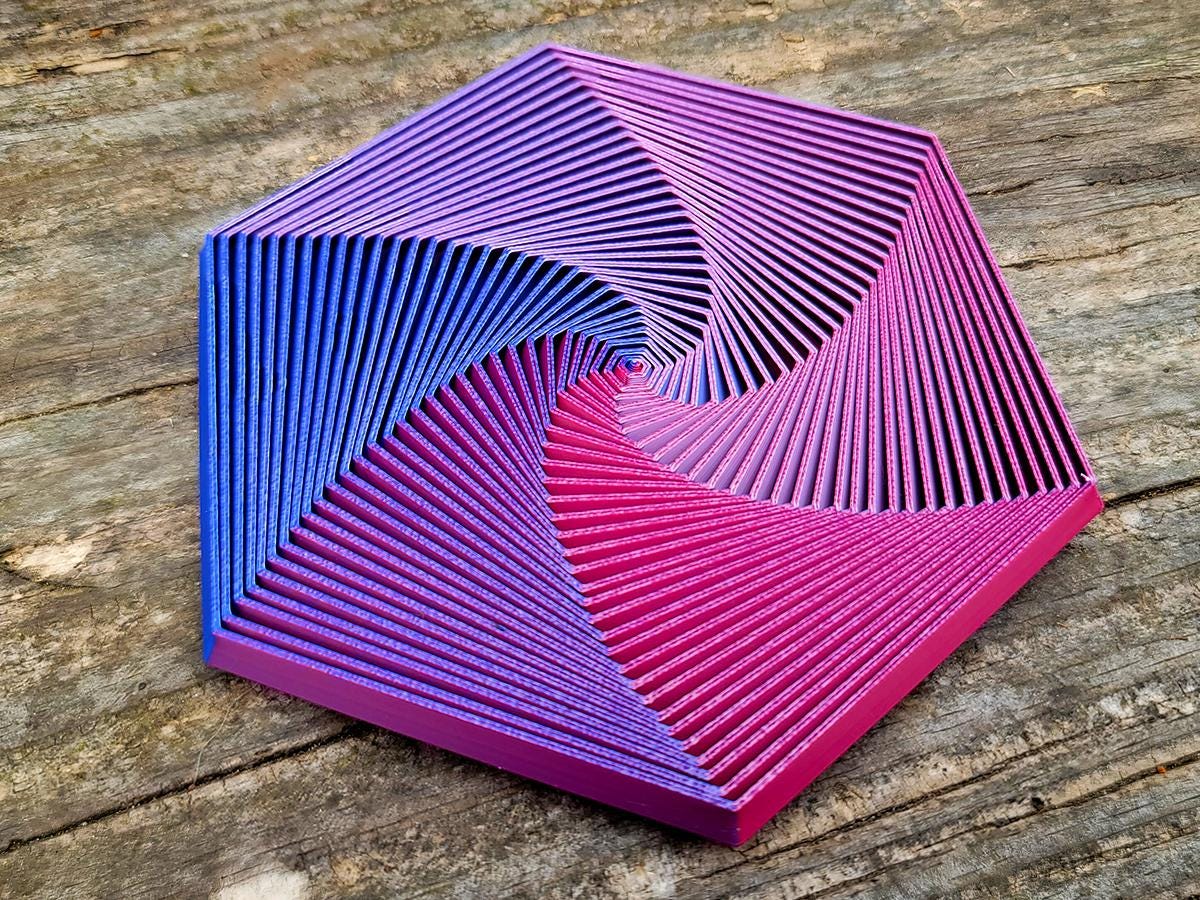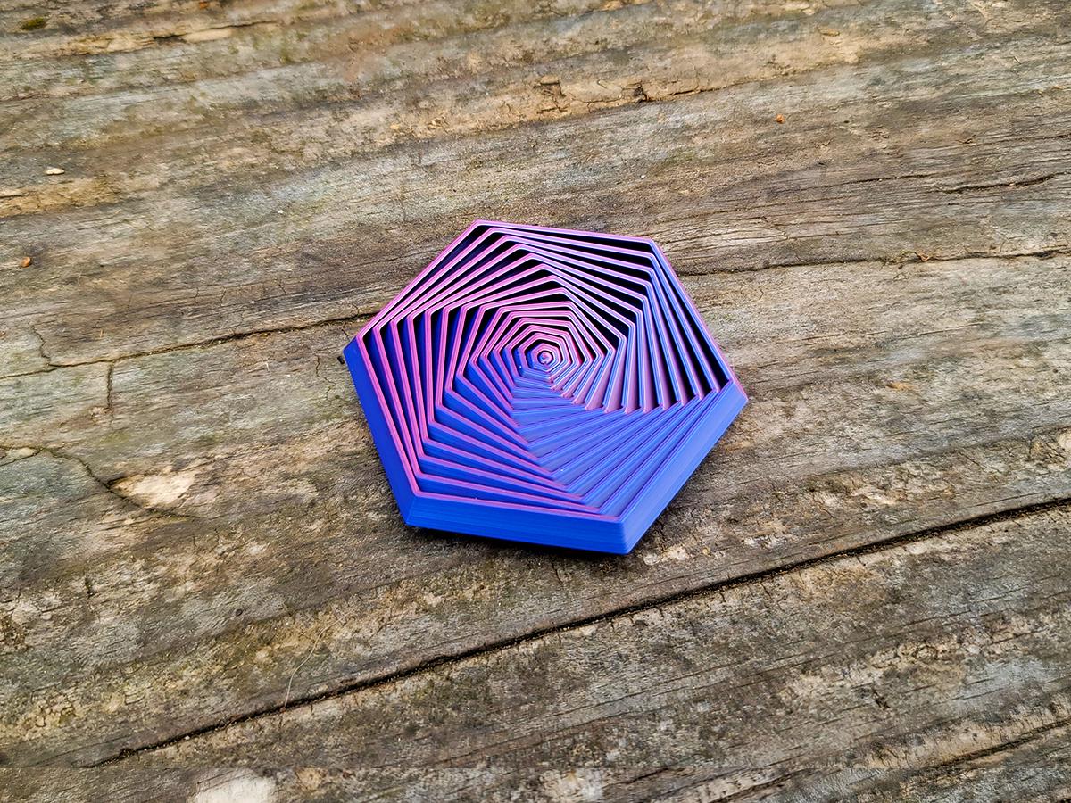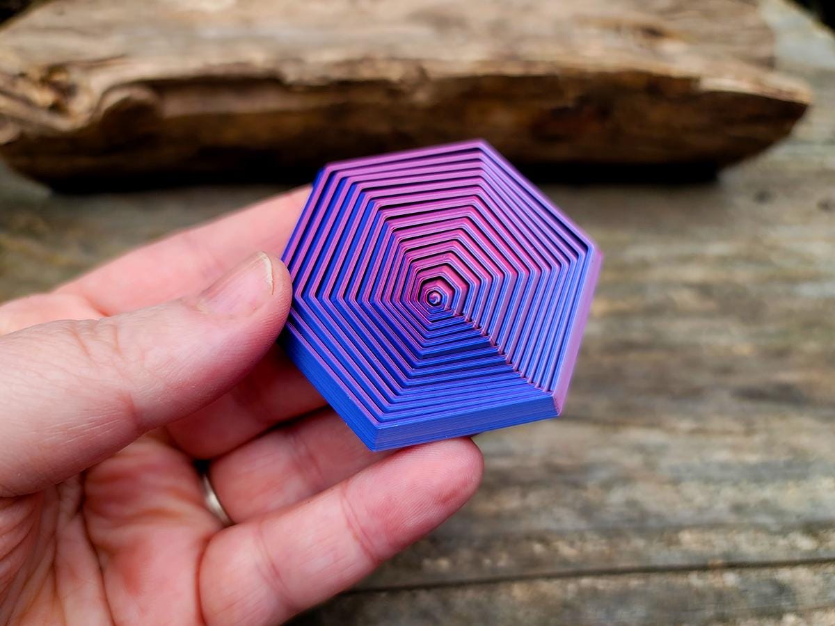 This hexagon shaped fidget toy is hypnotic. Printed with a tri-color metallic filament, it shifts between a frosted light blue, a light pink, and a dark blue as you turn it. It also slides, twists, and makes the most satisfying clicky sound.