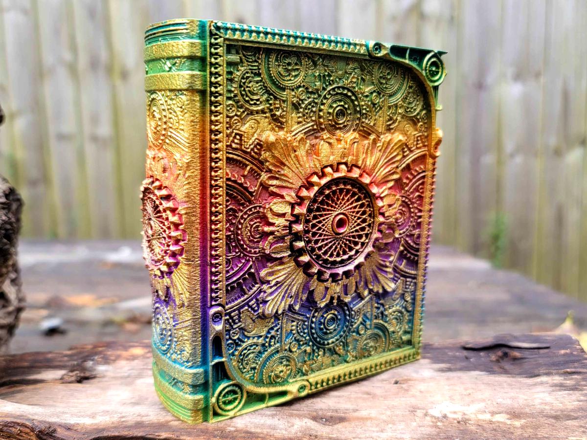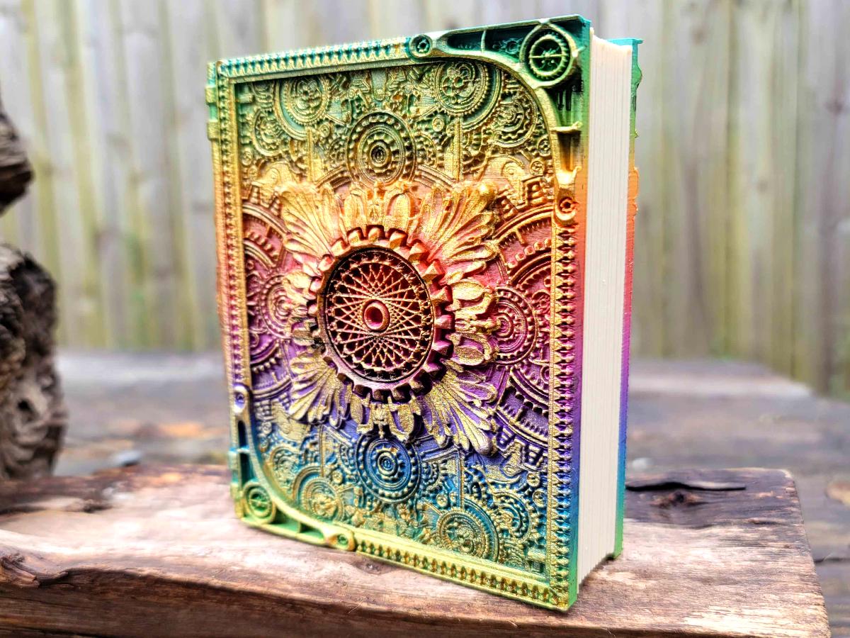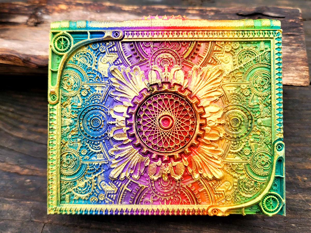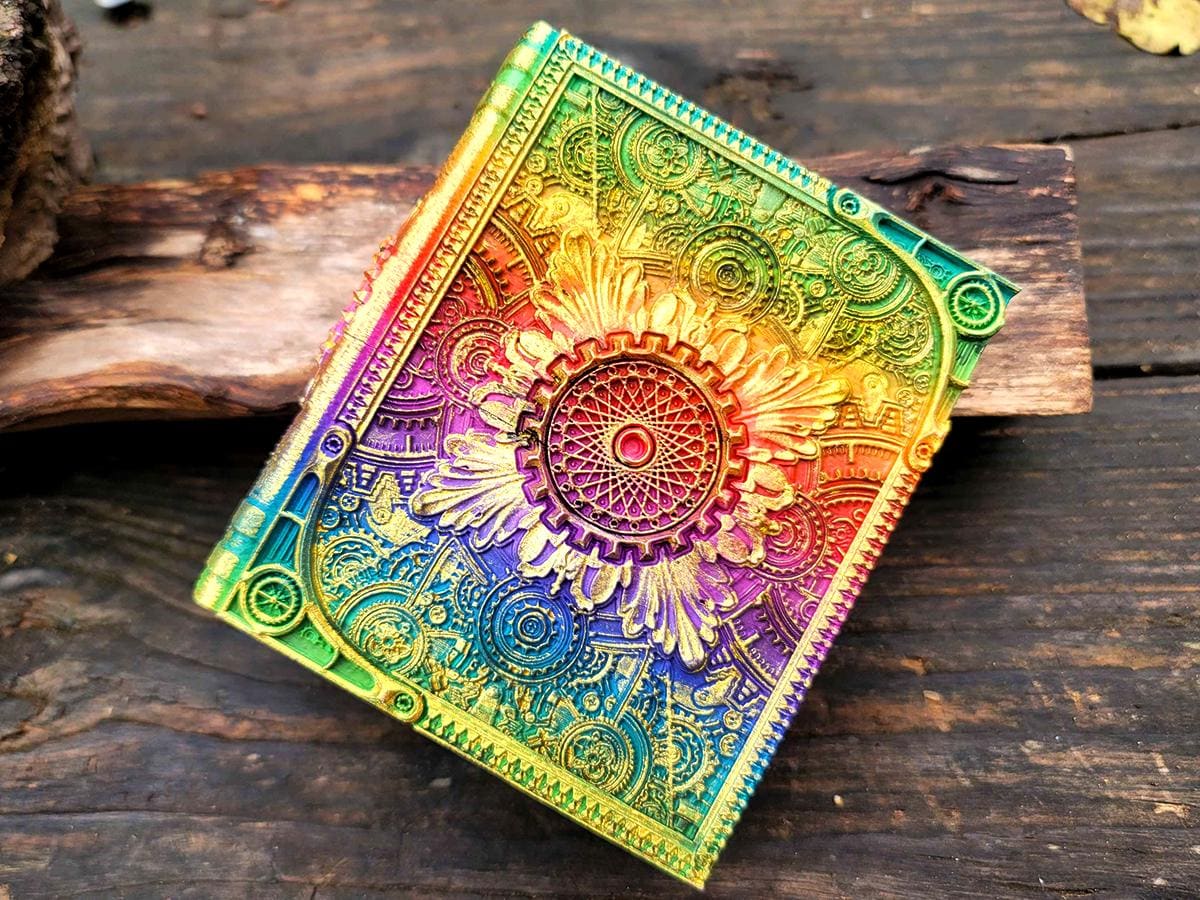 This edition celebrates the intersection of magic and technology with a steampunk-y central spirograph surrounded by gears and flourishes. It is printed in a rainbow gradient and brushed in a sparkly gold that makes it truly unique.