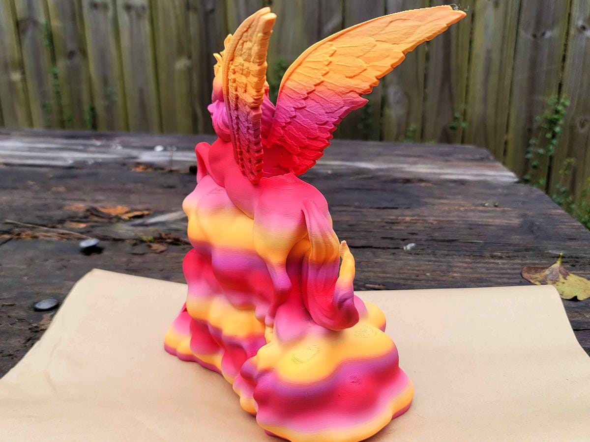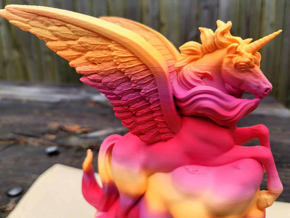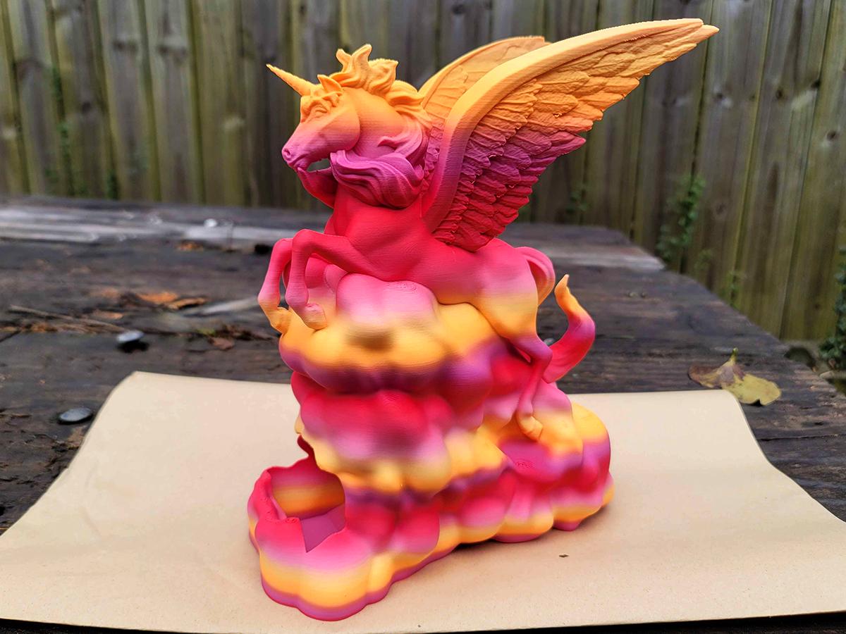 Roll your dice in fabulous style with this winged unicorn dice tower! Featuring a unicorn flying through the clouds with wings spread wide, it is printed in a peach/orange/gold/pink gradient to give you the truly dramatic dice rolling experience you need.