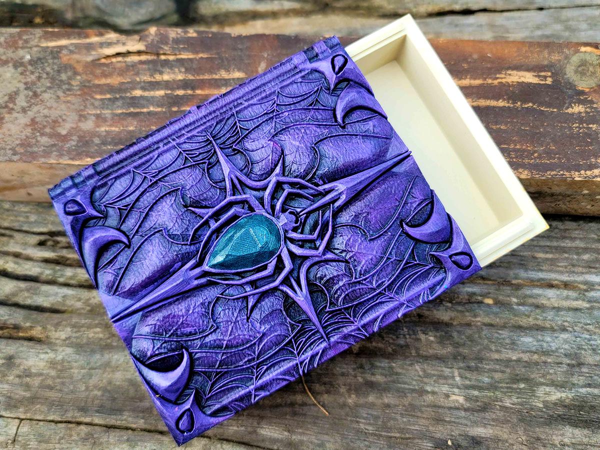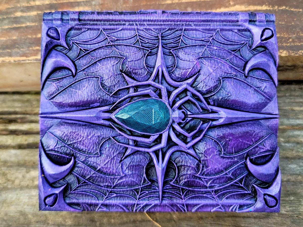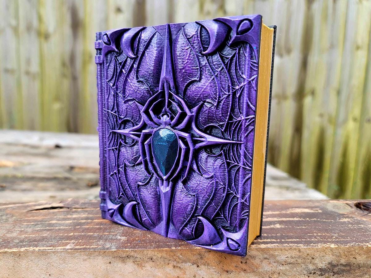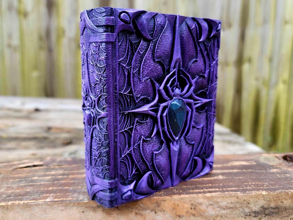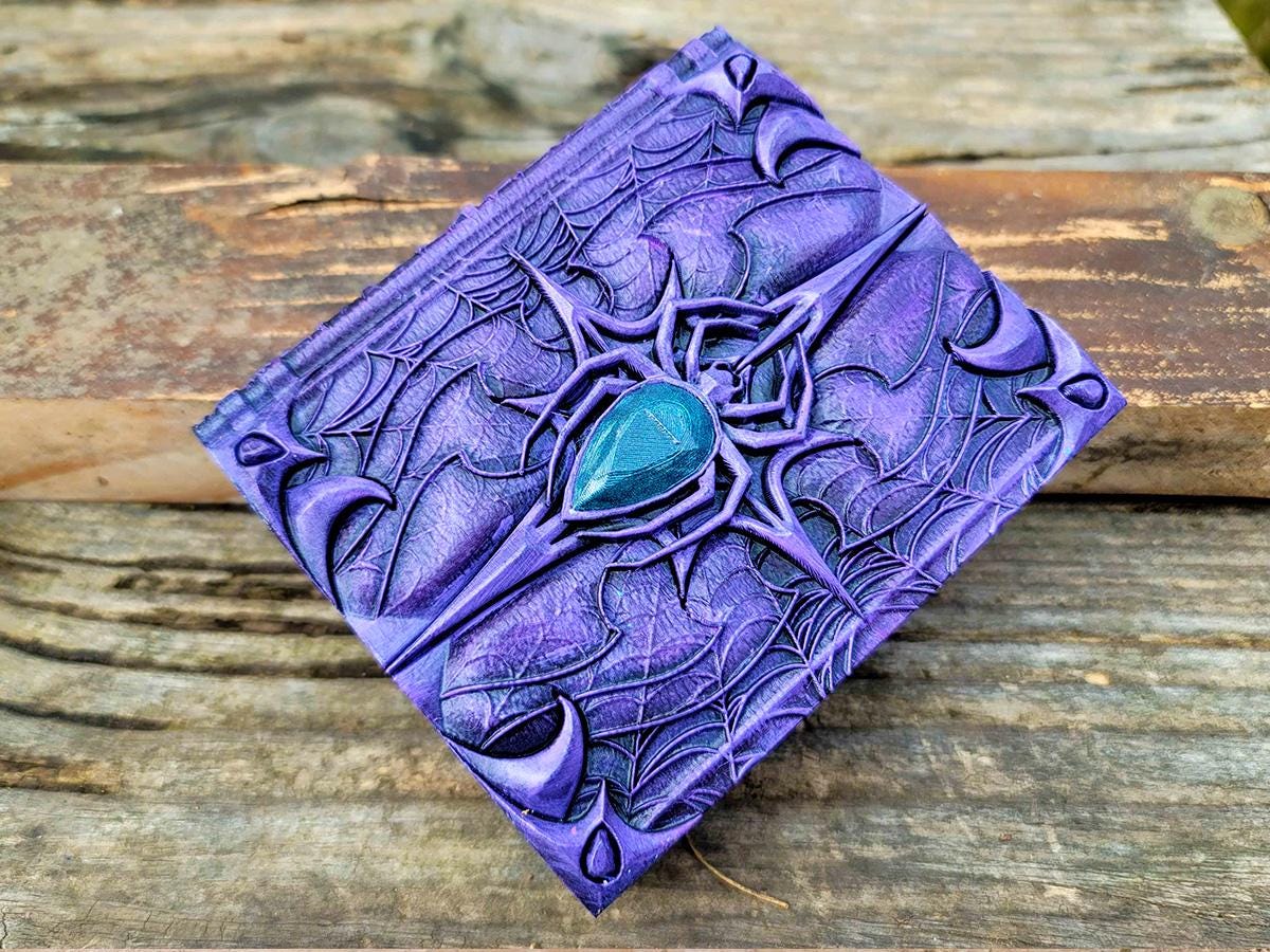 This edition features a spider sitting at the heart of its web, done in moody shades of purple with a hint of iridescence. Unlike with our other tomes, the back of the spider tomes is flat, with a leather texture, painted to match the color of the book. The spider's body is a gem printed from a deep sparkling blue-black, finished with a glossy shine.