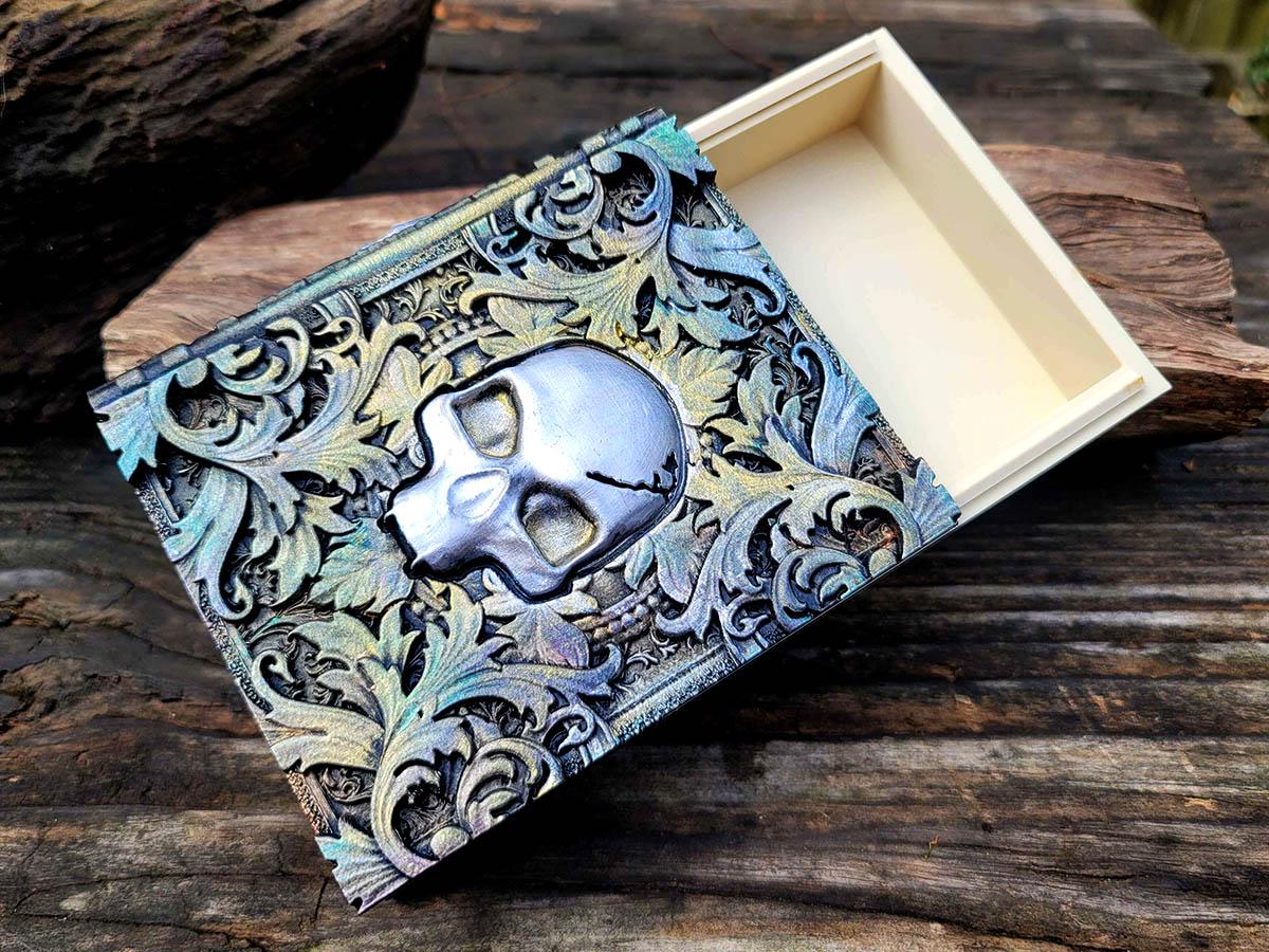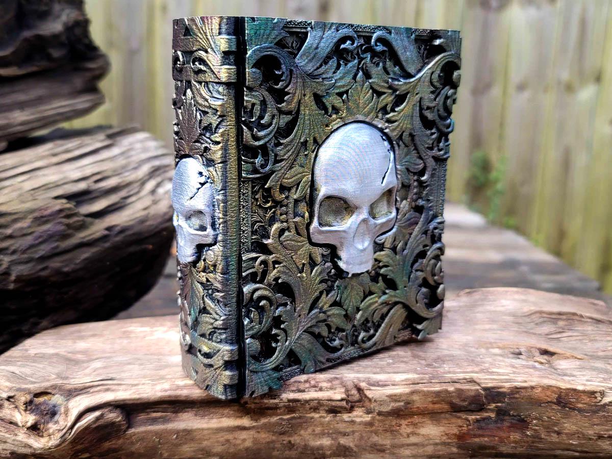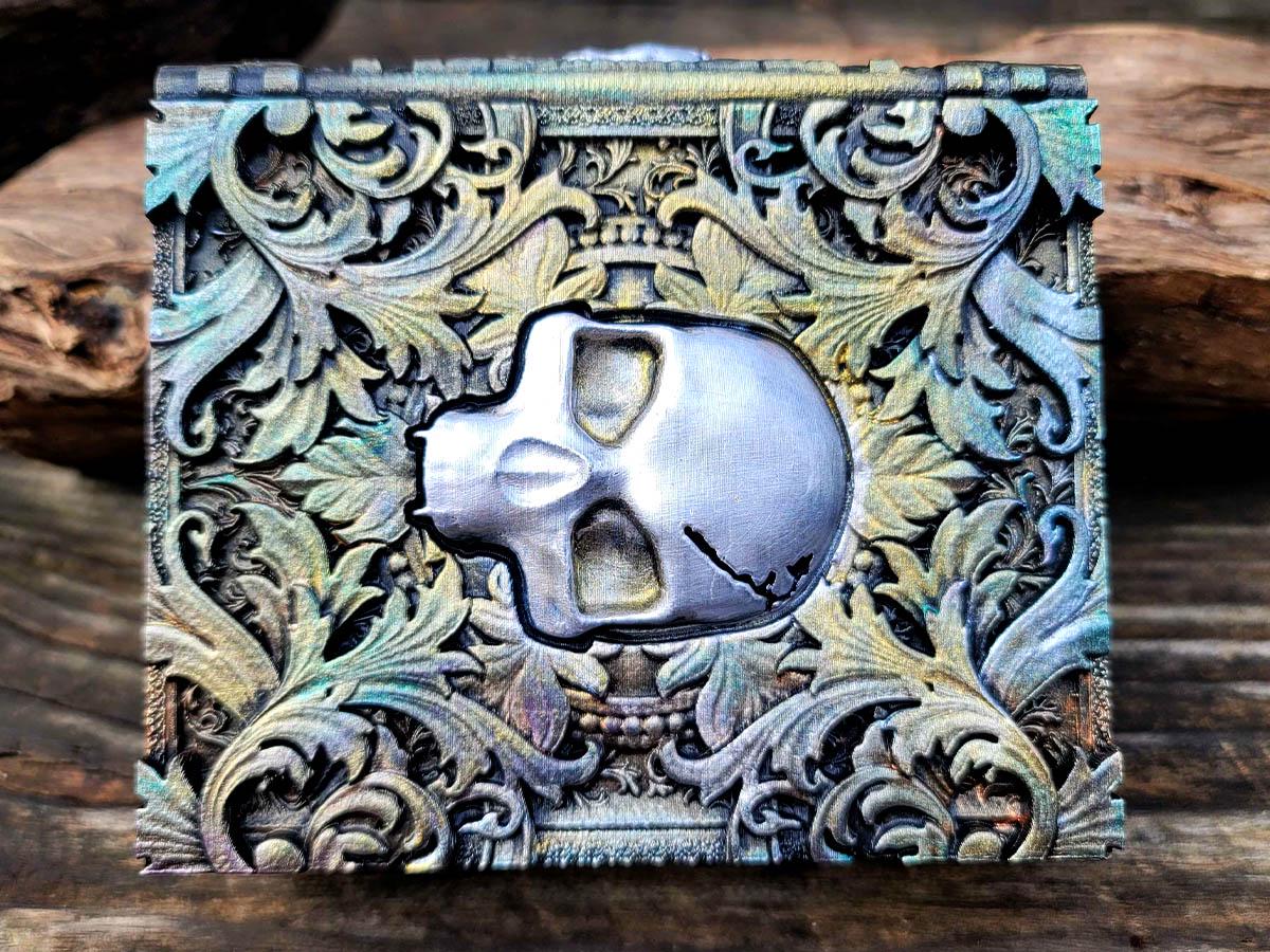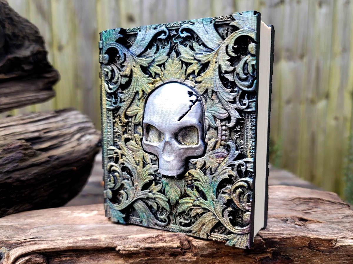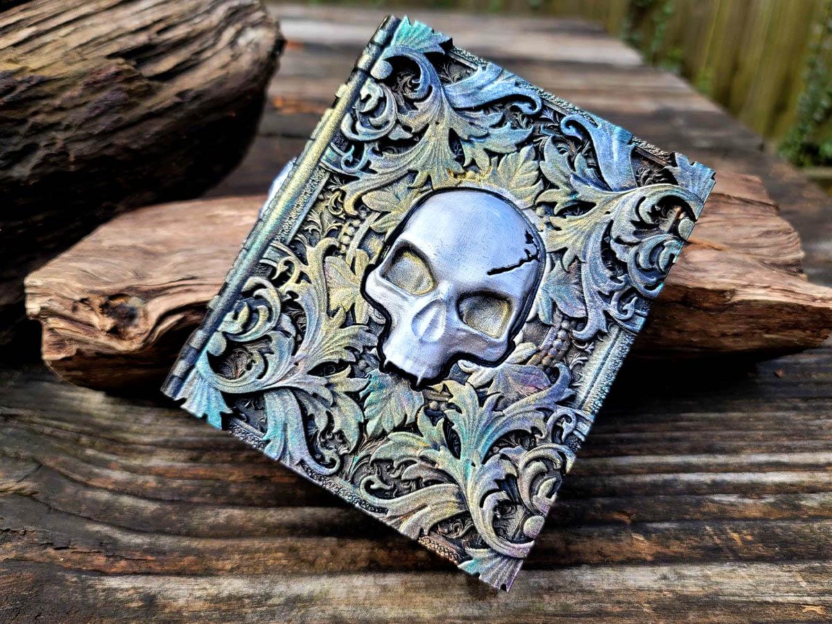 This edition features a skull surrounded by mystical and mysterious flourishes, the perfect accessory for anyone who likes to dance with death. Burnished in silver and gold with hints of faded color, it evokes an ancient and faded book of deep secrets.