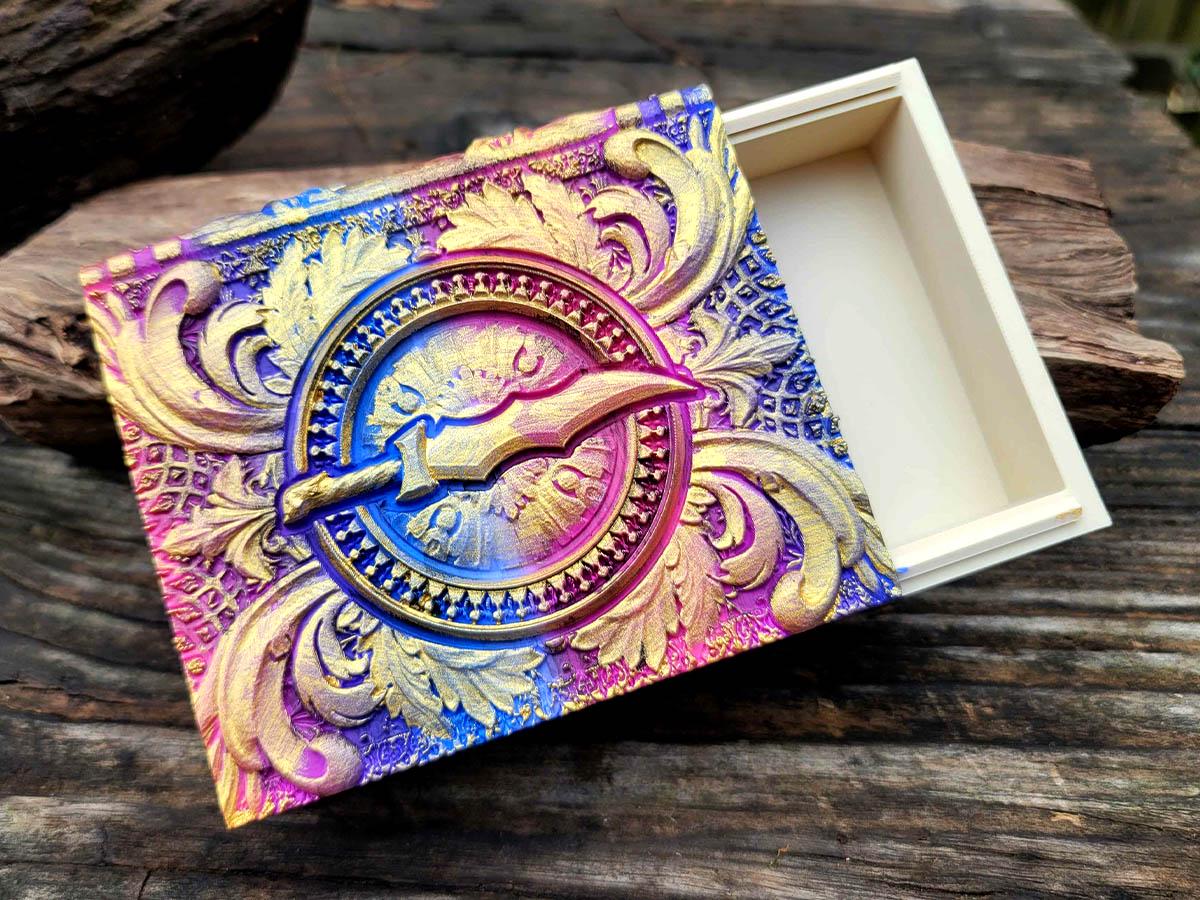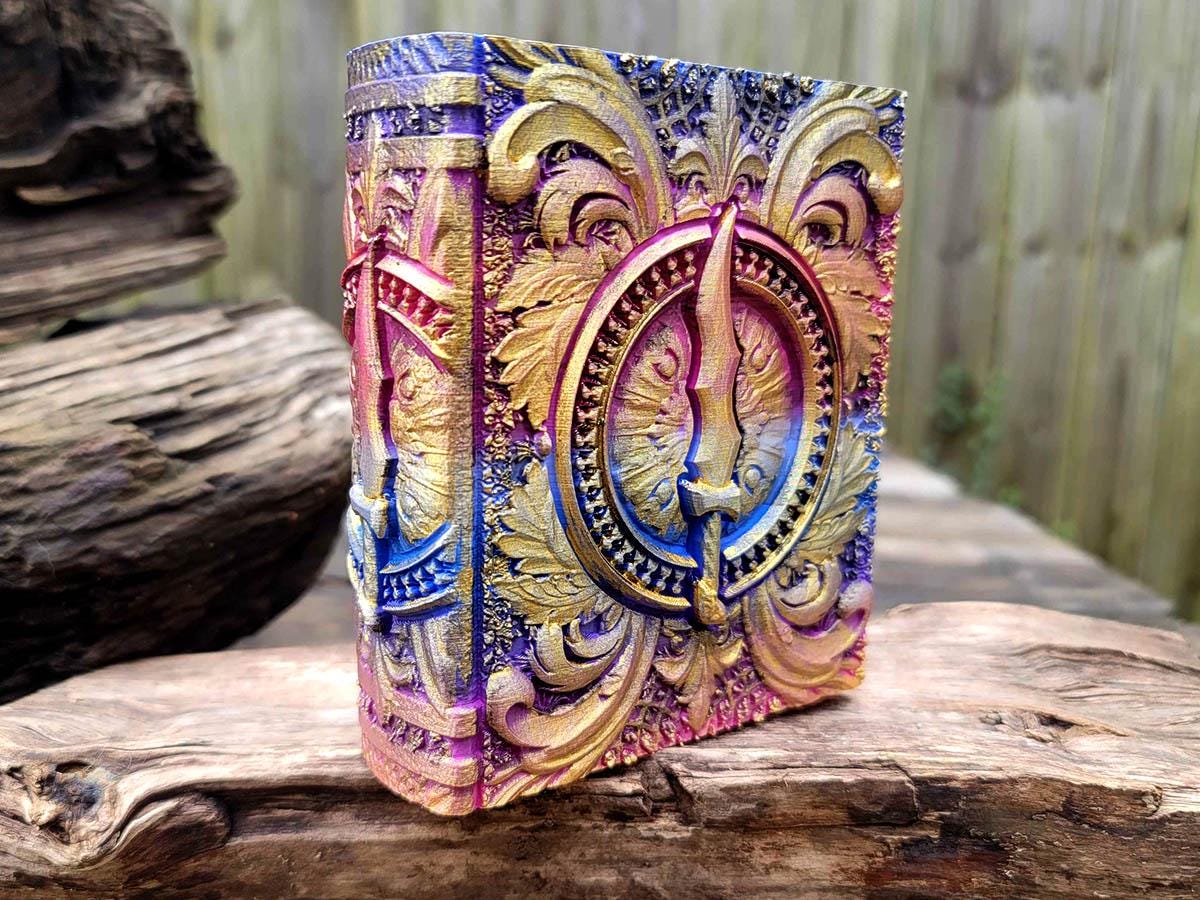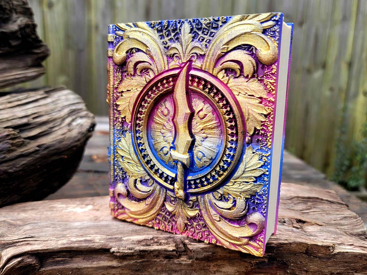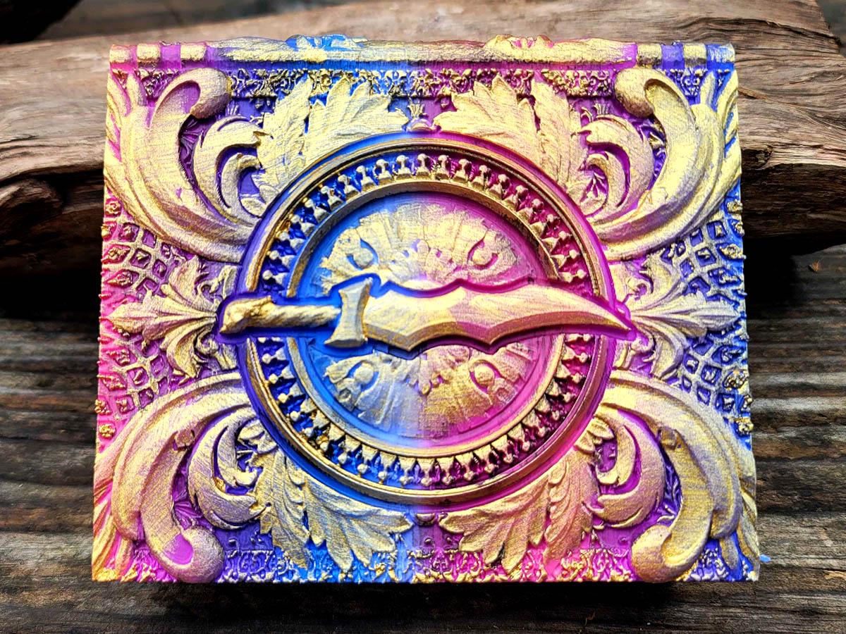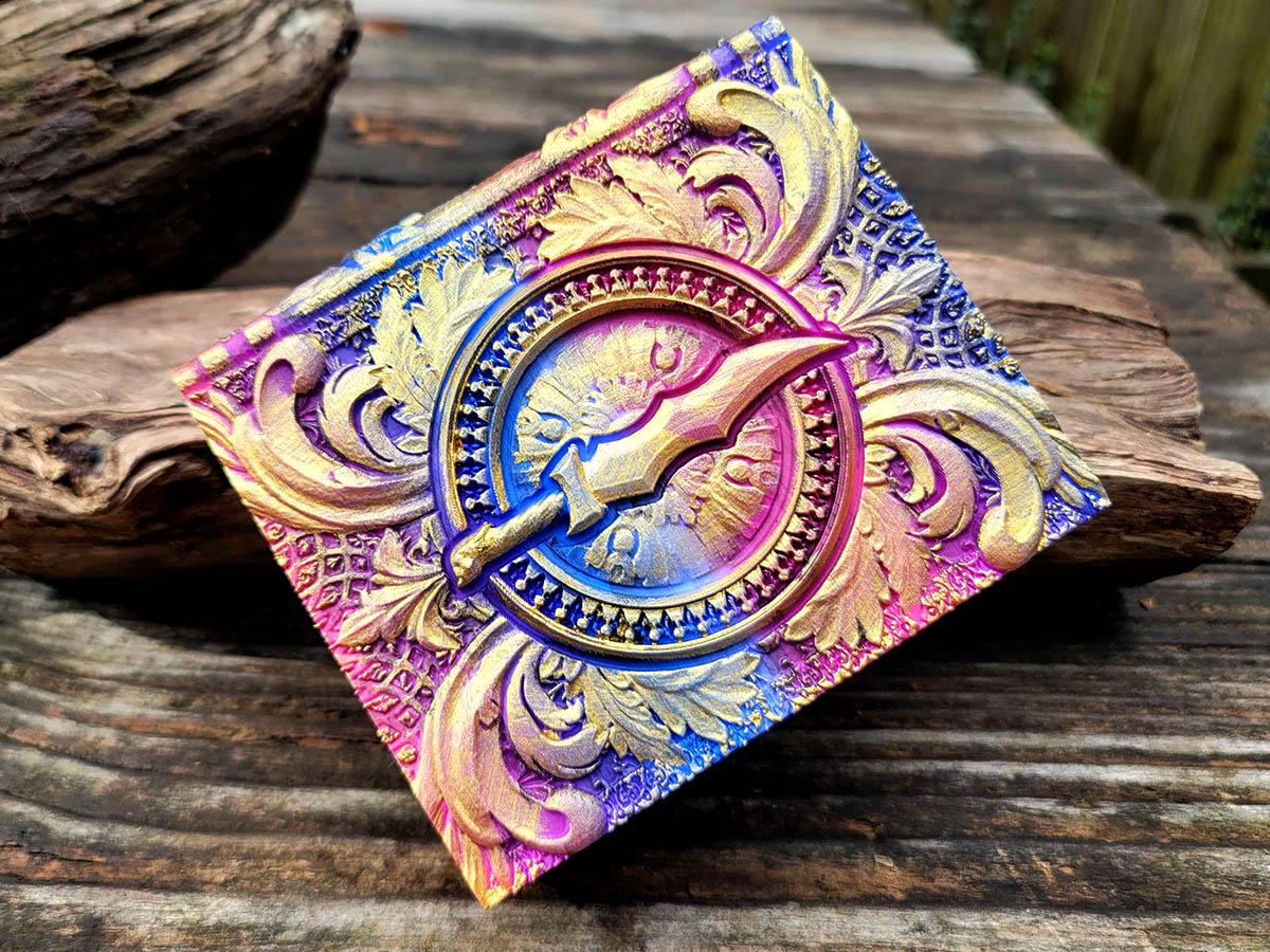 This edition features an ornate blade surrounded by flourishes, perfect for the rogue or assassin in your gaming party, or anyone who just likes pretty daggers! It is printed in a very bisexual gradient of pinks, purples, and blues, and brushed in a sparkly gold that makes it truly unique.