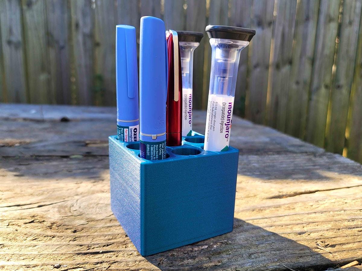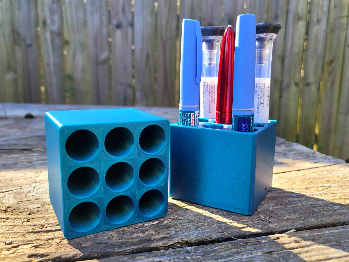 A simple organizing stand that can hold up to 9 insulin, GLP-1, or other injection pens. Perfect for the fridge. It has been tested with ozempic/wegovy pens, mounjaro/zepbound pens, and a savvio insulin pen.