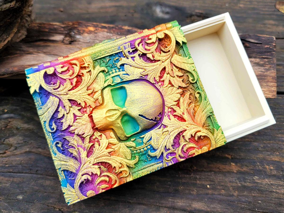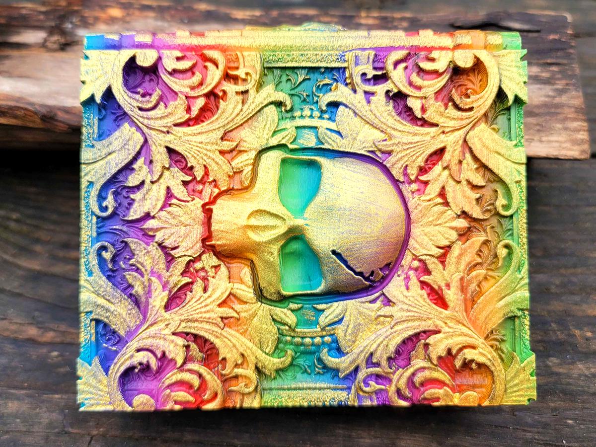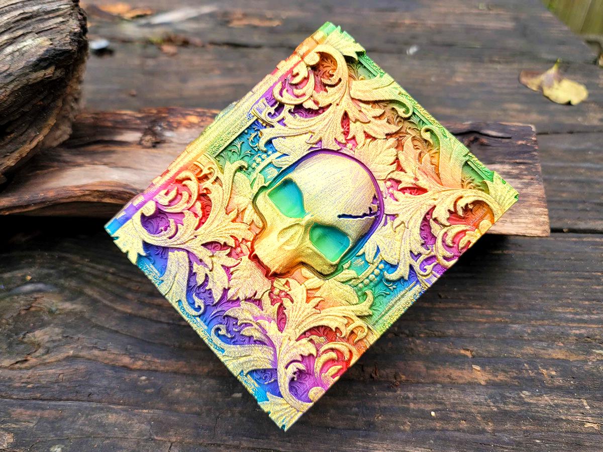 This edition features a skull surrounded by mystical and mysterious flourishes, the perfect accessory for anyone who likes to dance with death. It is printed in a rainbow gradient and brushed in a sparkly gold that makes it truly unique.