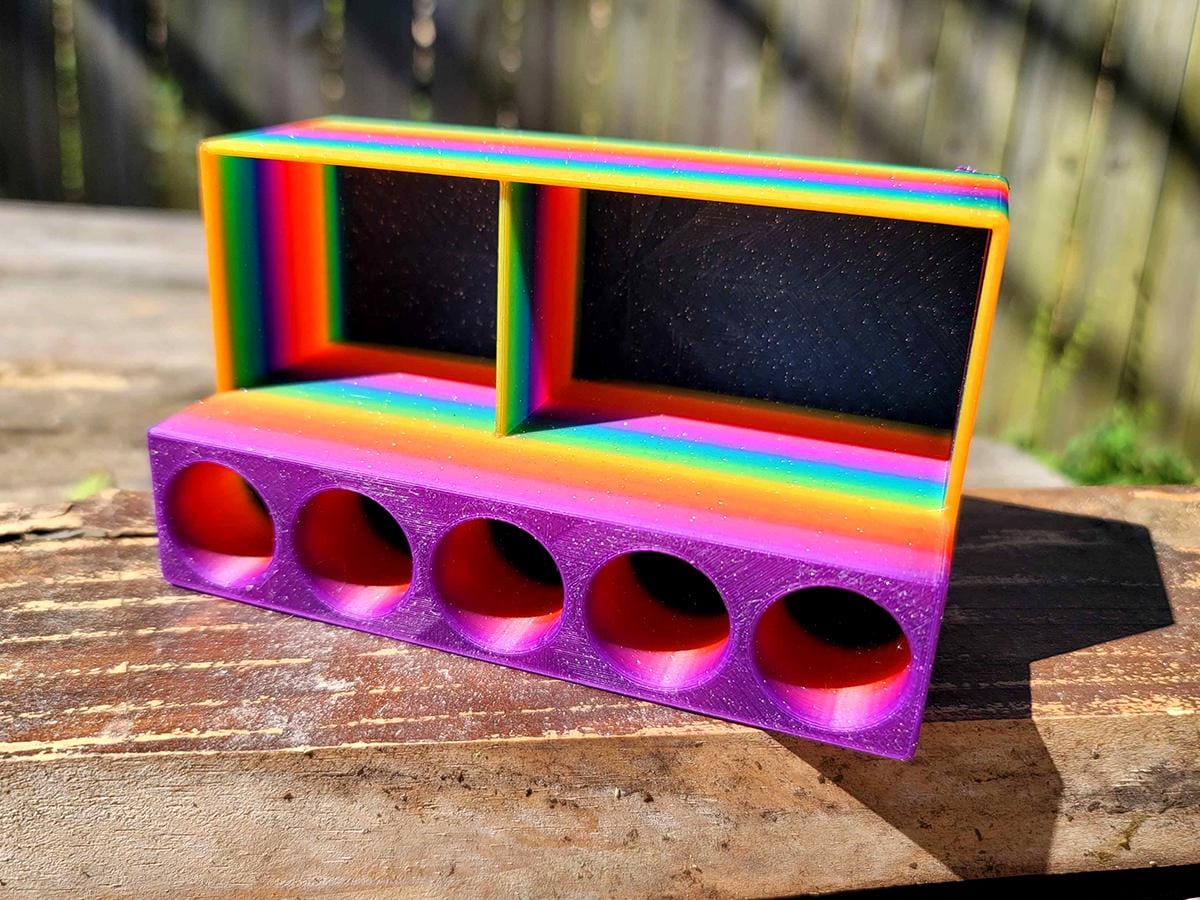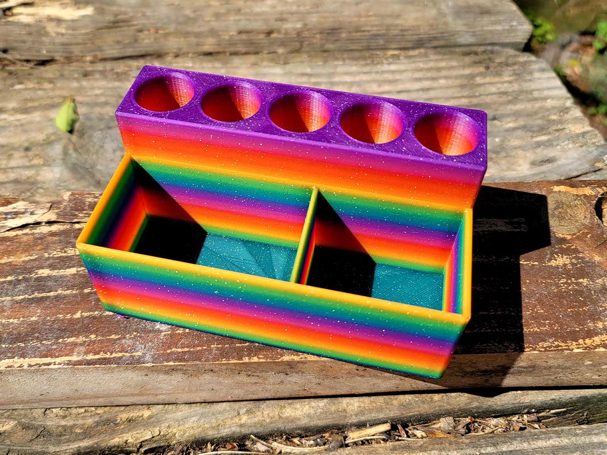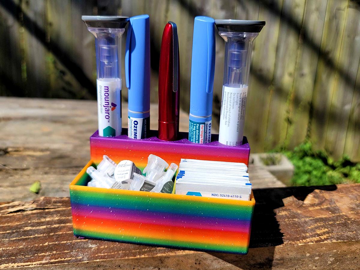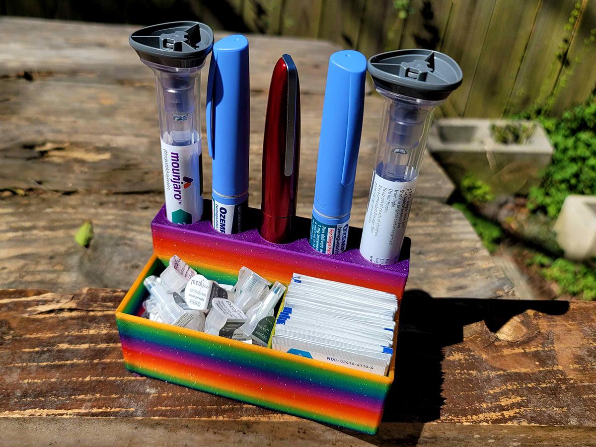A simple organizing stand that can hold up to 5 insulin, GLP-1, or other injection pens, as well as pen needles & alcohol swabs. (Or anything else you might want to put in the front containers!)