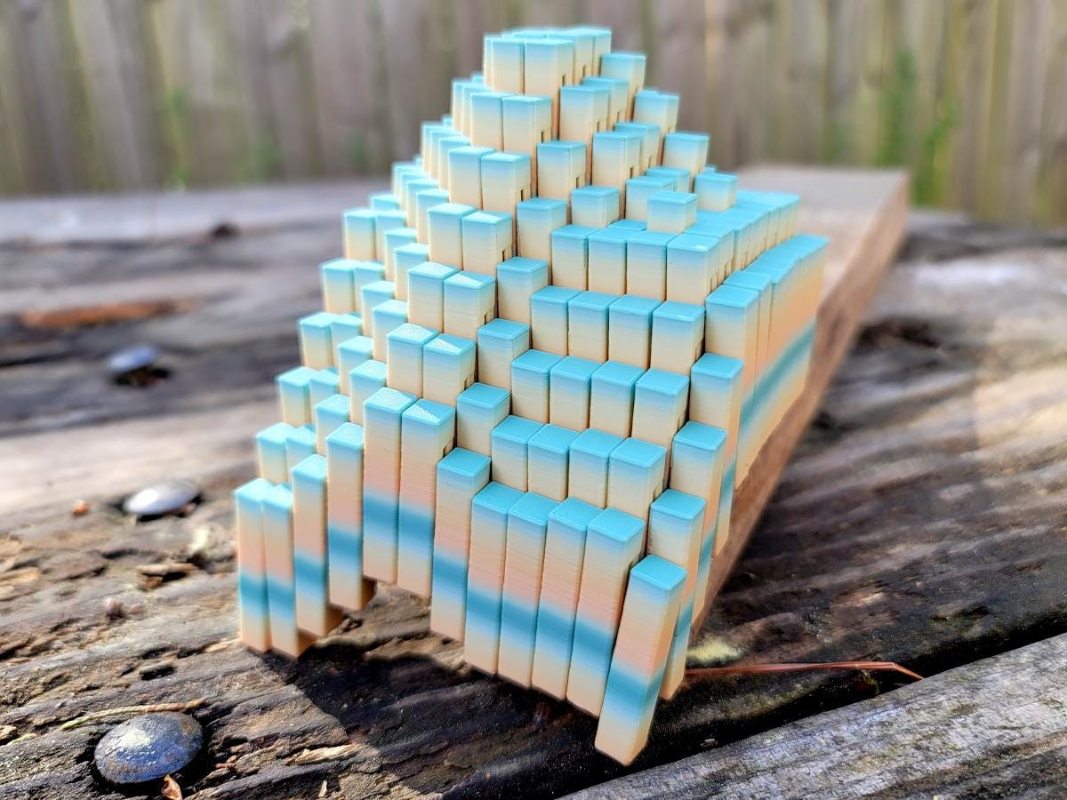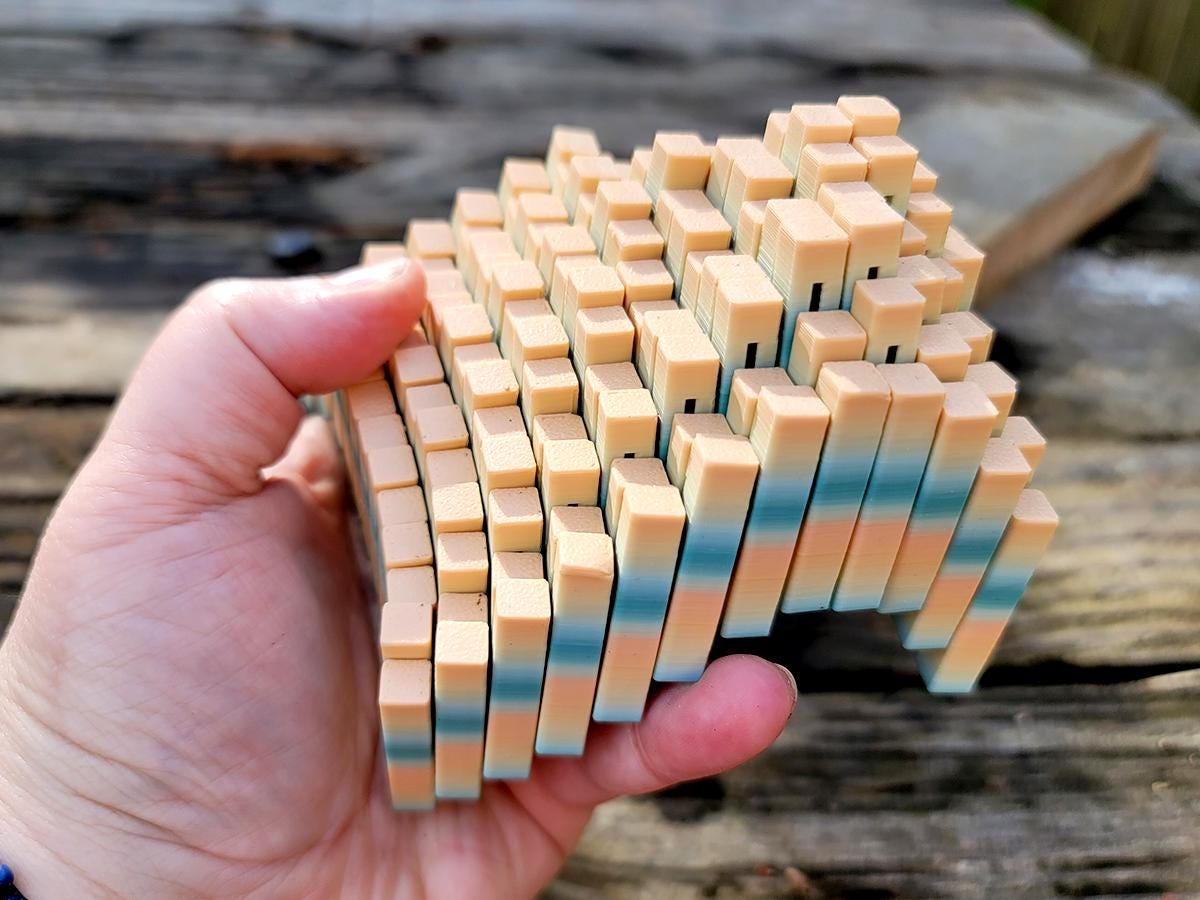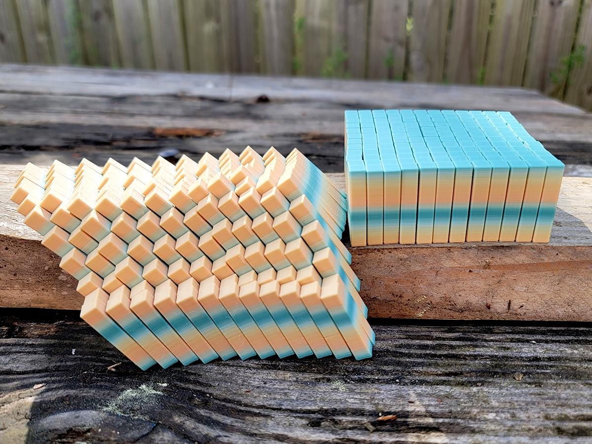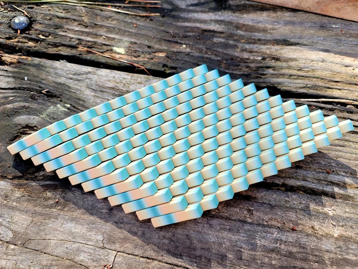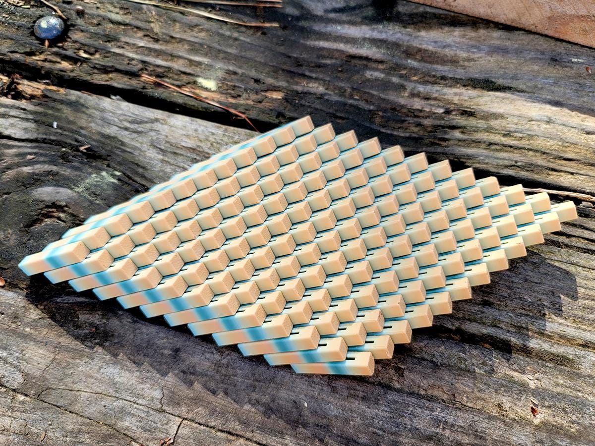 These fidget cubes are a handful! Made up of 144 interlocking rectangular columns, they expand, contract, twist and create new shapes. In cube form, it is roughly 3.5" x 3.5" x 1.5", but when you expand it to its fully diamond shape it is almost twice that size!