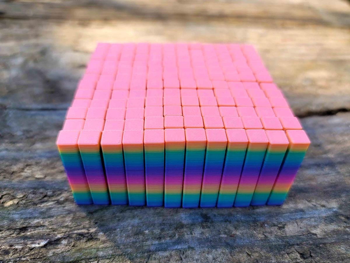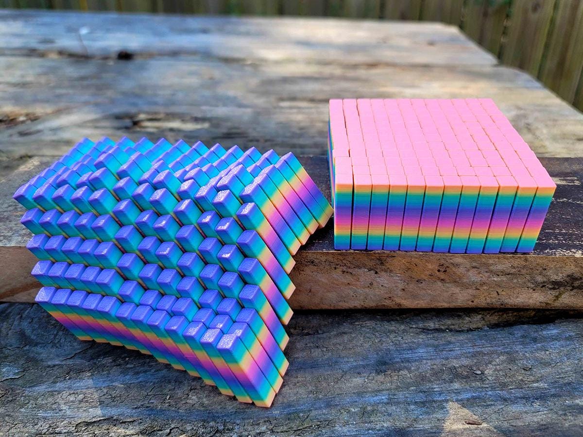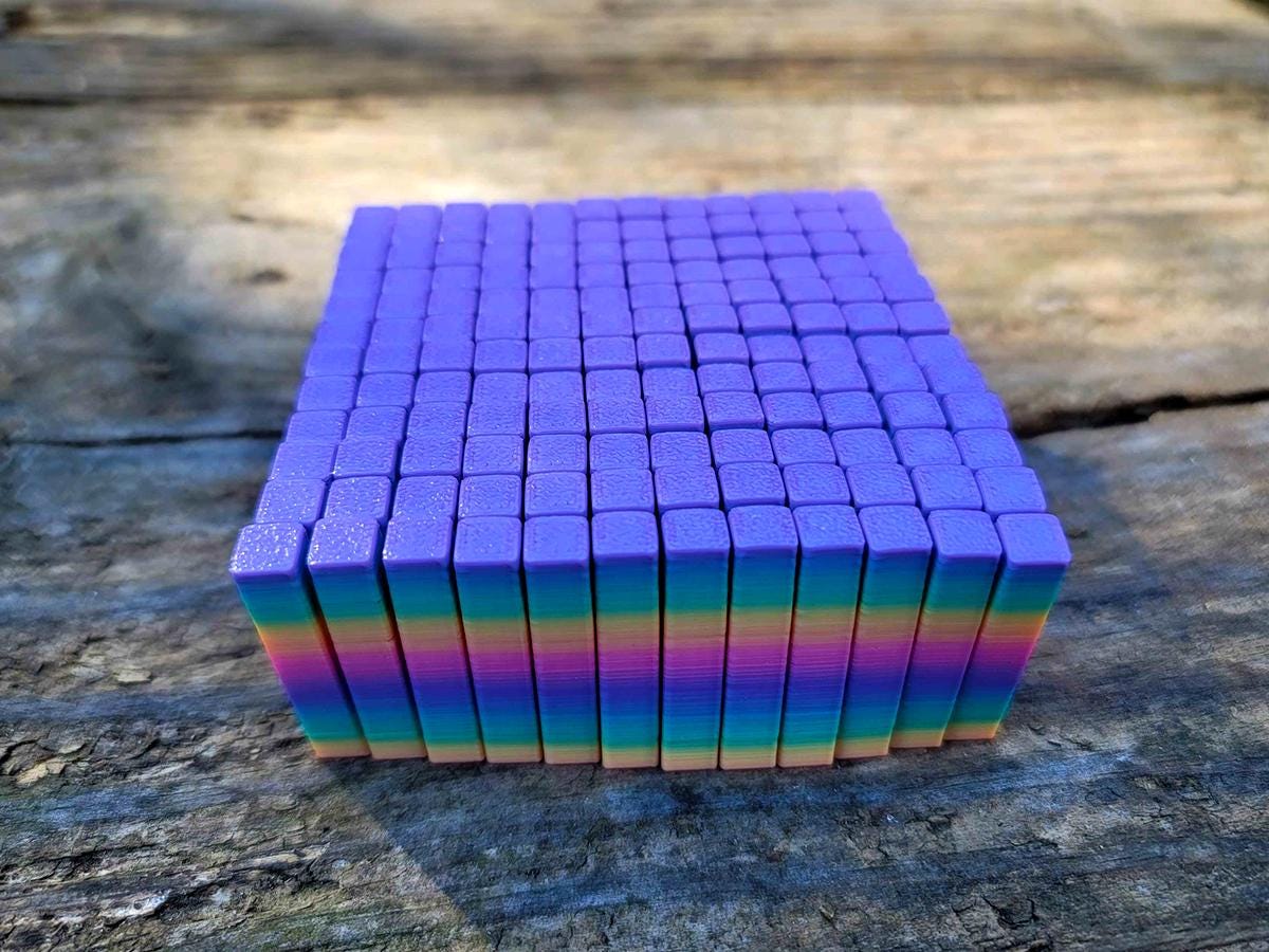 Because of the nature of gradients, the cube you receive may have the rainbow start and stop at different points, resulting in different colors on the top & bottom! But every one will have two full rainbow gradients!