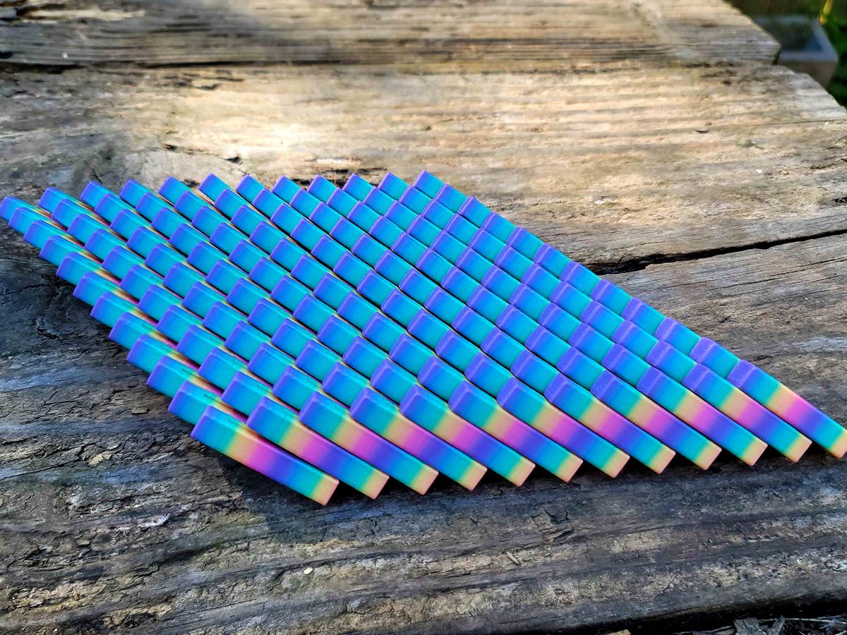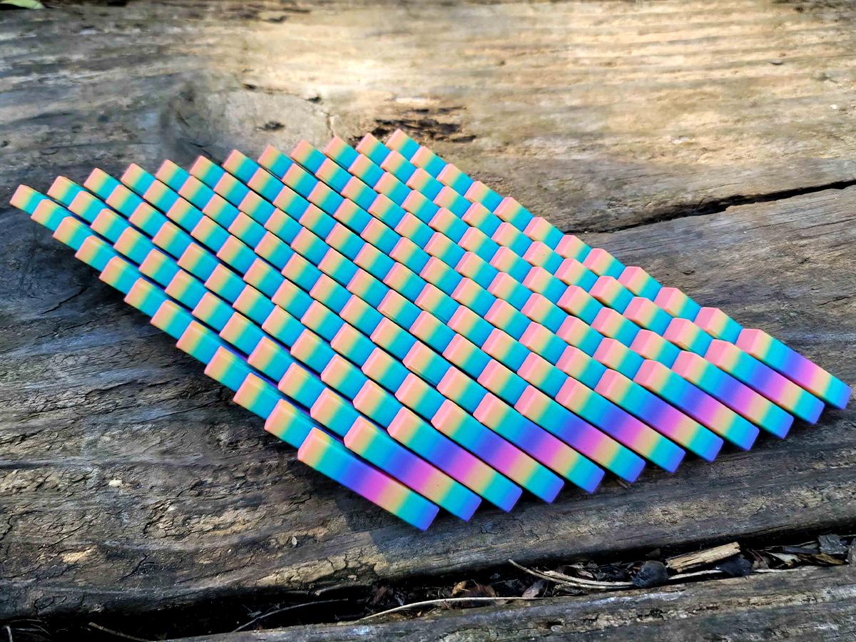 An absolutely beautiful fidget but actually a beautiful piece of art, too! The pieces move like waves and the colors fit that movement. Beautiful. Get one for your office- you boss and coworkers will remember you because of this piece!!! The colors are also chosen so well to create various rainbow effects when the piece is moving. Absolutely stunning piece!