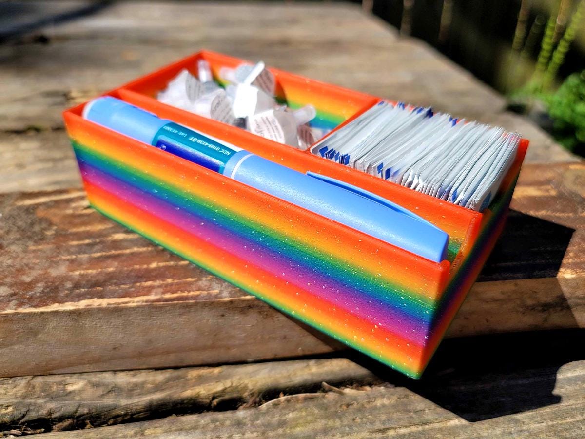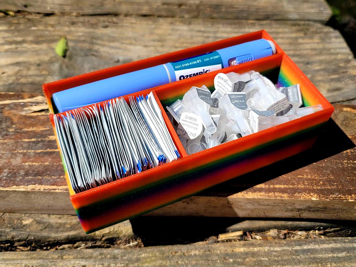 A simple organizer meant for a single injection pen and alcohol swabs and pen needles. Keep everything you need in one convenient (and cute!) place!