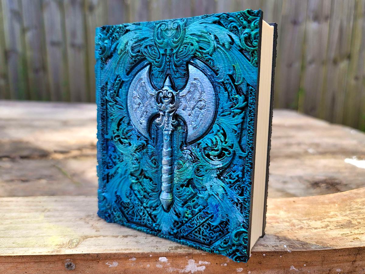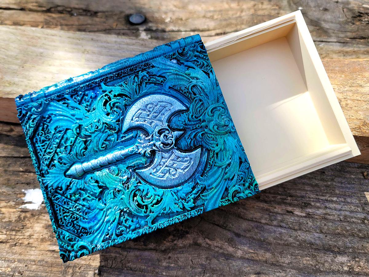 This edition features a double-headed axe surrounded by flourishes, perfect for the barbarian in your gaming party, or honestly anyone who just really wishes they had a giant axe! (Who doesn't, these days?) It is lovingly hand-painted in various shades of blue and green, with a sparkle silver shine for the axes.