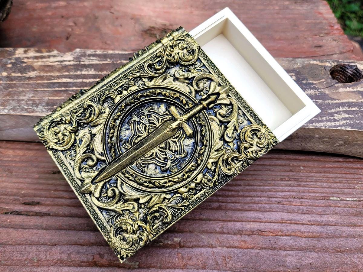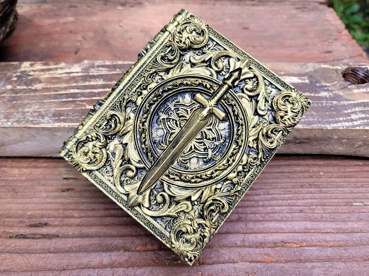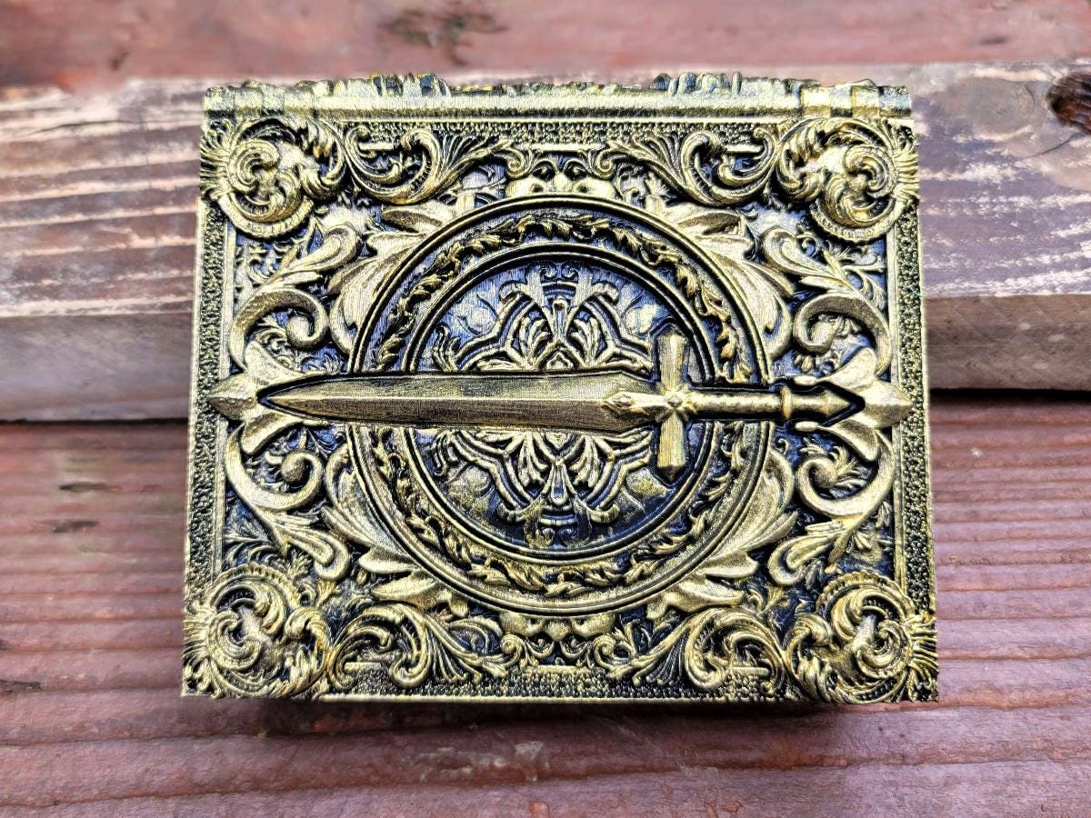 This edition features a steely sword surrounded by flourishes, perfect for the noble warrior or chivalrous knight in your gaming party, or anyone who just likes stabby things! It is lovingly hand-painted in an antique gold.