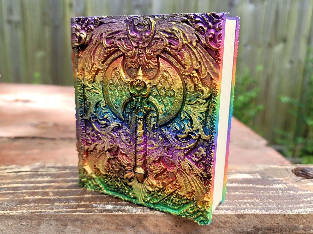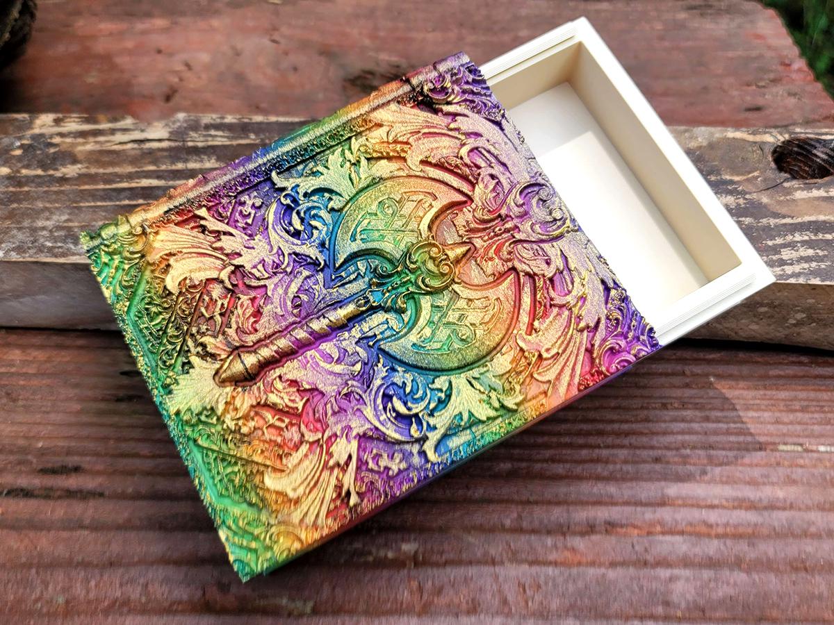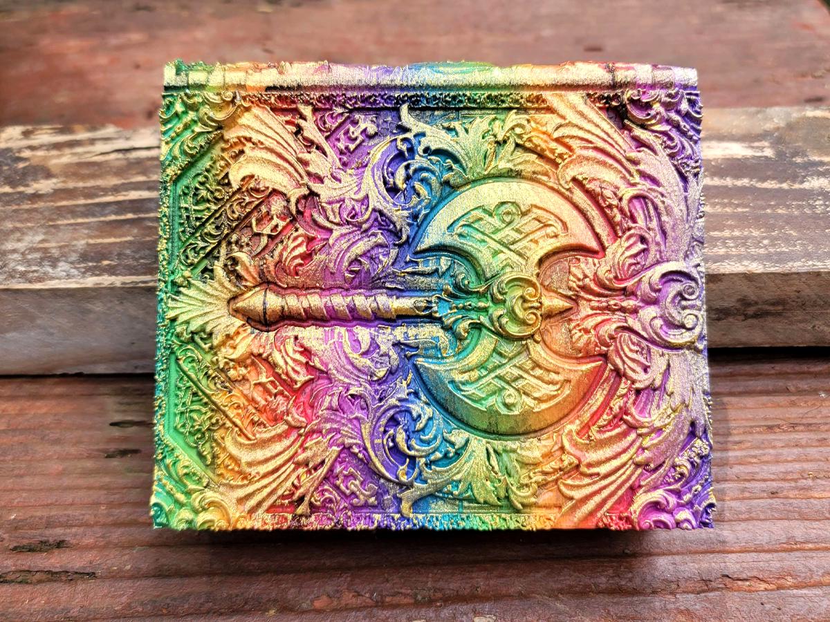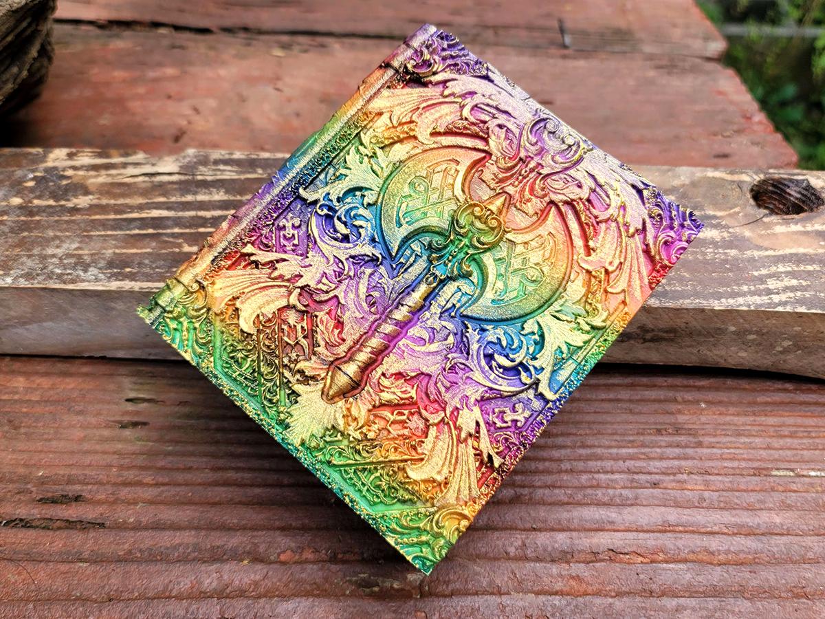This edition features a double-headed axe surrounded by flourishes, perfect for the barbarian in your gaming party, or honestly anyone who just really wishes they had a giant axe! (Who doesn't, these days?) It is printed in a rainbow gradient and brushed in a sparkly gold that makes it truly unique.