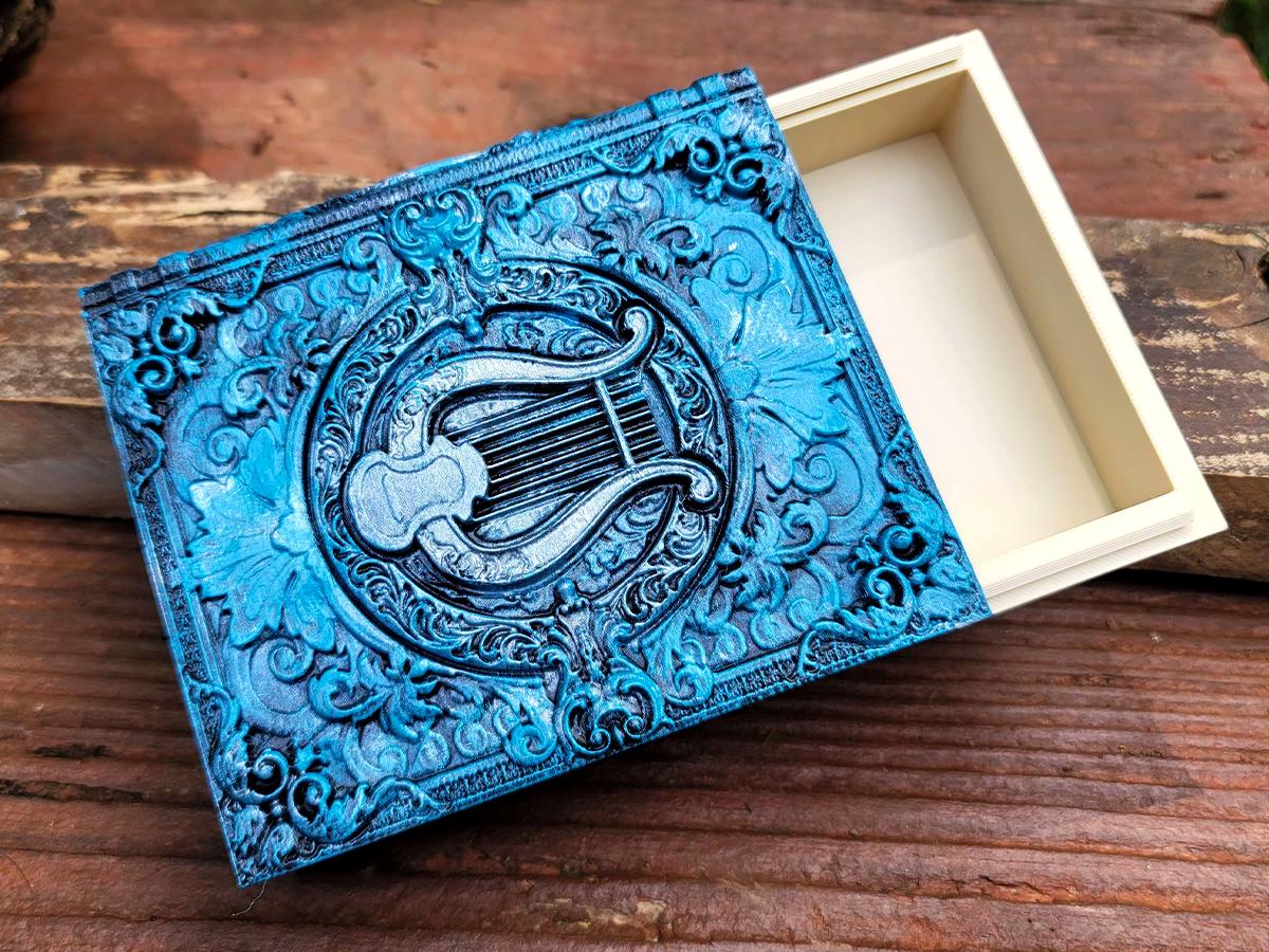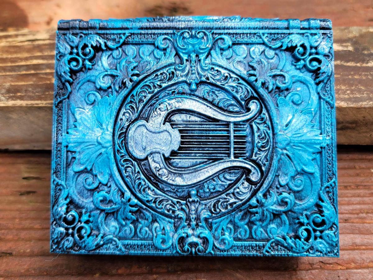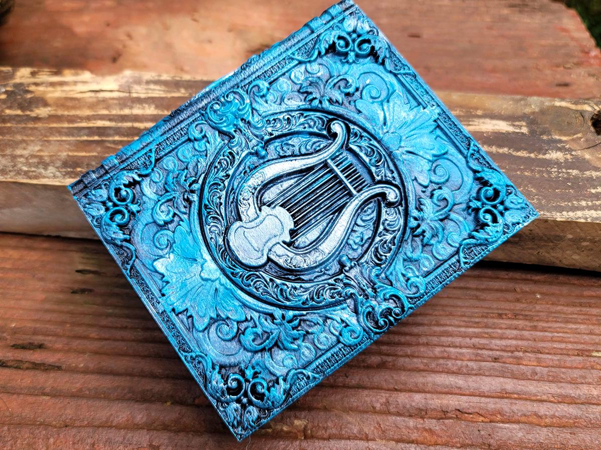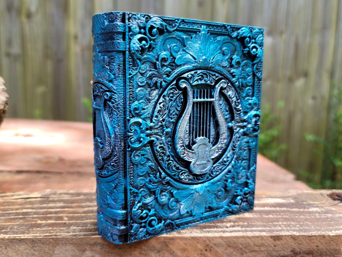 This edition is for the storytellers and the songsters! Give the bard in your life a book blessed by music, featuring a lyre surrounded by decorative scrolls. It is lovingly hand-painted in various shades of blue, and burnished with a gorgeous silver.