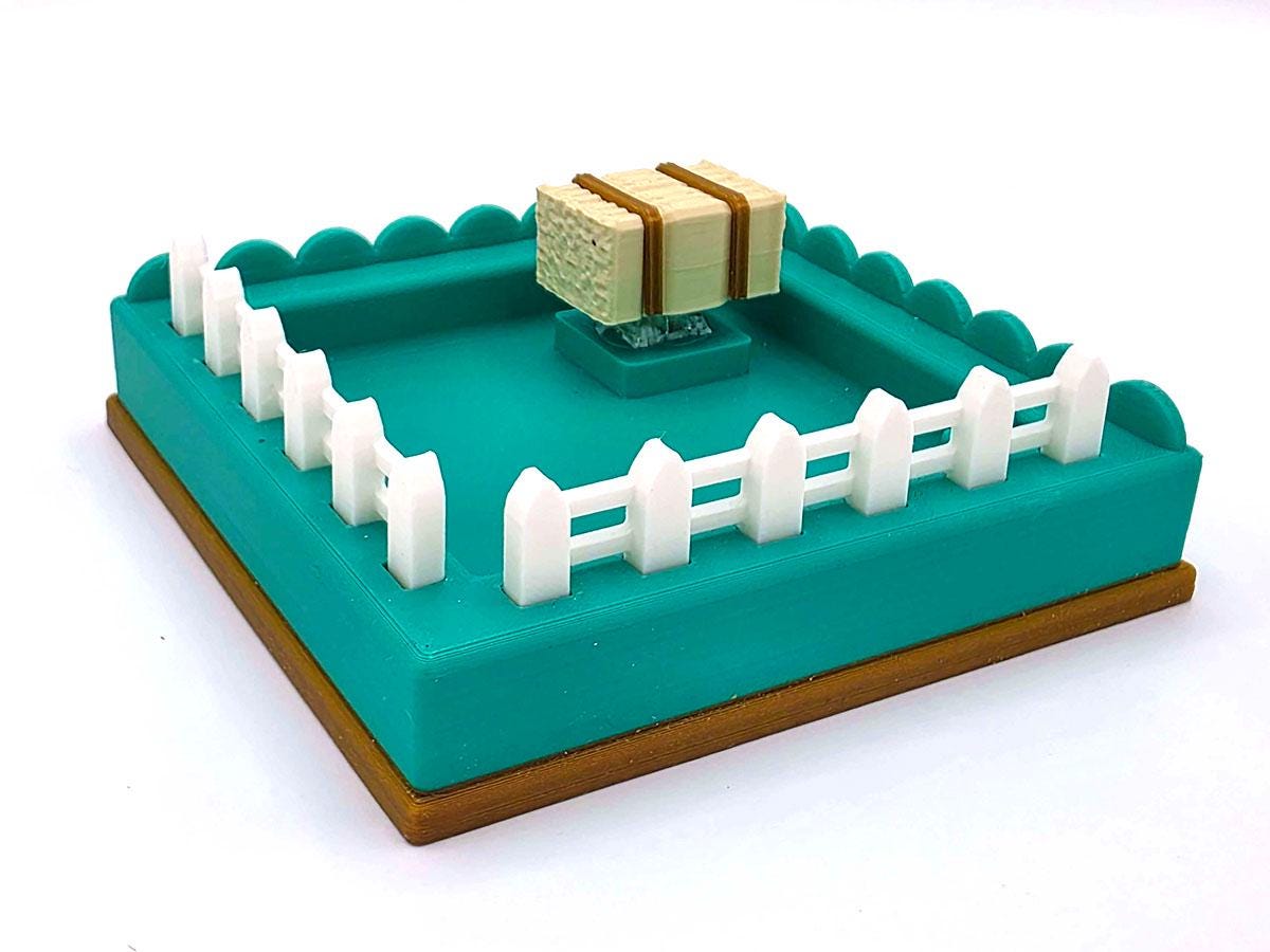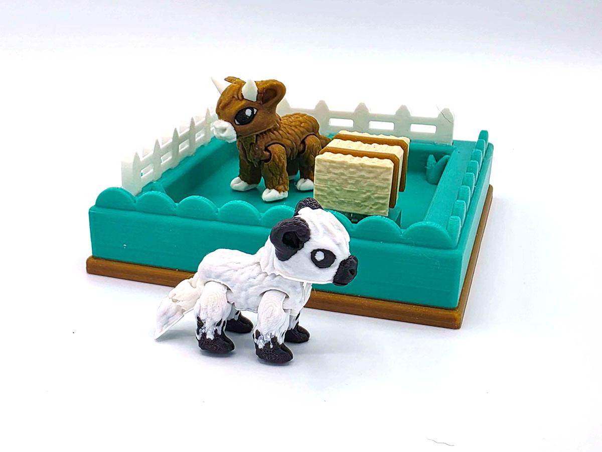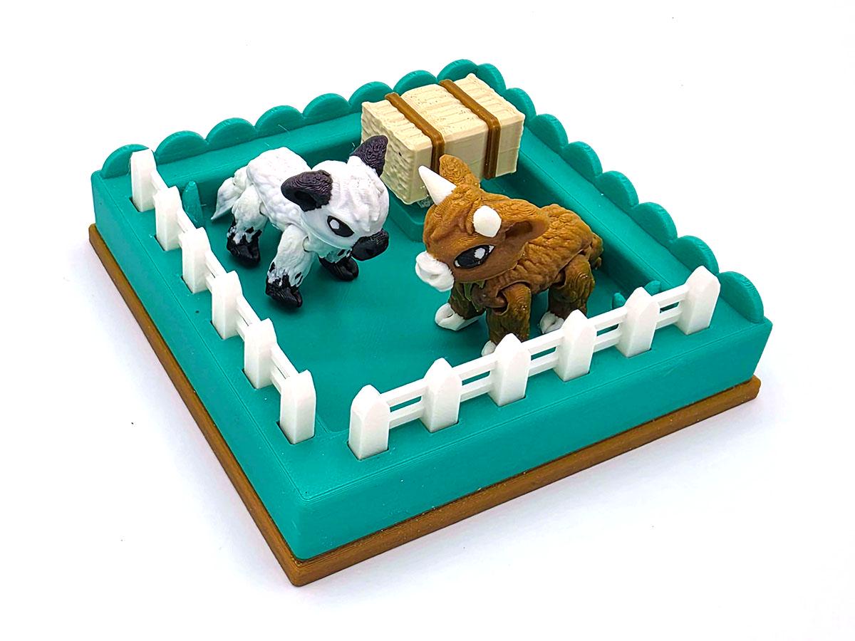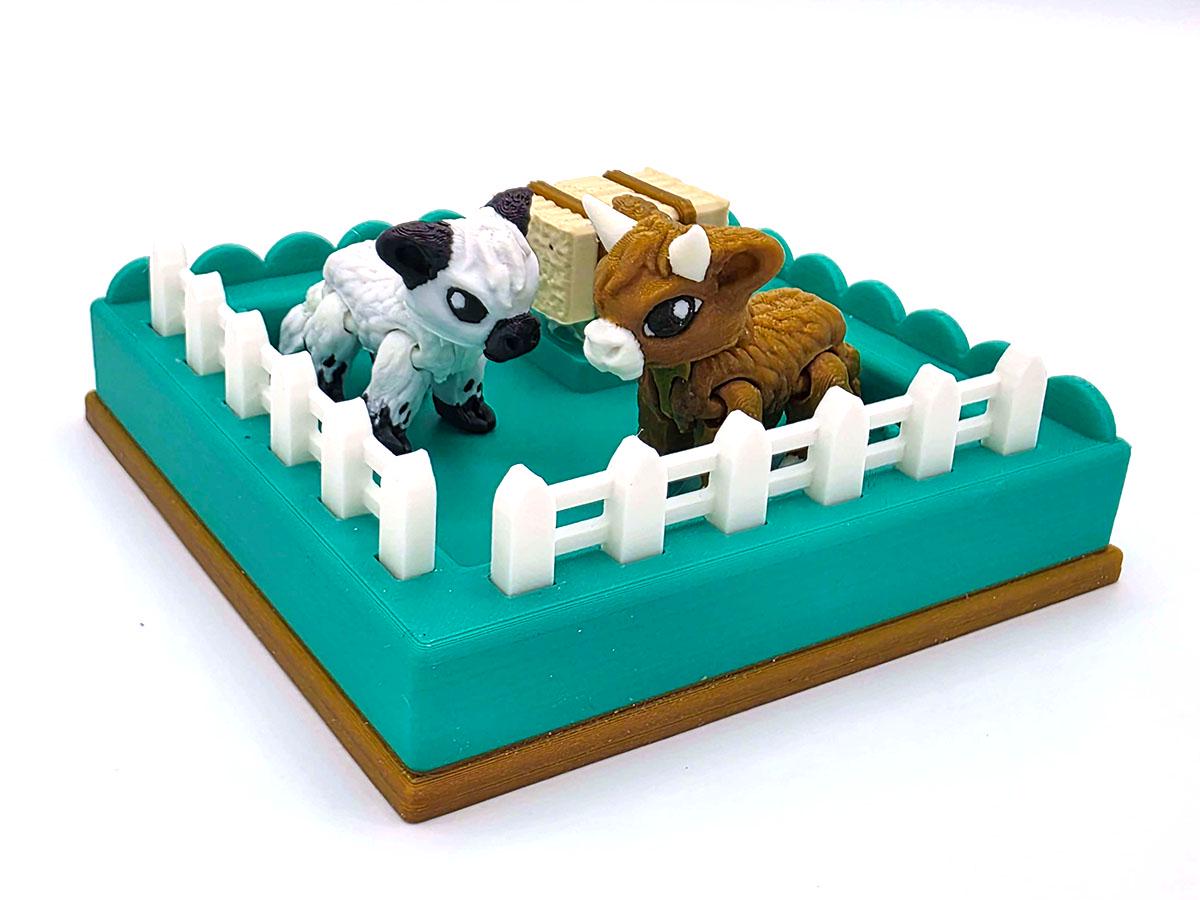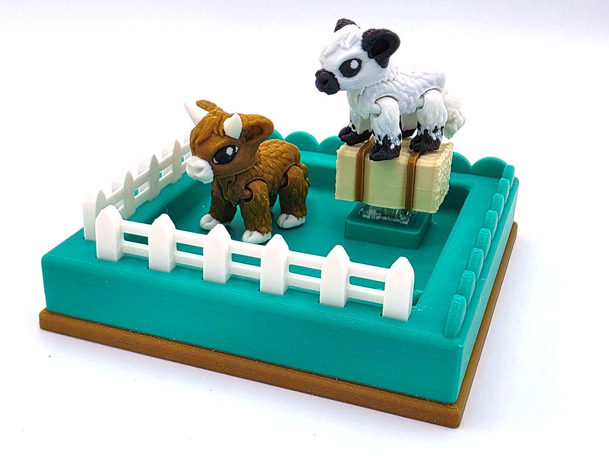 This desk toy is a combination of cute and clicky! A sweet green pasture with a white picket fence is the perfect place for two fully articulated highland cows to graze--one a shimmery brown and white, the other black and white.