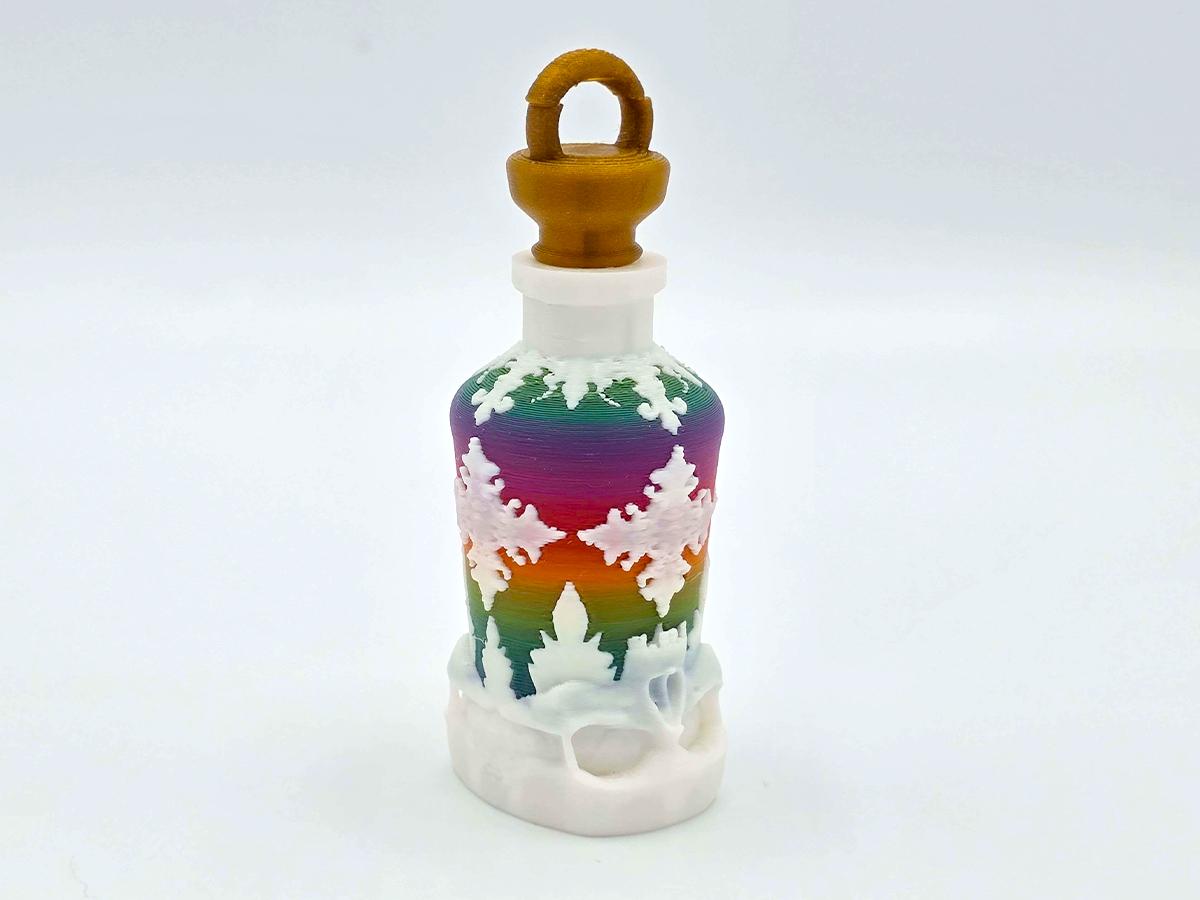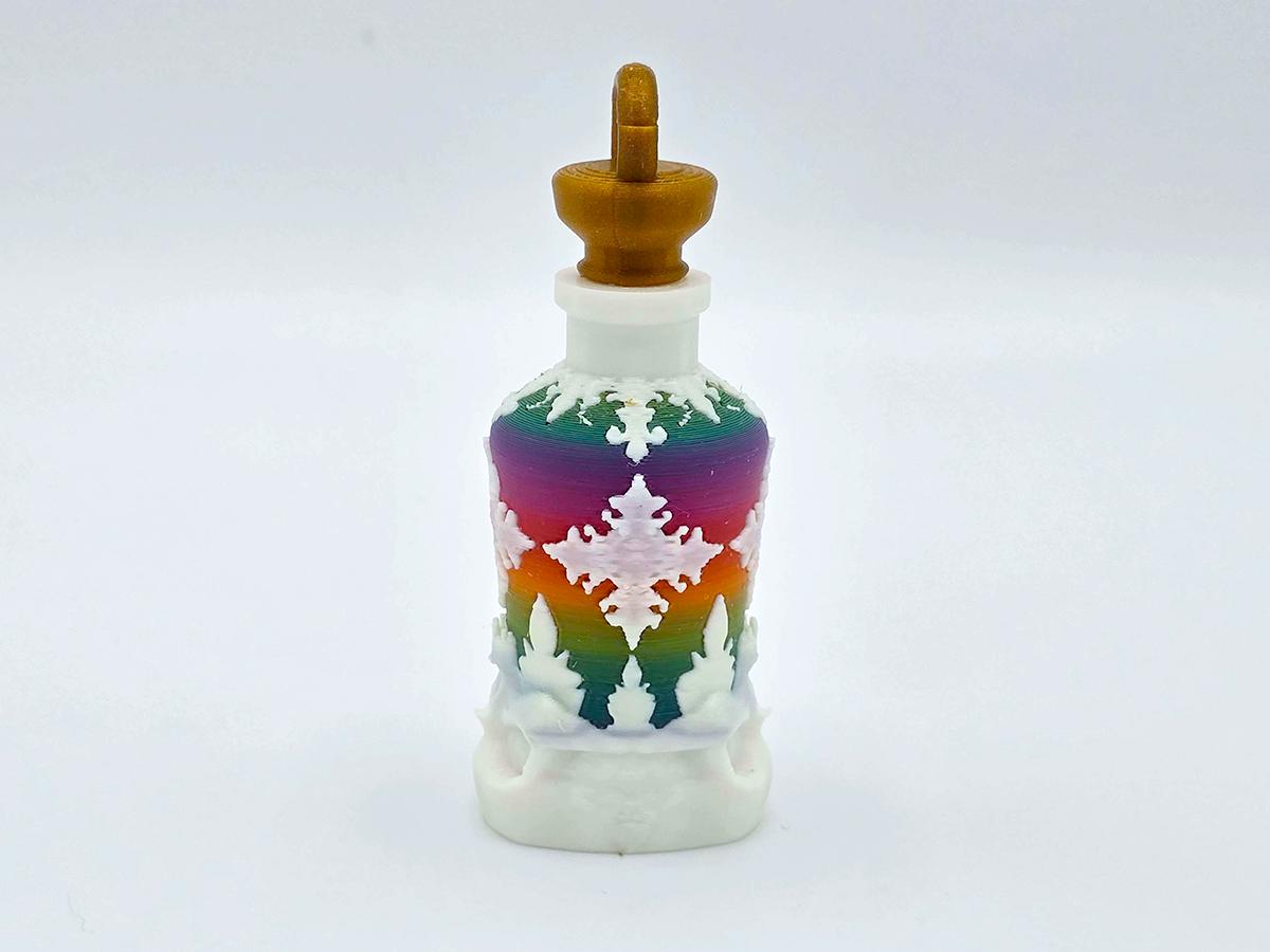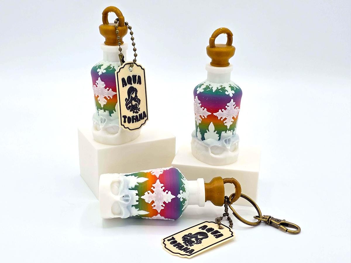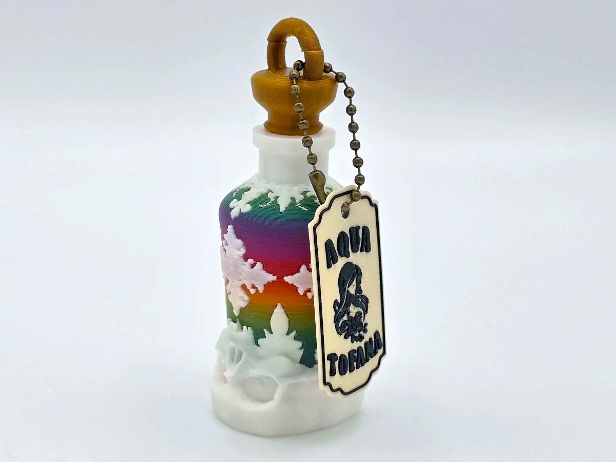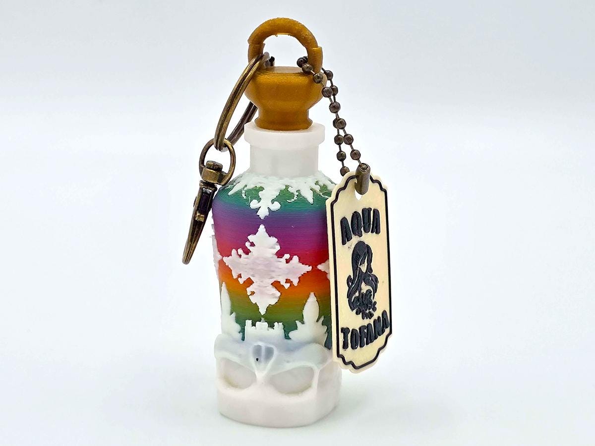 This beautiful rainbow bottle is decorated with white ornamentation and based in a skull, warning that the contents may not be for drinking. The bronze cork has a loop for the antique bronze keychain and the bonus aqua tofana label. Both can easily be removed, if you don't want the keychain or the label--and the bottle is beautiful enough just on its own.