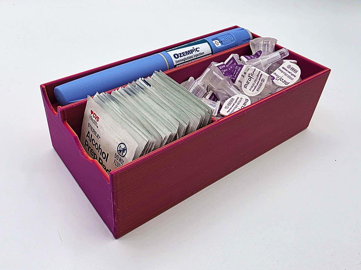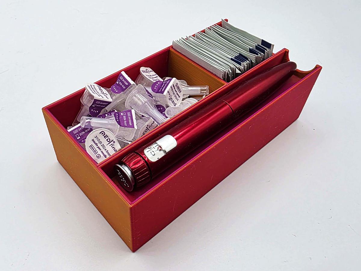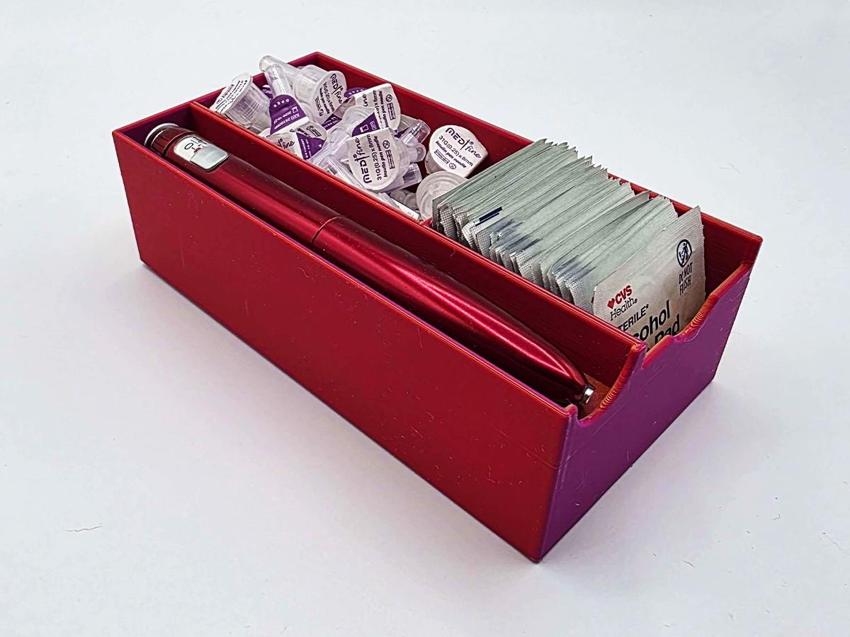 A simple organizer meant for a single injection pen and alcohol swabs and pen needles. Keep everything you need in one convenient (and cute!) place!