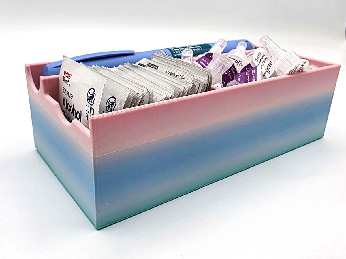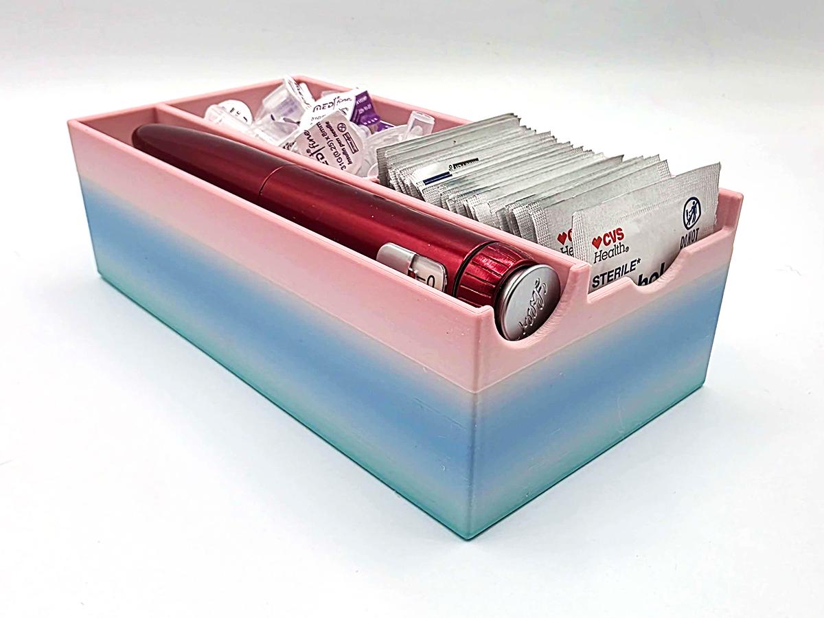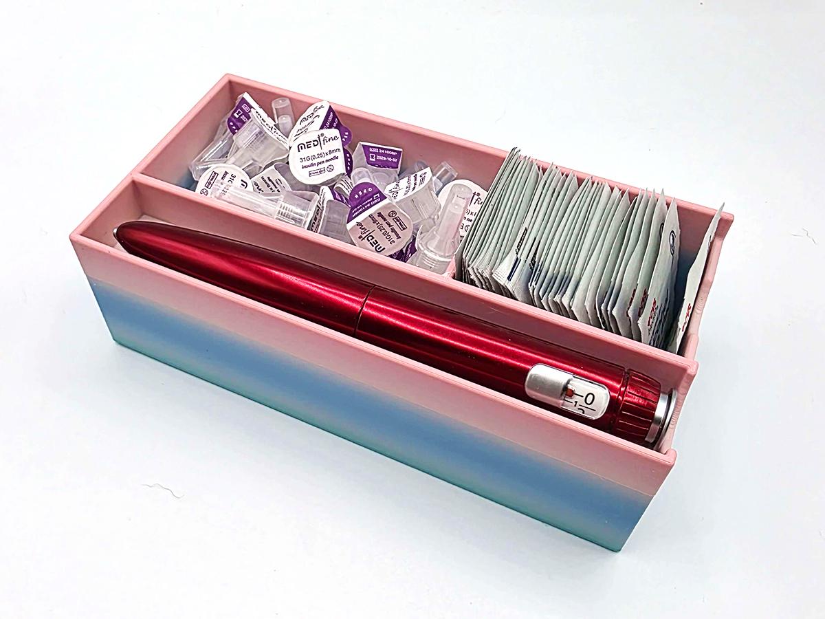 A simple organizer meant for a single injection pen and alcohol swabs and pen needles. Keep everything you need in one convenient (and cute!) place!