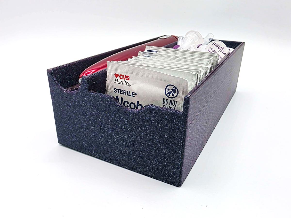 A simple organizer meant for a single injection pen and alcohol swabs and pen needles. Keep everything you need in one convenient (and cute!) place!