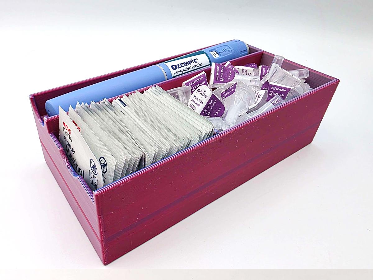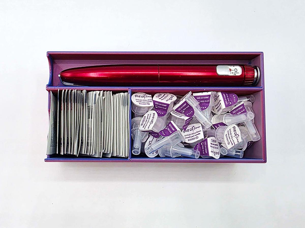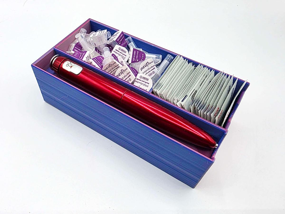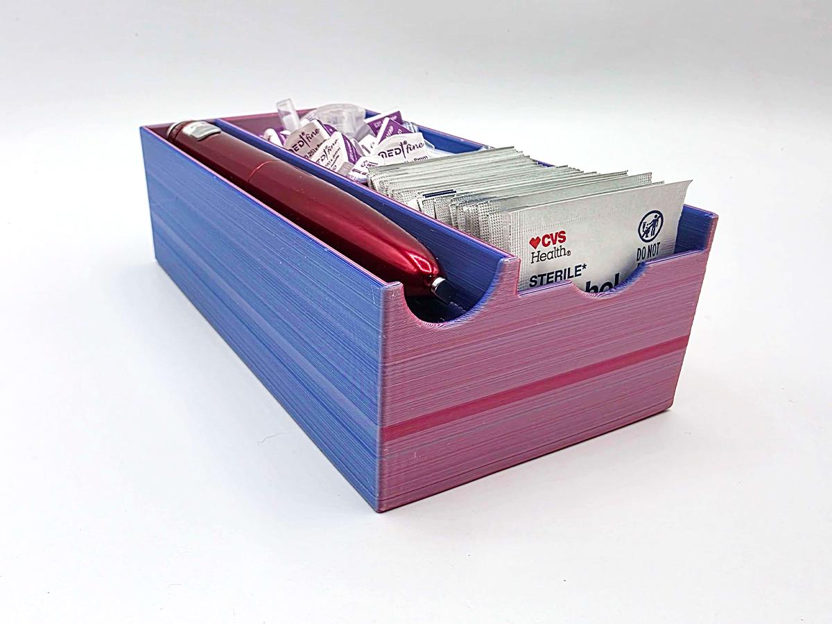A simple organizer meant for a single injection pen and alcohol swabs and pen needles. Keep everything you need in one convenient (and cute!) place!