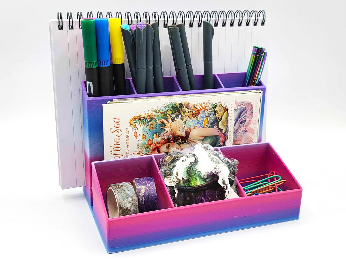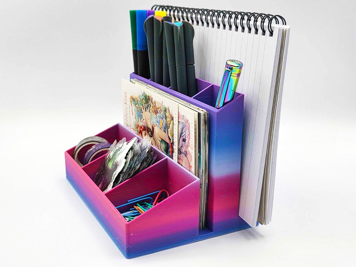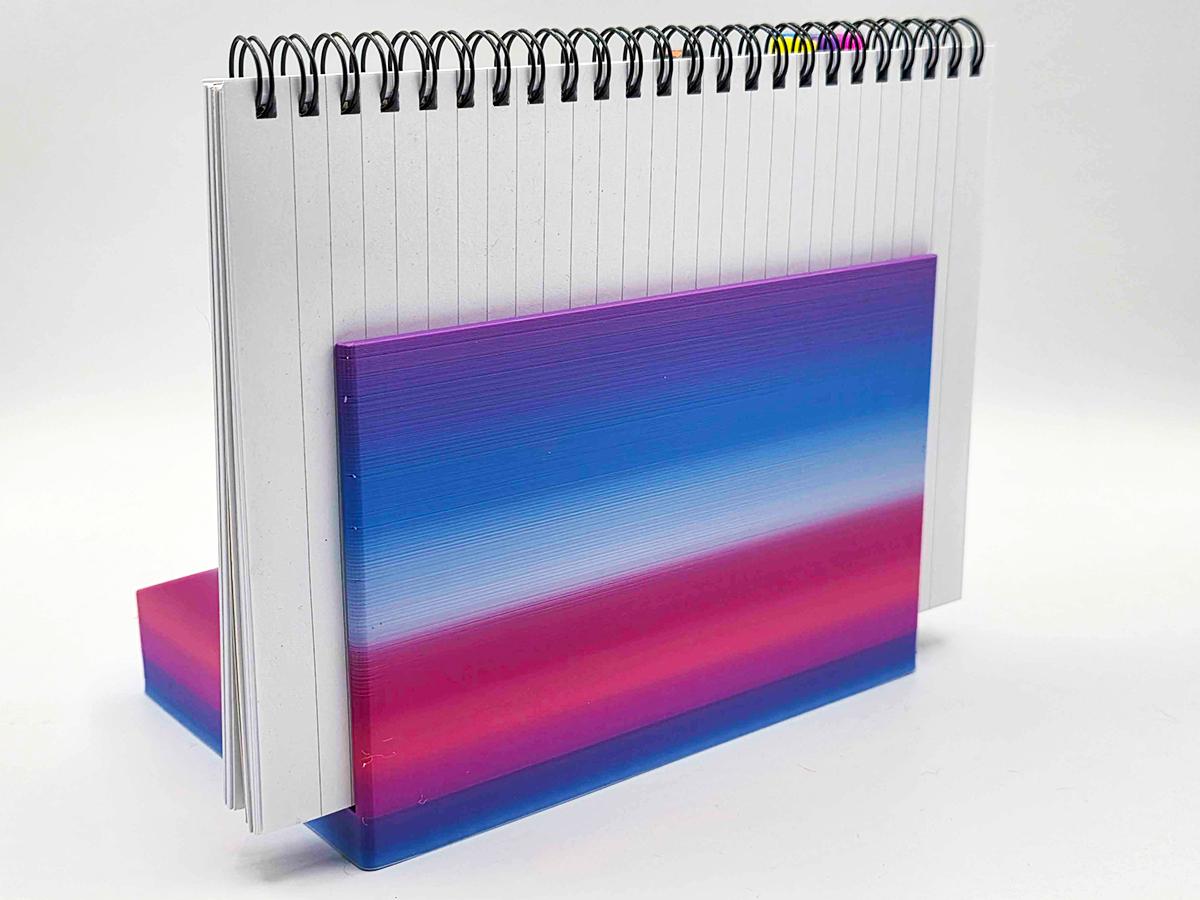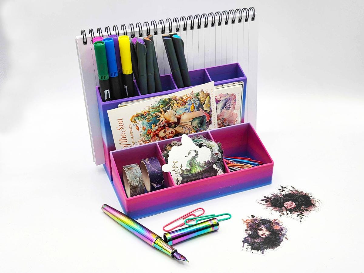 A basic organizer for your desk designed to hold a bullet journal or planner (5.5x8 or 6x9 fit best, but larger notebooks will probably work as well!) Because of the nature of gradients, your organizer may not have the colors start & stop on the same places on the organizer, but you will get the full color spectrum!