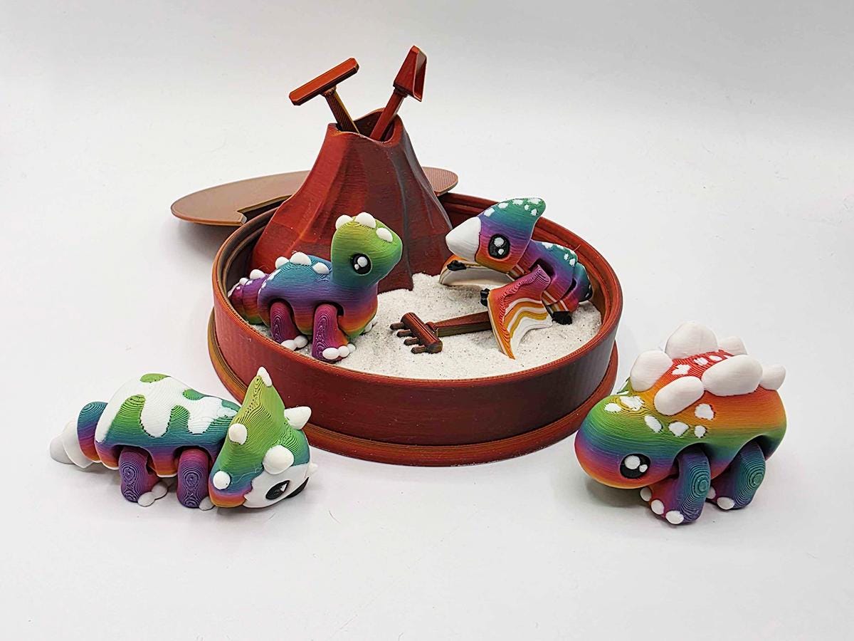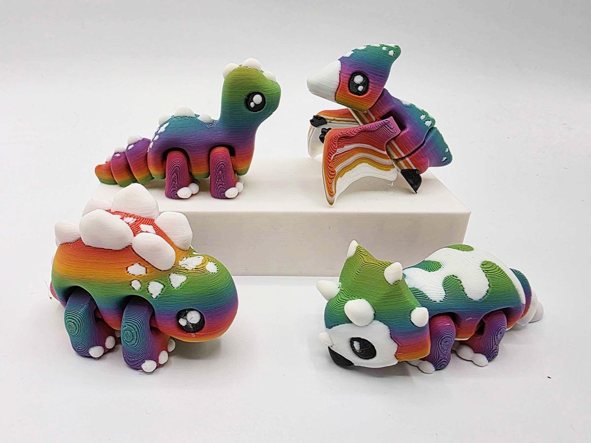* Four articulated dinosaurs printed in a gorgeous rainbow gradient. (Dinos inspired by--but perhaps not scientifically authentic to--the stegosaurus, pterodactyl, triceratops, and brontosaurus!)