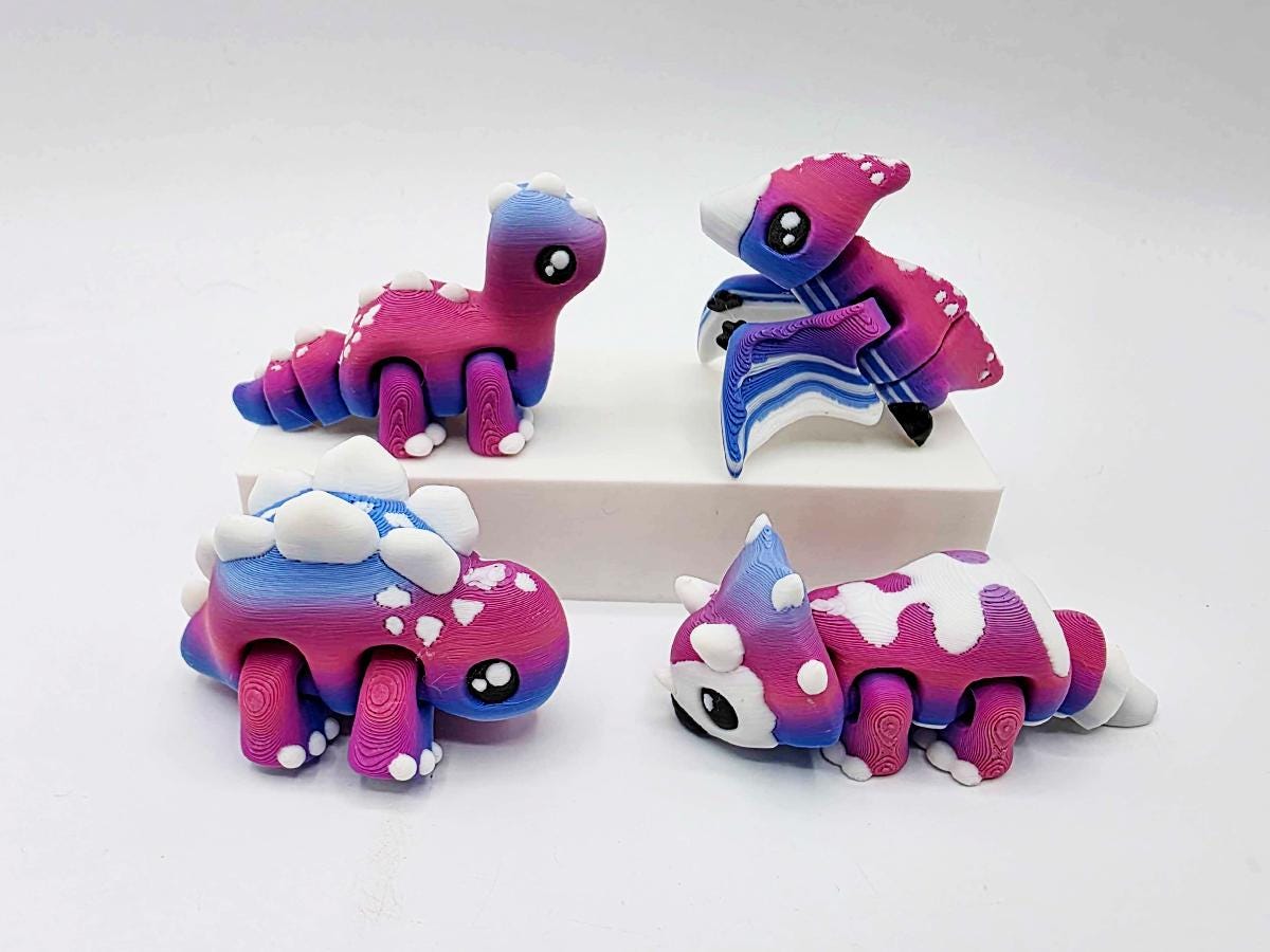 * Four articulated dinosaurs printed in a gradient of pinks, purples, and blues. (Dinos inspired by--but perhaps not scientifically authentic to--the stegosaurus, pterodactyl, triceratops, and brontosaurus!)