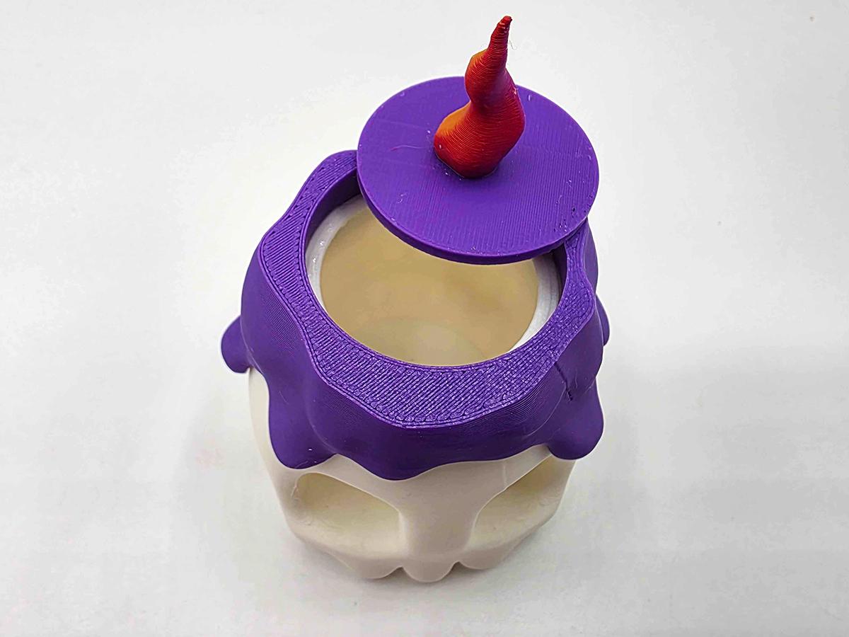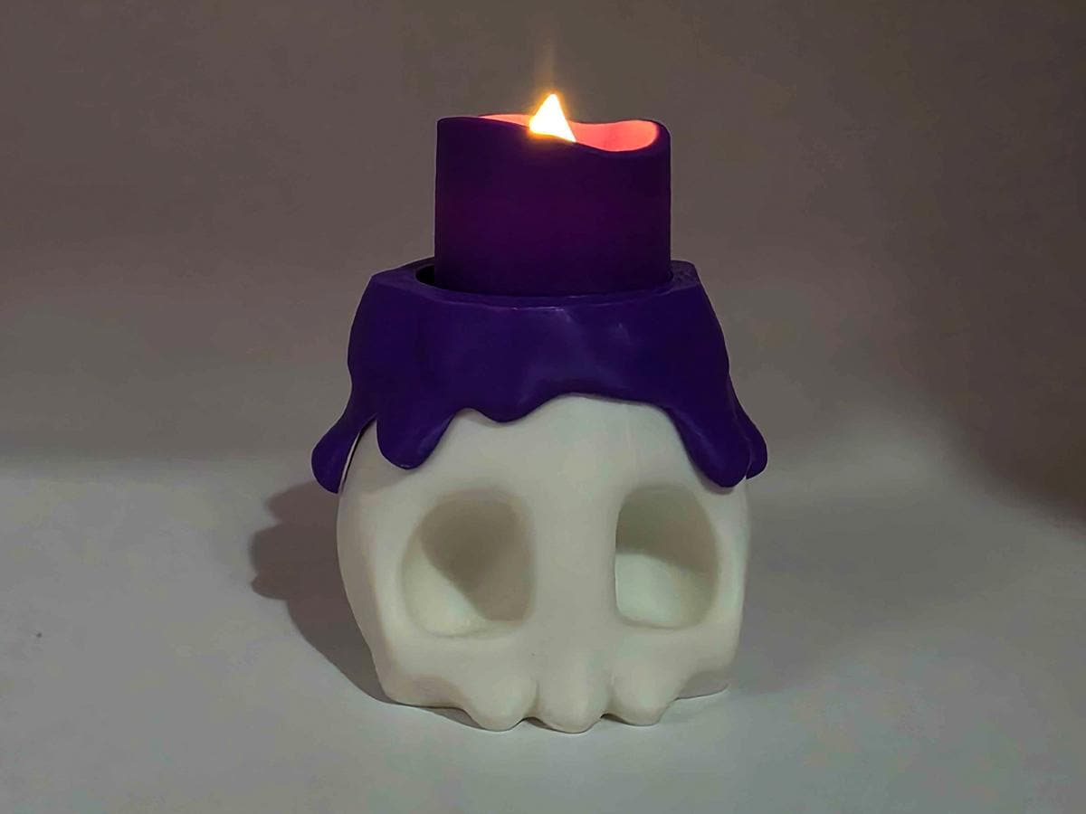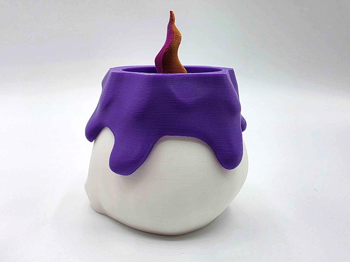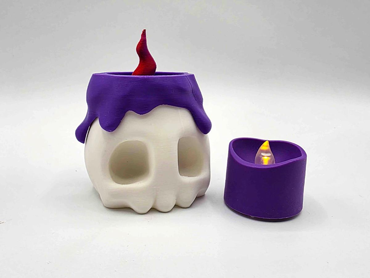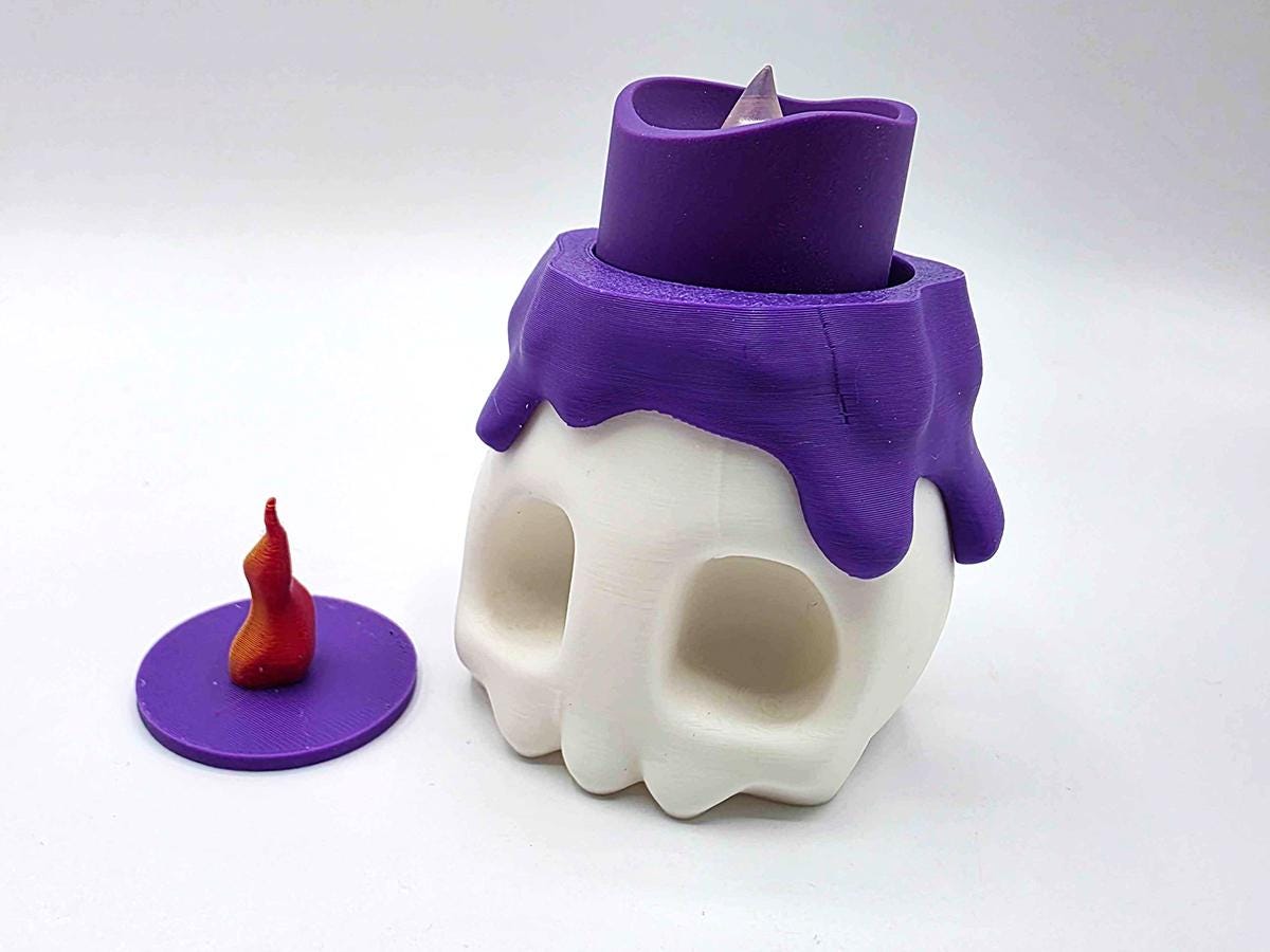 The white base comes with a fake melted wax rim in a gorgeous purple, and two flame options: keep it simple with the 3D printed flame, or flip it over (or just remove it entirely) and put a matching purple LED tealight in its place!