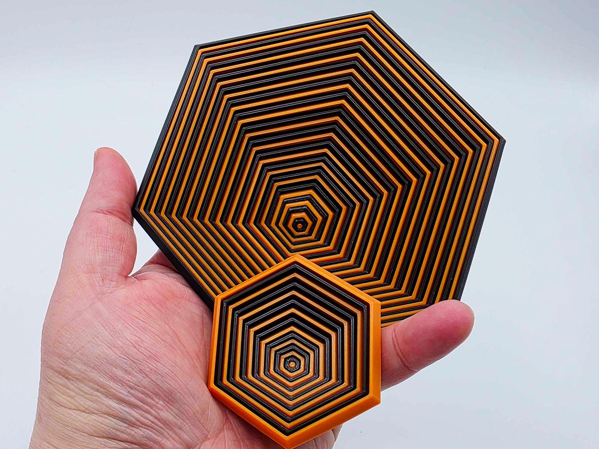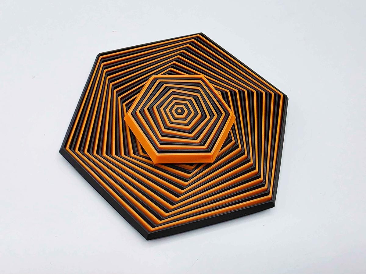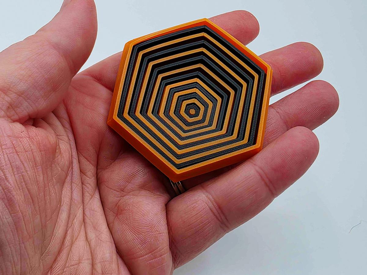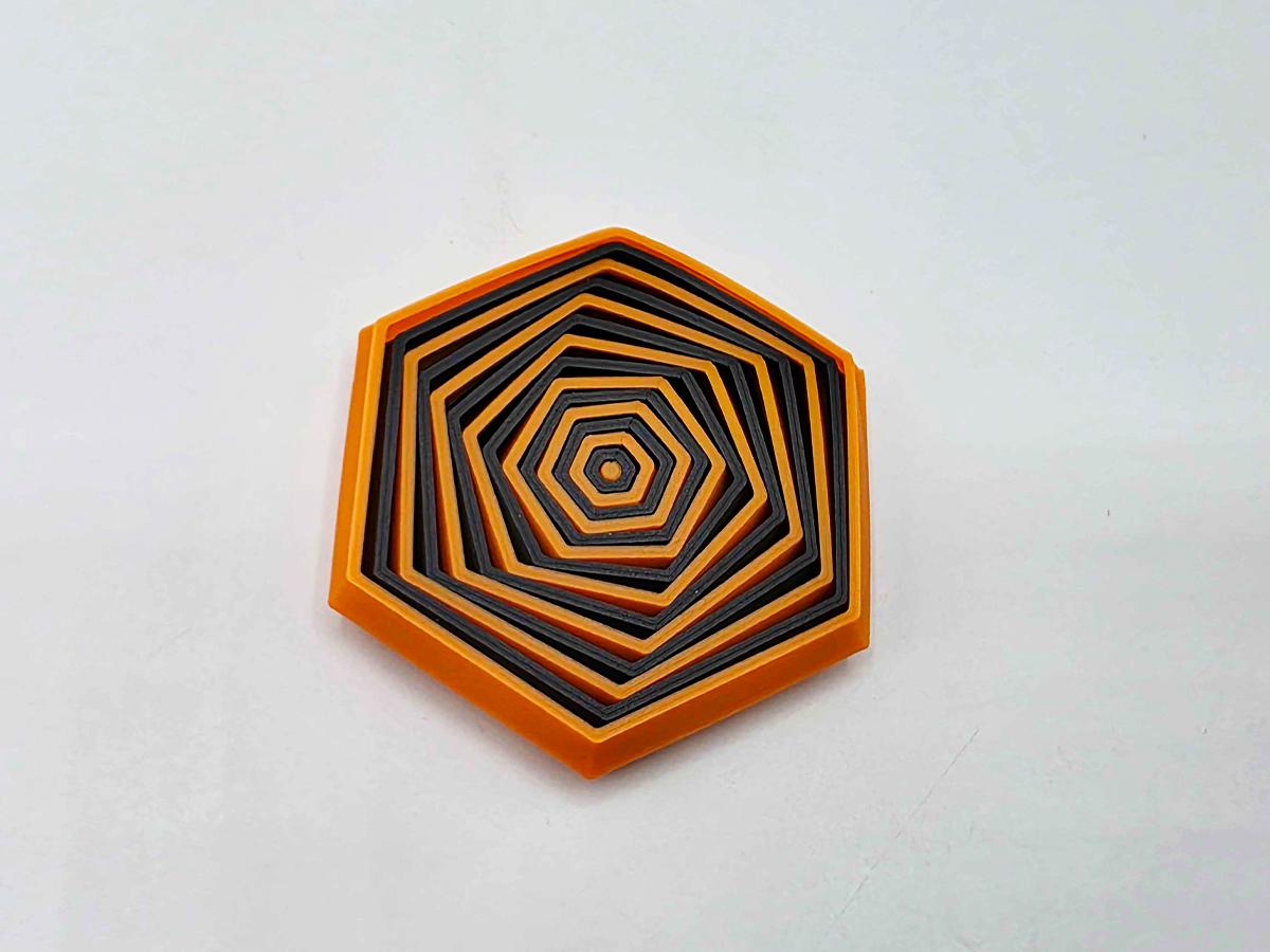 This hexagon shaped fidget toy is hypnotic--dual color, with alternating stripes of orange and black. You can twist them, flip them, and telescope them. They also make the most amazing sound. (See video!)