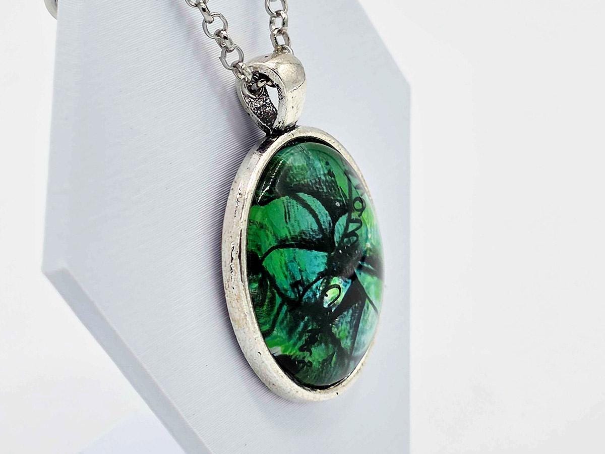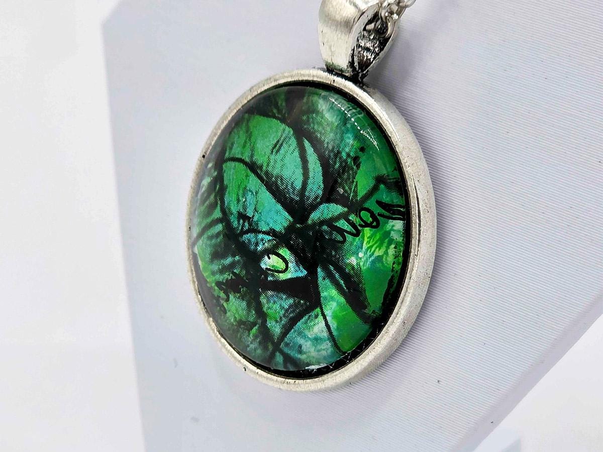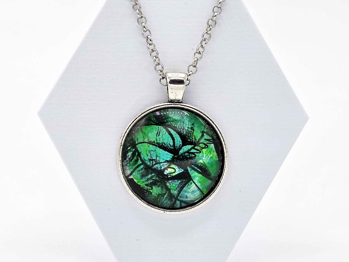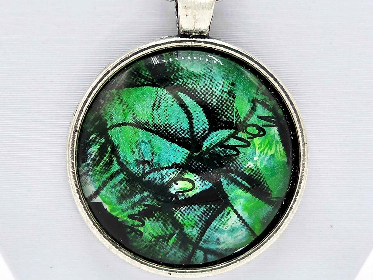 The pendant is 1" x 1" painted glass cabochon.