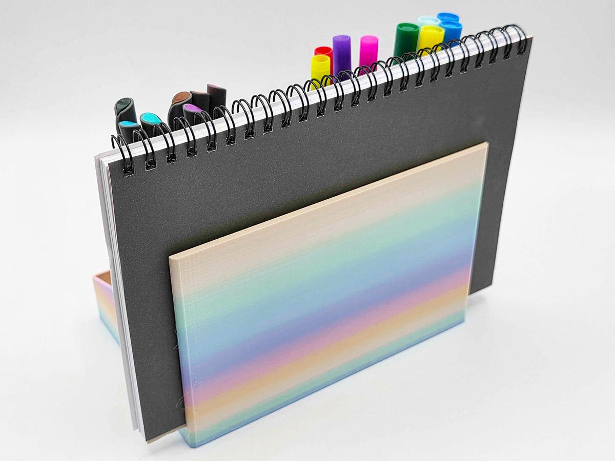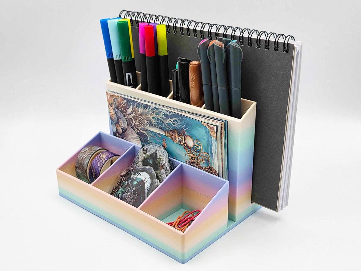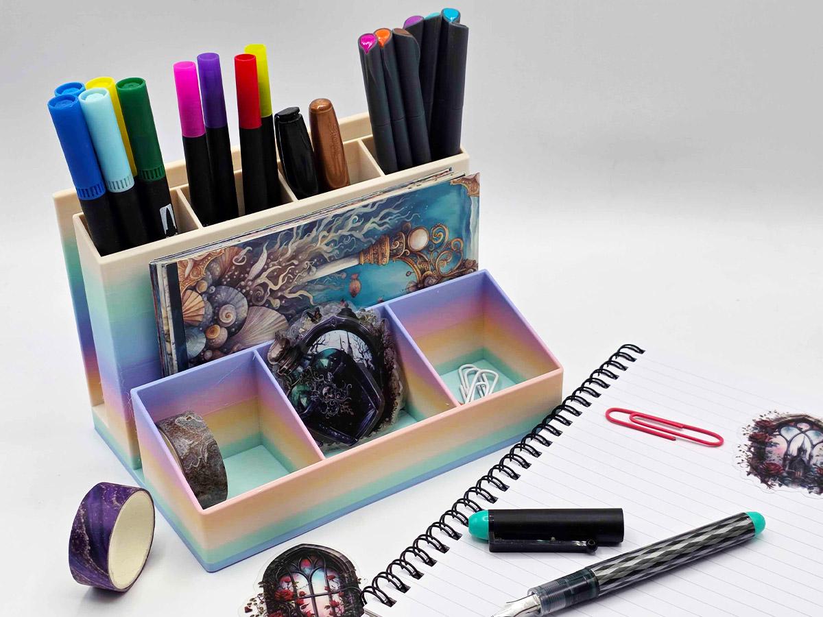 A basic organizer for your desk designed to hold a bullet journal or planner (5.5x8 or 6x9 fit best, but larger notebooks will probably work as well!) Because of the nature of gradients, your organizer may not have the colors start & stop on the same places on the organizer, but you will get the full color spectrum!