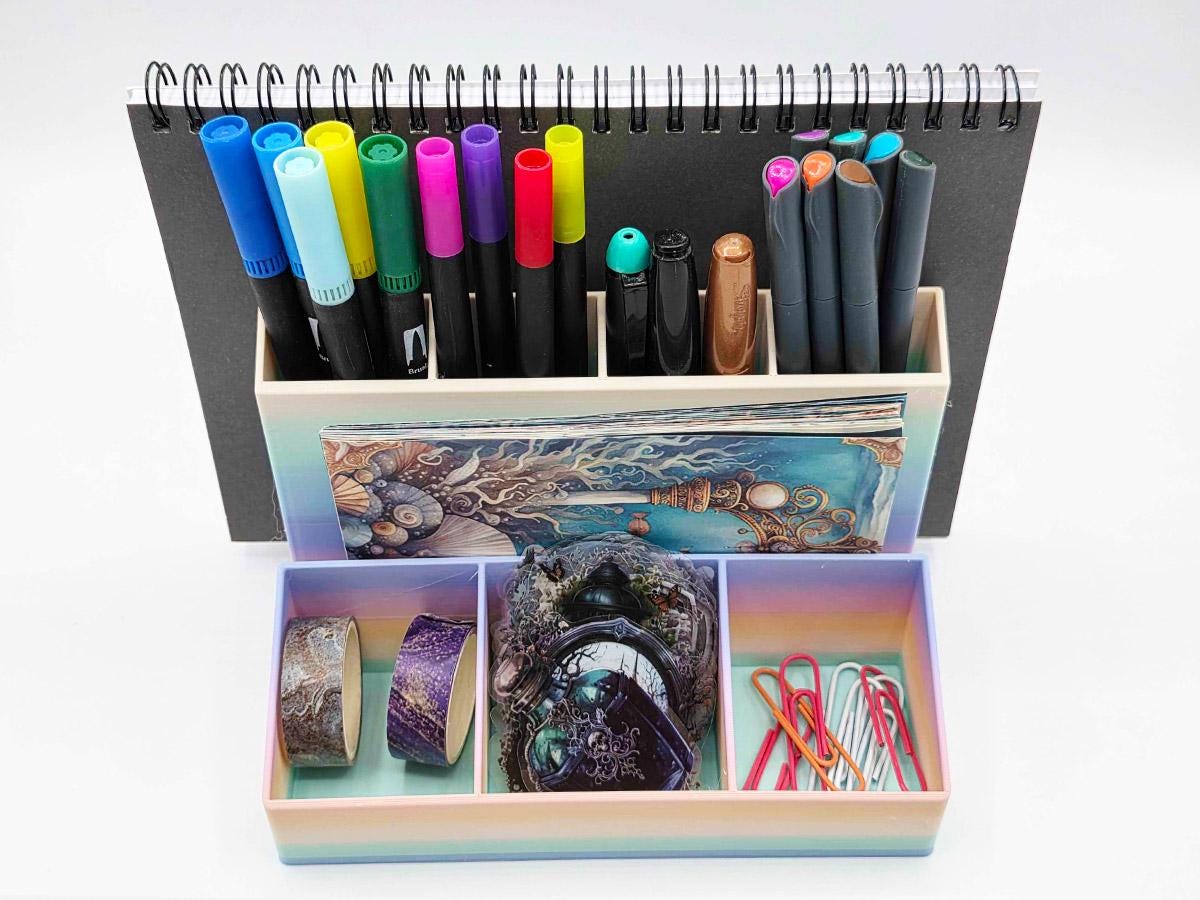 It has a slot in the back for a journal, four containers for pens and markers, a smaller slot designed for stickers, postcards, or sticky notes, and three cubbies in the front that can fit paperclips, washi tape, stickers, or anything small you need to keep organized!
