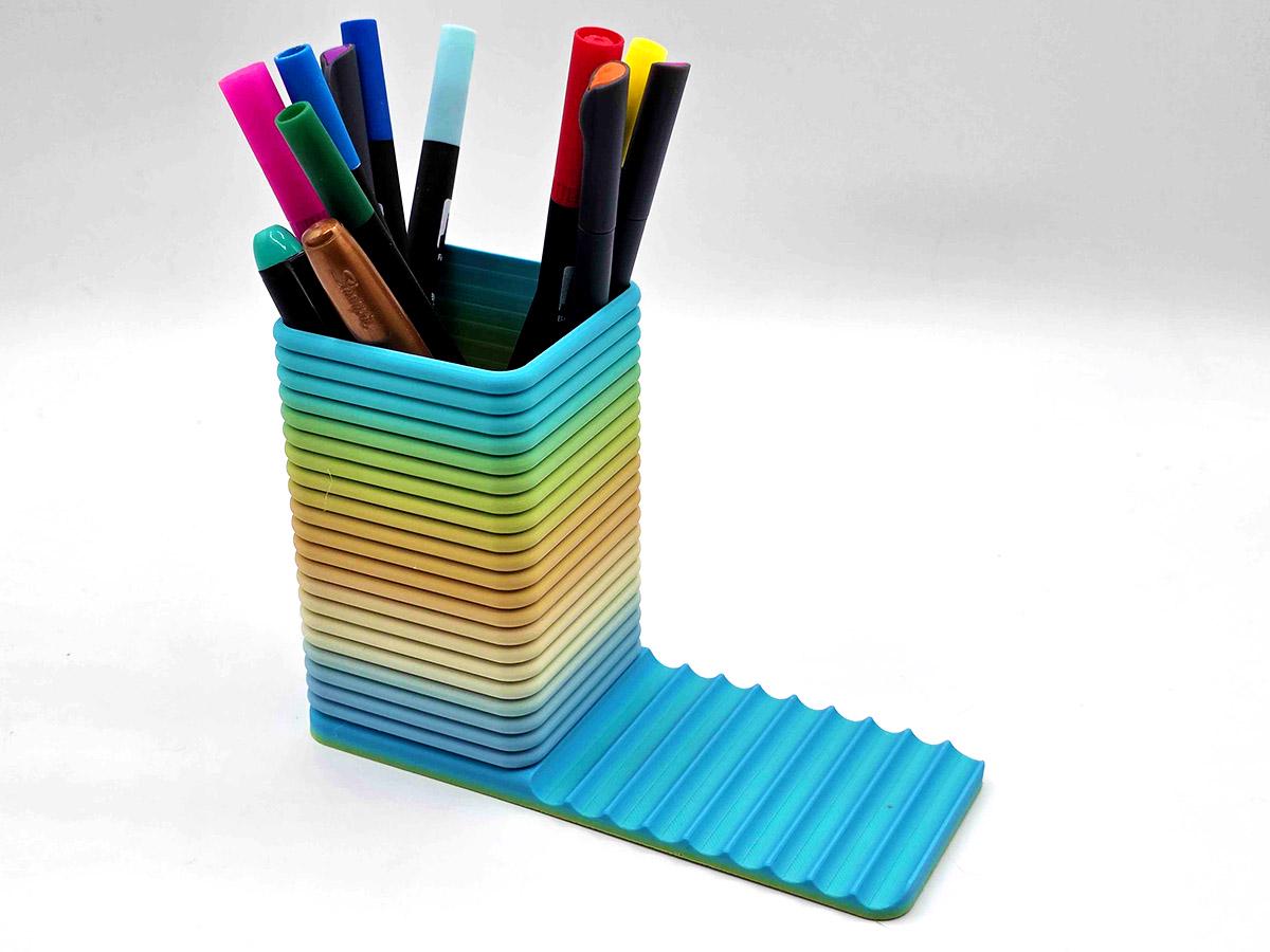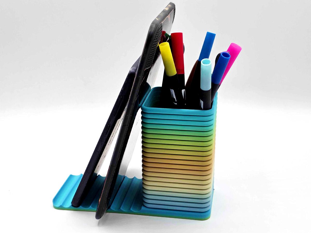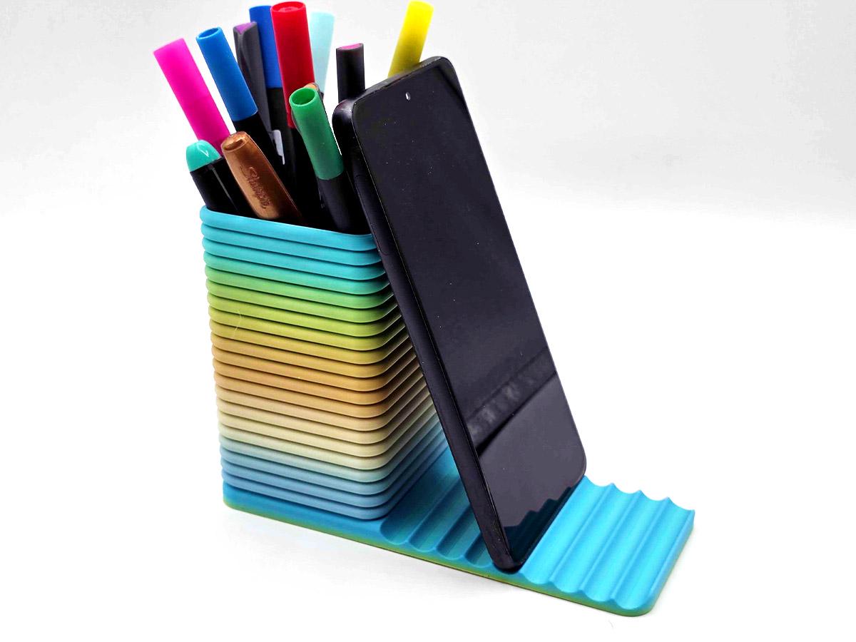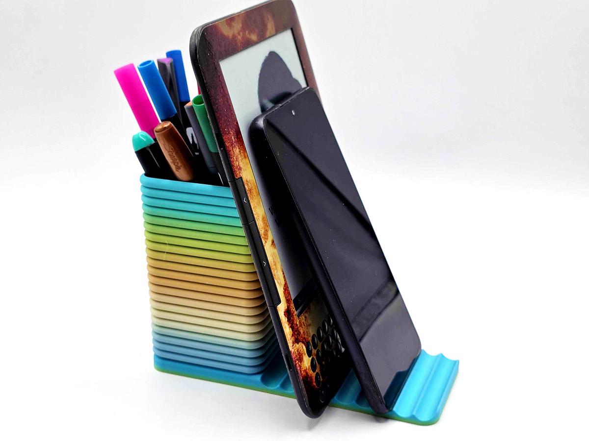 It includes one cup large enough to hold pens, scissors, or other desk-y things, and a grooved stand that makes it easy to prop up your phone, or ereader, or even a small-ish tablet!
