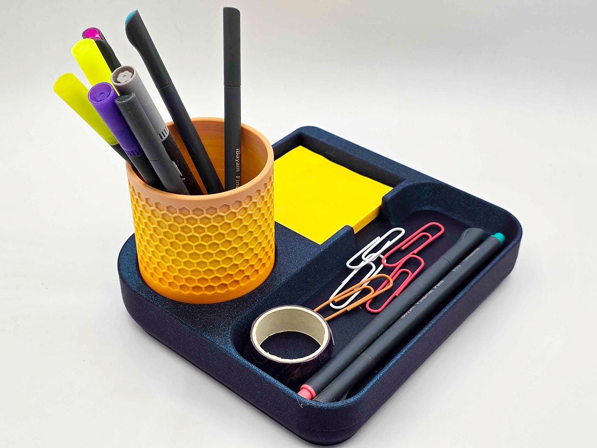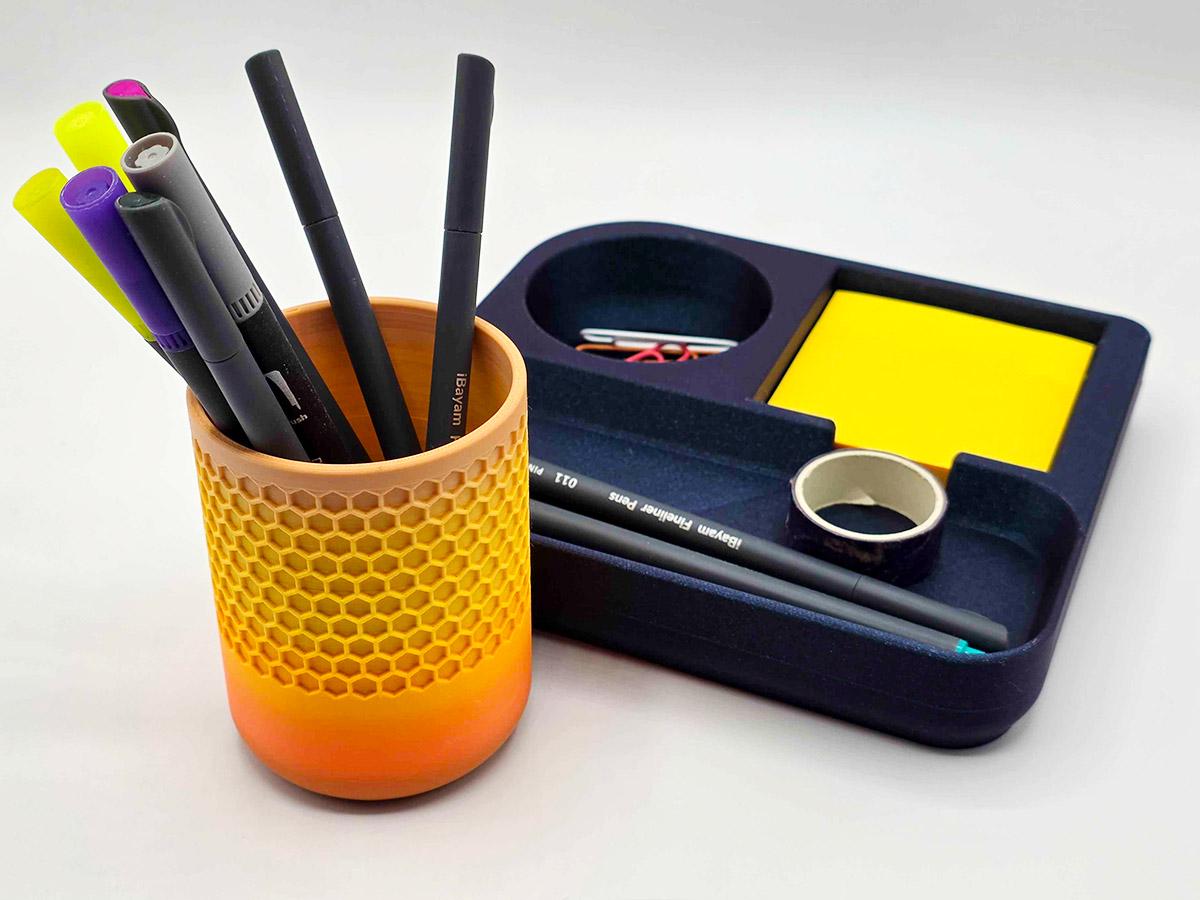 It also has space that perfectly matches the pen cup that comes with it! Printed with a honeycomb pattern, it's pretty and functional!