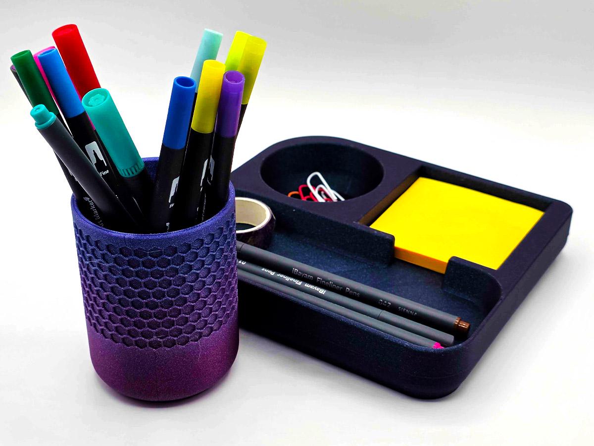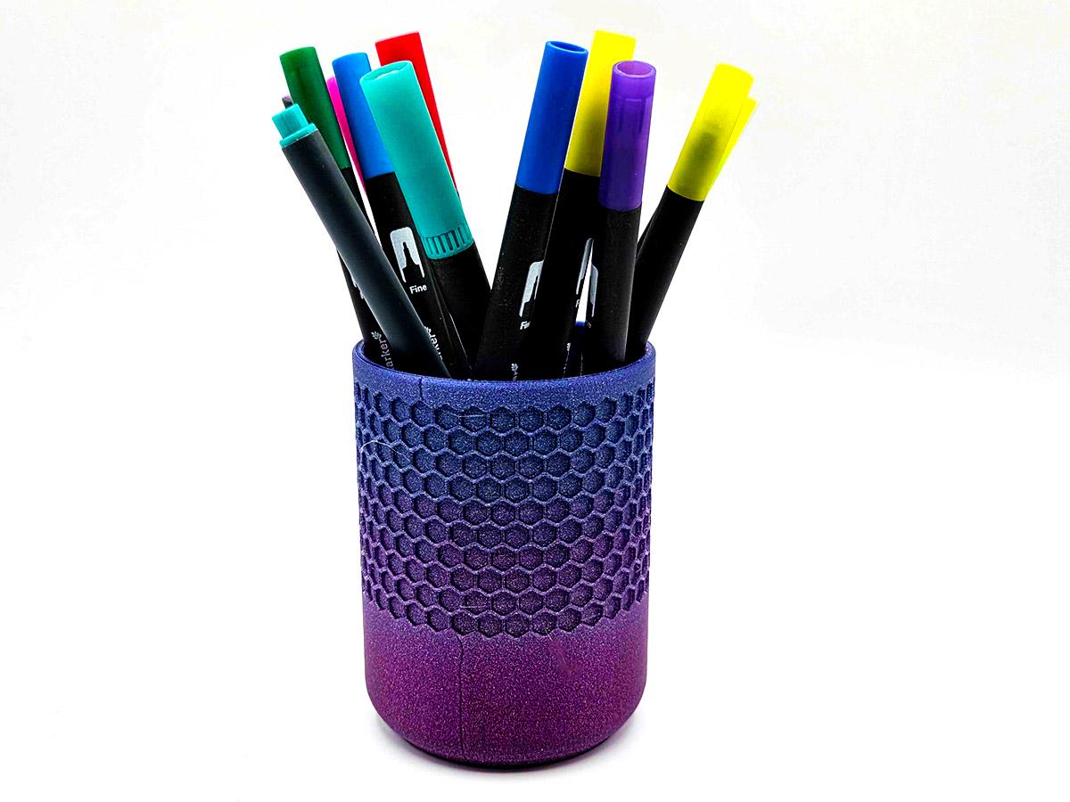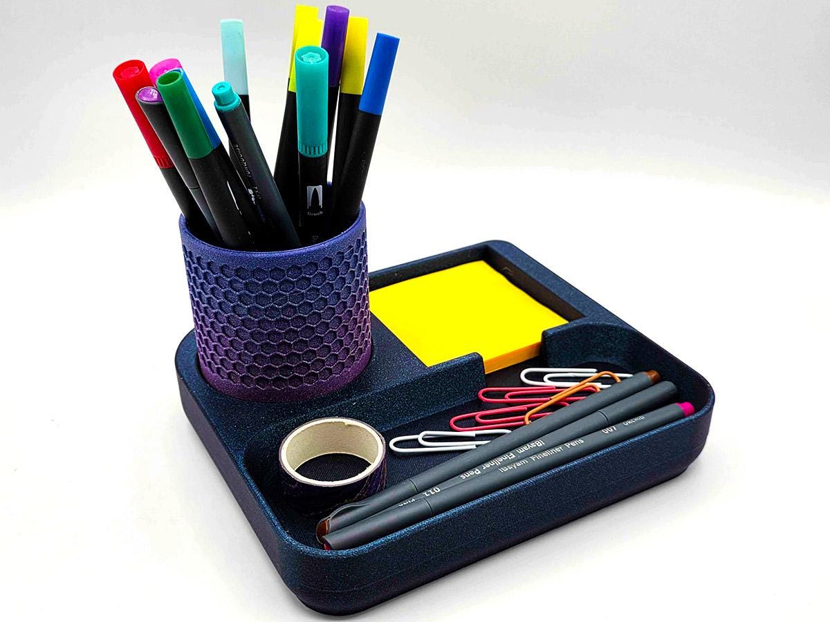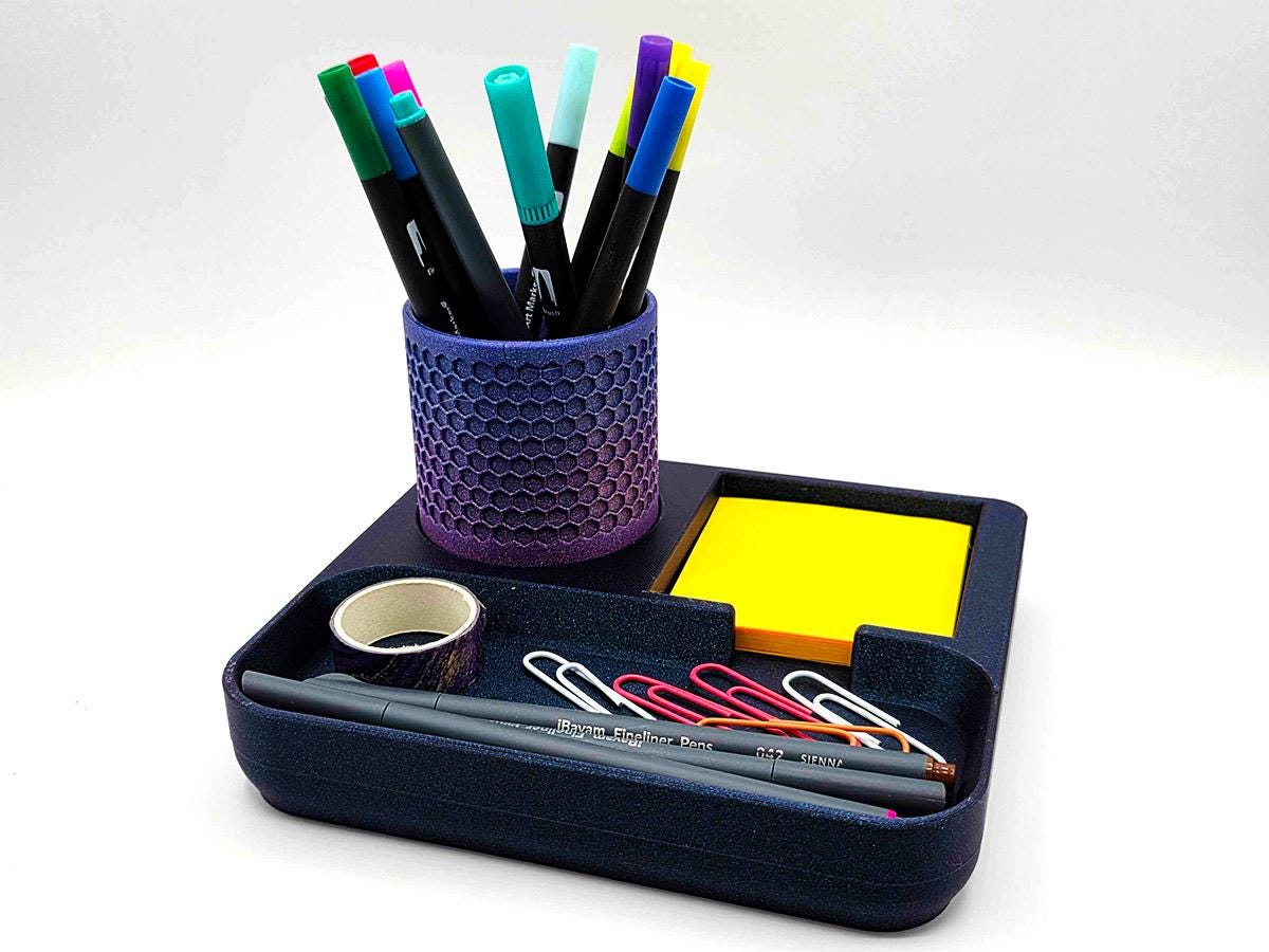 It also has space that perfectly matches the pen cup that comes with it! Printed with a honeycomb pattern, it's pretty and functional!